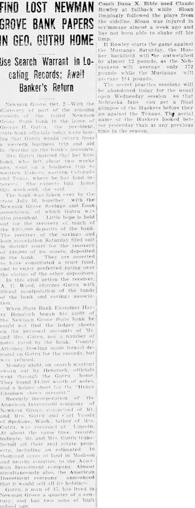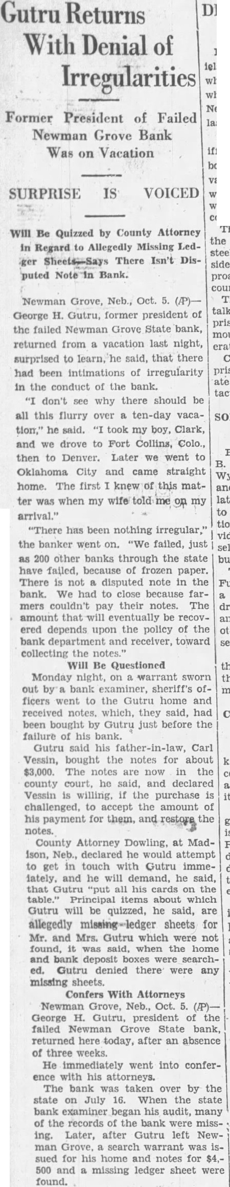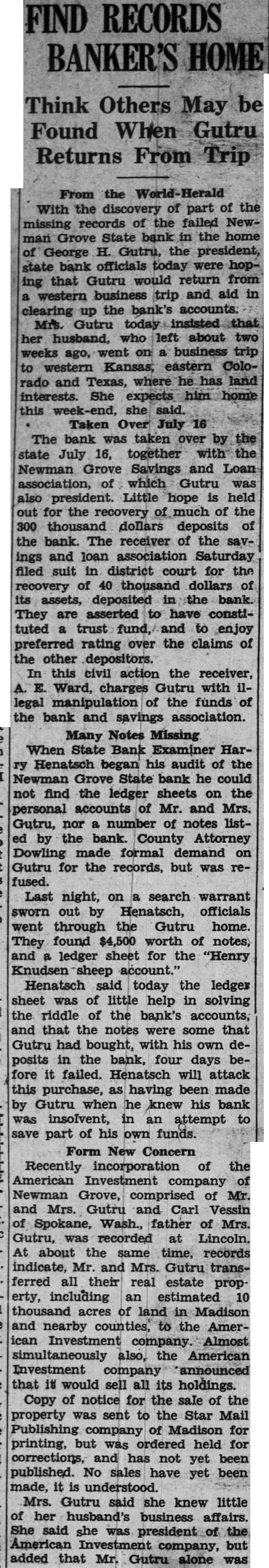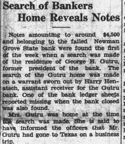 BOTH STATE BANKS ARE TAKEN BANKING DEPARTMENT The Newman Grove State Bank, The Farmers State Bank, and the Security Savings and Loan Association Declared Insolvent by Bank Examiner About six o'clock last night notices were posted the doors of the Newman Grove State Bank and the Farmers State Bank by Lyman C. Sorensen, State Bank Examiner, that the affairs of the bank had been taken over by the state banking department and that a meeting would soon be called of the positors and creditors to consider the advisability of re-organization. This meeting will be held next Friday night. The depositors the Newman Grove State Bank will meet at 7:30 at the new auditorium and the depositors of the Farmers State Bank will meet 8:30 o'clock at the high school assembly room. Both meetings will be addressed by George W. Woods, of Lincoln, the new bank commissioner. This financial crash is the result of condition which has prevailed over the state for the past several years involving especially state banks. When the Nebraska State guaranty fund ceased to function after making extensive drafts on the state banks and the legislature was unable to find solution to the problem, it seriously impaired the standing of many state banks. This, together with the unusual dition of commercial paper during the reconstruction period following the world war has made banking very difficult business. For the past several months there has been gradual withdrawal of deposits although there no run on either bank. The bank examiners were here the most of the past week and though an effort was made Tuesday to prevent the closing of the banks was fruitless. Geo. H. Gutru, president of the State Bank and Olson, president of the Farmers State Bank were in conference with George W. Woods newly appointed Bank examiners at Columbus until evening when it became apparent that nothing could be done Mr. Sorensen returned to Newman Grove and took over both banks. The capital stock of the Newman Grove State Bank is $30,000 with surplus of $10,000. The deposits were around $300,000. The capital stock of the Farmers State Bank is $15,000 with surplus of $6,000 The deposits amount to A law passed by the last legislature provides for re-organization of failed banks by calling meetof the depositors and appointing committee to go over the books and make an appraisal of the value of the commercial paper of the bank. The capital stock and surplus is taken to apply on uncollectible notes. All questionable is put together and an effort per made to collect it. The depositor's money or sufficient amount of it held to offset this paper. New stock must be subscribed and the bank is put into operation again. If this questionable paper is collected or an amount equal to the old deposits less the capital stock and surplus, the depositor's claims will be paid in full. If a re-organization not effecte,d the bank will be placed into the hands of receiver. Newman Grove is left with one bank, The First National, which is strong institution with its deposits well safeguarded by stock of government bonds amounting to many times its capital stock. The deposits in this bank have rapidly grown during the past several months, and it has the implicit confidence of the people. Mr. Sorenson states that practically every bank that has failed since the passing of the new law providing for re-organization has taken advantage of this law and effected re-organization. It is hoped that re-organization of these banks can be made. Some think that if this is done they may be consolidated into one strong banking institution. The closing these banks will only the ness of the town for it will not be long until every busines man affected will be able to arrange new banking facilities. Very exaggeratreports were heard on the streets last night as to the amount of deposits of different individuals the closed banks. One deposit ported to be $45,000 shrunk during the night to $4,000. People should pay no attention to any reports until they are confirmed. The business of the town went along as ual today and stranger coming to town would not know that financial crisis had occurred.