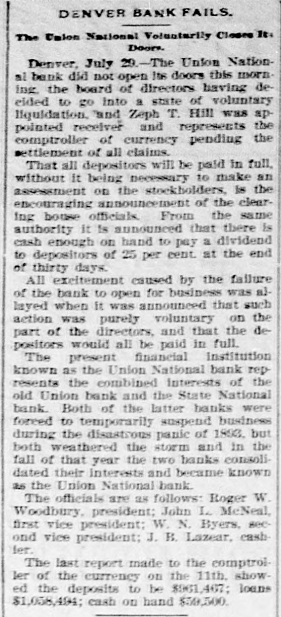 DENVER BANK FAILS. The Union National Voluntarily Closes It. Doors. Denver, July 29.-The Union National bank did not open its doors this morning, the board of directors having decided to go into a state of voluntary liquidation, and Zeph T. Hill was appointed receiver and represents the comptroller of currency pending the settlement of all claims. That all depositors will be paid in full, without it being necessary to make an assessment on the stockholders, is the encouraging announcement of the clearing house officials. From the same authority it is announced that there is cash enough on hand to pay a dividend to depositors of 25 per cent. at the end of thirty days. All excitement caused by the failure of the bank to open for business was allayed when it was announced that such action was purely voluntary on the part of the directors, and that the depositors would all be paid in full. The present financial institution known as the Union National bank represents the combined interests of the old Union bank and the State National bank. Both of the latter banks were forced to temporarily suspend business during the disastrous panic of 1893, but both weathered the storm and in the fall of that year the two banks consolidated their interests and became known as the Union National bank. The officials are as follows: Roger W. Woodbury, president; John L. McNeal, first vice president; W. N. Byers, second vice president; J. B. Lazear, cashler. The last report made to the comptroller of the currency on the 11th, showed the deposits to be $961,467; loans $1,058,494; cash on hand $59,500.