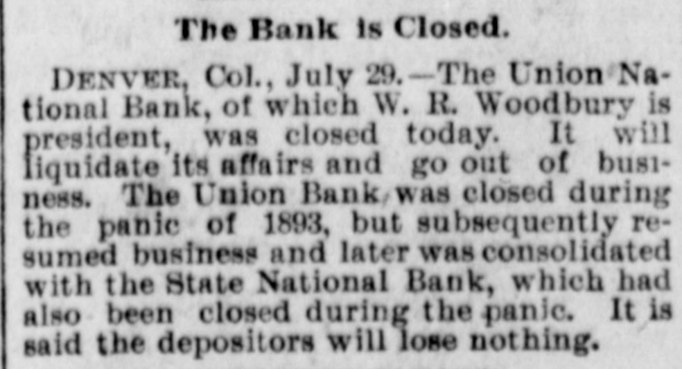 The Bank is Closed. DENVER, Col., July 29.-The Union National Bank, of which W. R. Woodbury is president, was closed today. It will liquidate its affairs and go out of business. The Union Bank was closed during the panic of 1893, but subsequently resumed business and later was consolidated with the State National Bank, which had also been closed during the panic. It is said the depositors will lose nothing.