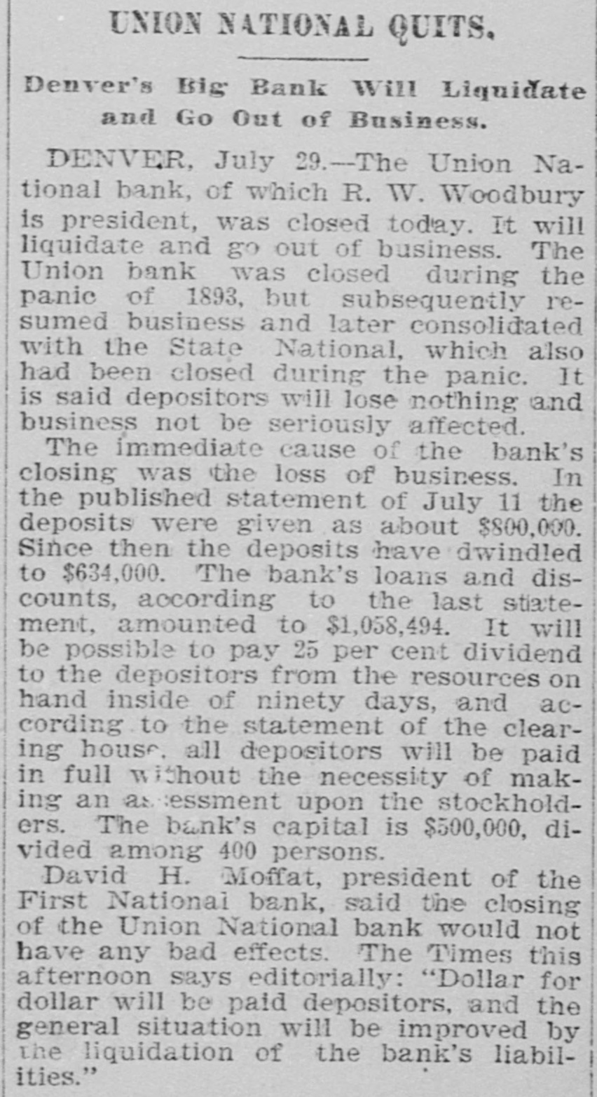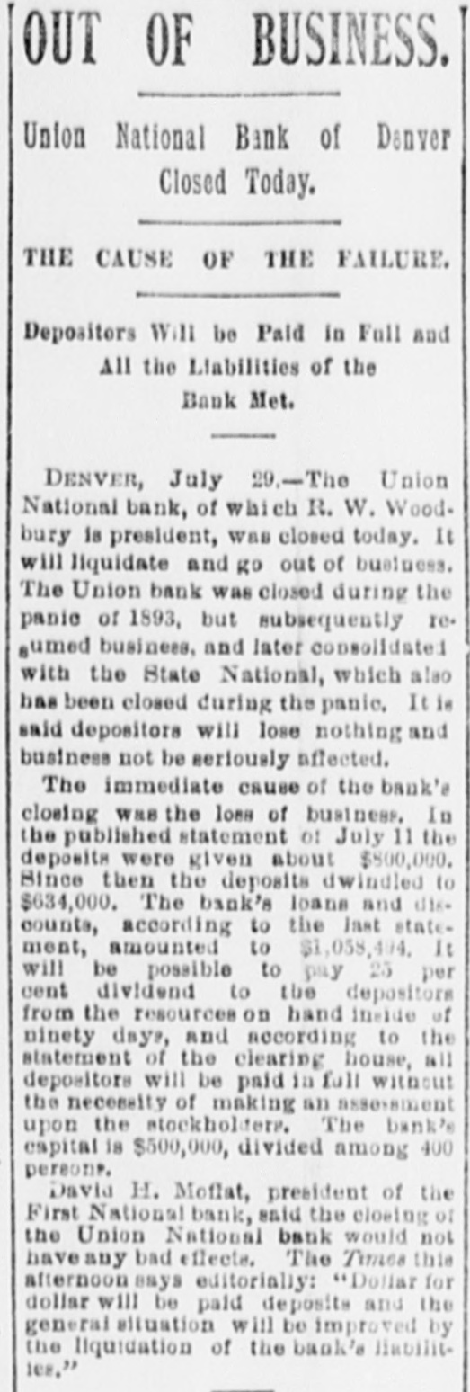 OUT OF BUSINESS. Union National Bank of Denver Closed Today. THE CAUSE OF THE FAILURE. Depositors Will be Paid in Full and All the Liabilities of the Bank Met. DENVER, July 29.-The Union National bank, of which R. W. Woodbury is president, was closed today. It will liquidate and go out of business. The Union bank was closed during the panic of 1893, but subsequently resumed business, and later consolidated with the State National, which also has been closed during the panic, It is said depositors will lose nothing and business not be seriously affected. The immediate cause of the bank's closing was the loss of business. In the published statement 01 July 11 the deposits were given about $800,000. Since then the deposits dwindled to $634,000. The bank's loans and discounts, according to the last statement, amounted to $1,058,494. It will be possible to pay 25 per cent dividend to the depositors from the resources on hand inside of ninety days, and according to the statement of the clearing house, all depositors will be paid in full without the necessity of making an assessment upon the stockholders. The bank's capital is $500,000, divided among 400 persons. David H. Moffat, president of the First National bank, said the closing of the Union National bank would not haveany bad effects. The Times this afternoon says editorially: "Dollar for dollar will be paid deposits and the general situation will be improved by the liquidation of the bank's liabilitles."