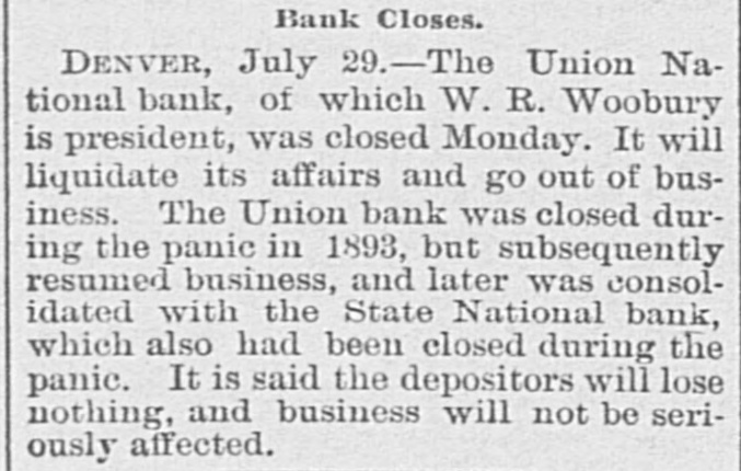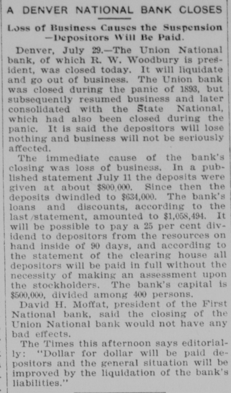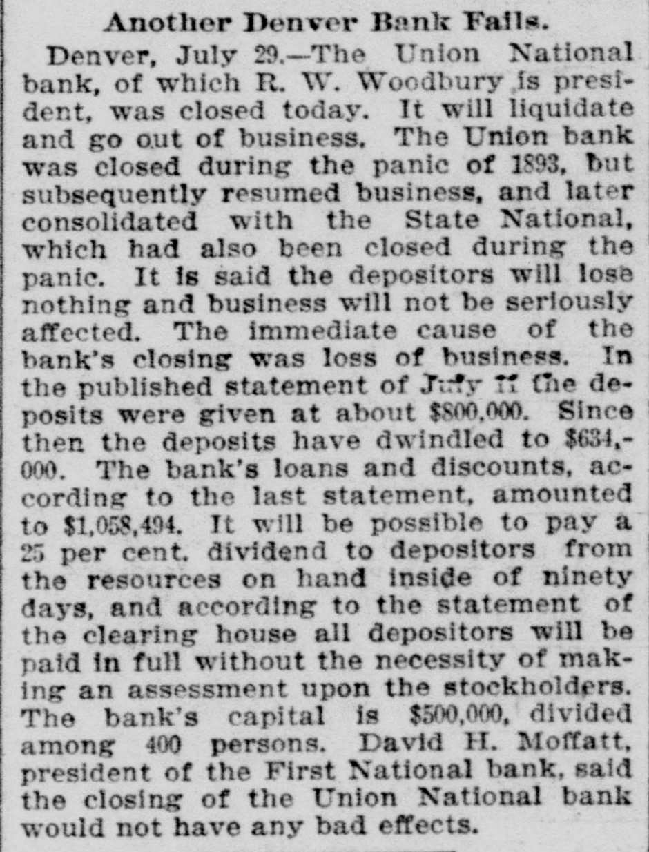 Another Denver Bank Fails. Denver, July 29.-The Union National bank, of which R. W. Woodbury is president, was closed today. It will liquidate and go out of business. The Union bank was closed during the panic of 1893, But subsequently resumed business, and later consolidated with the State National, which had also been closed during the panic. It is said the depositors will lose nothing and business will not be seriously affected. The immediate cause of the bank's closing was loss of business. In the published statement of July If the deposits were given at about $800,000. Since then the deposits have dwindled to $634,000. The bank's loans and discounts, according to the last statement, amounted to $1,058,494. It will be possible to pay a 25 per cent. dividend to depositors from the resources on hand inside of ninety days, and according to the statement of the clearing house all depositors will be paid in full without the necessity of making an assessment upon the stockholders. The bank's capital is $500,000, divided among 400 persons. David H. Moffatt, president of the First National bank, said the closing of the Union National bank would not have any bad effects.