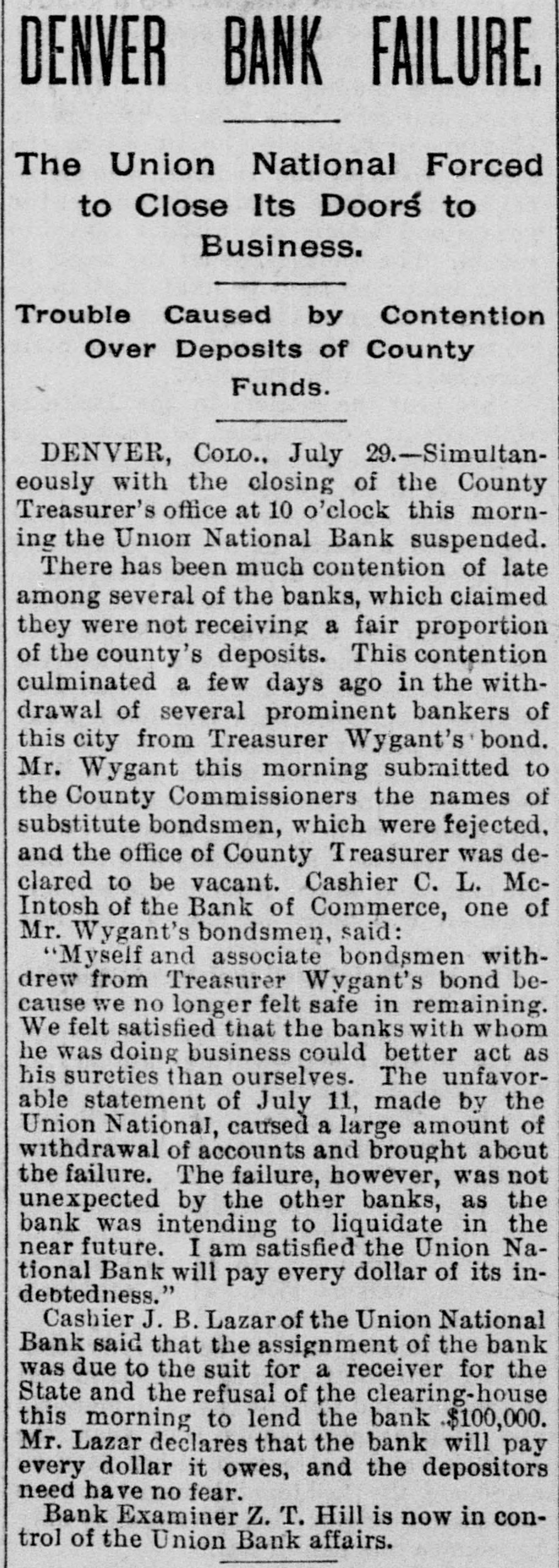 DENVER BANK FAILURE, The Union National Forced to Close Its Doors to Business. Trouble Caused by Contention Over Deposits of County Funds. DENVER, COLO., July 29.-Simultaneously with the closing of the County Treasurer's office at 10 o'clock this morning the Union National Bank suspended. There has been much contention of late among several of the banks, which claimed they were not receiving a fair proportion of the county's deposits. This contention culminated a few days ago in the withdrawal of several prominent bankers of this city from Treasurer Wygant's bond. Mr. Wygant this morning submitted to the County Commissioners the names of substitute bondsmen, which were rejected. and the office of County Treasurer was declared to be vacant. Cashier C. L. McIntosh of the Bank of Commerce, one of Mr. Wygant's bondsmen, said: 'Myself and associate bondsmen withdrew from Treasurer Wygant's bond because we no longer felt safe in remaining. We felt satisfied that the banks with whom he was doing business could better act as his sureties than ourselves. The unfavorable statement of July 11, made by the Union National, caused a large amount of withdrawal of accounts and brought about the failure. The failure, however, was not unexpected by the other banks, as the bank was intending to liquidate in the near future. I am satisfied the Union National Bank will pay every dollar of its indebtedness." Cashier J. B. Lazar of the Union National Bank said that the assignment of the bank was due to the suit for a receiver for the State and the refusal of the clearing-house this morning to lend the bank $100,000. Mr. Lazar declares that the bank will pay every dollar it owes, and the depositors need have no fear. Bank Examiner Z. T. Hill is now in control of the Union Bank affairs.