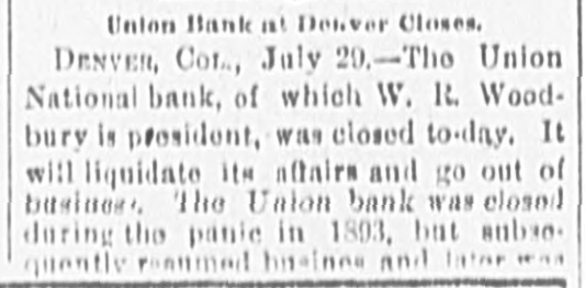 Union Bank at Denver Closes. DENVER, Cora, July 29.-The Union National bank, of which W. R. Woodbury is president, was closed to-day. It will liquidate its aftairs and go out of business The Union bank was closed during the panic in 1803, but subsoquently renumed busines and later ---
