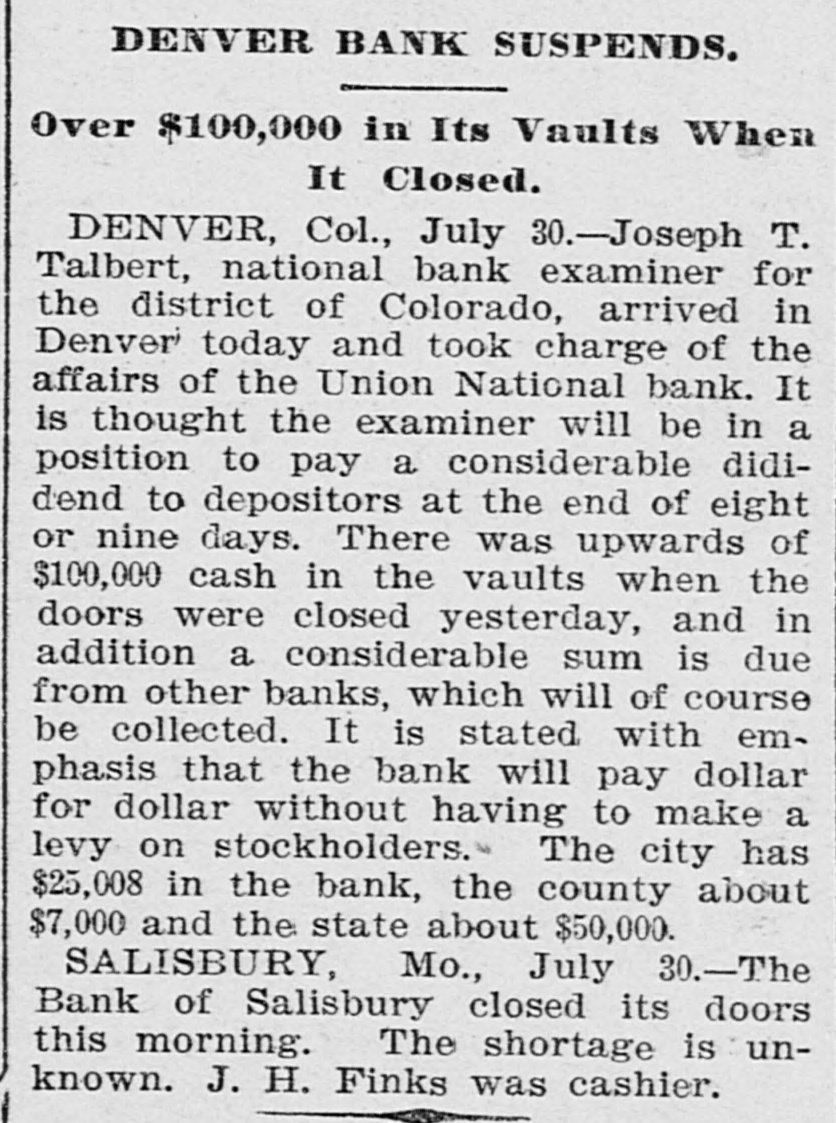 DENVER BANK SUSPENDS. Over $100,000 in Its Vaults When It Closed. DENVER, Col., July 30.-Joseph T. Talbert, national bank examiner for the district of Colorado, arrived in Denver today and took charge of the affairs of the Union National bank. It is thought the examiner will be in a position to pay a considerable dididend to depositors at the end of eight or nine days. There was upwards of $100,000 cash in the vaults when the doors were closed yesterday, and in addition a considerable sum is due from other banks, which will of course be collected. It is stated with emphasis that the bank will pay dollar for dollar without having to make a levy on stockholders. The city has $25,008 in the bank, the county about $7,000 and the state about $50,000. SALISBURY, Mo., July 30.-The Bank of Salisbury closed its doors this morning. The shortage is unknown. J. H. Finks was cashier.