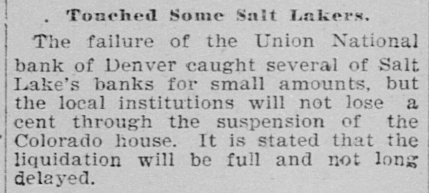 Touched Some Salt Lakers. The failure of the Union National bank of Denver caught several of Salt Lake's banks for small amounts, but the local institutions will not lose a cent through the suspension of the Colorado house. It is stated that the liquidation will be full and not long delayed.