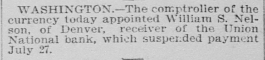 WASHINGTON.-The comptroller of the currency today appointed William S. Nelson, of Denver, receiver of the Union National bank, which suspended payment July 27.