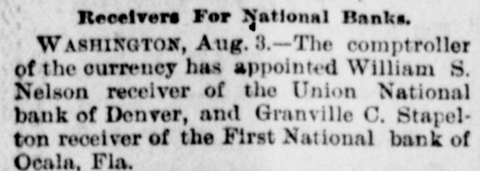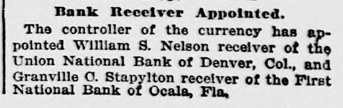 Bank Receiver Appointed. The controller of the currency has appointed William S. Nelson receiver of the Union National Bank of Denver, Col., and Granville C. Stapylton receiver of the First National Bank of Ocala, Fla,