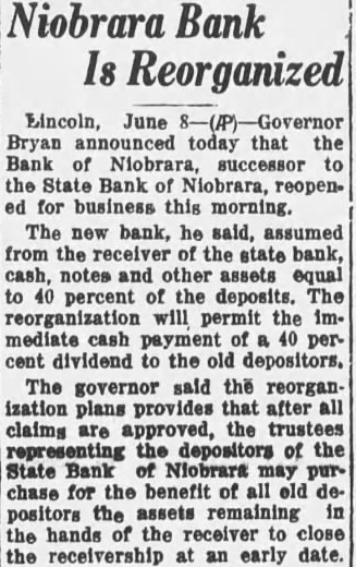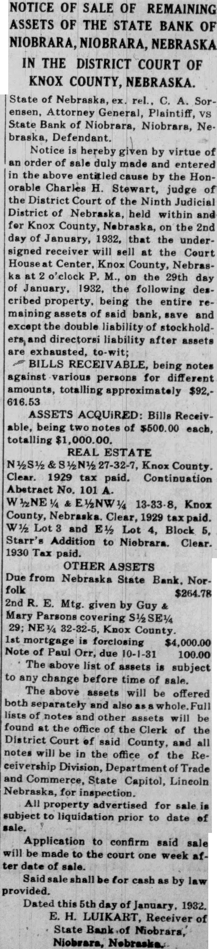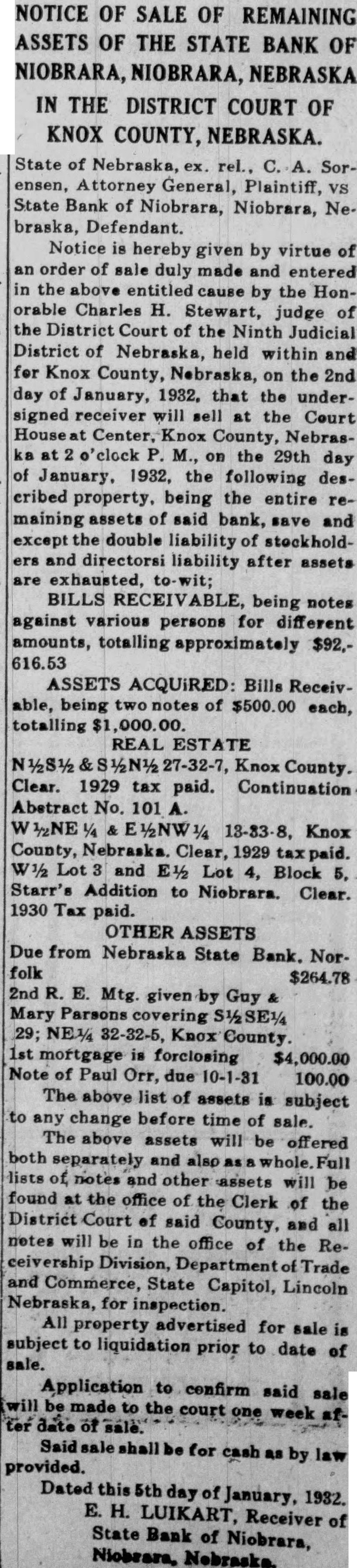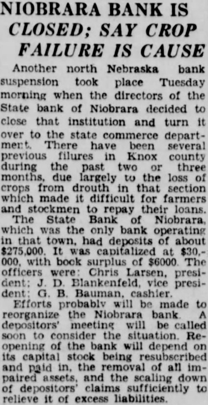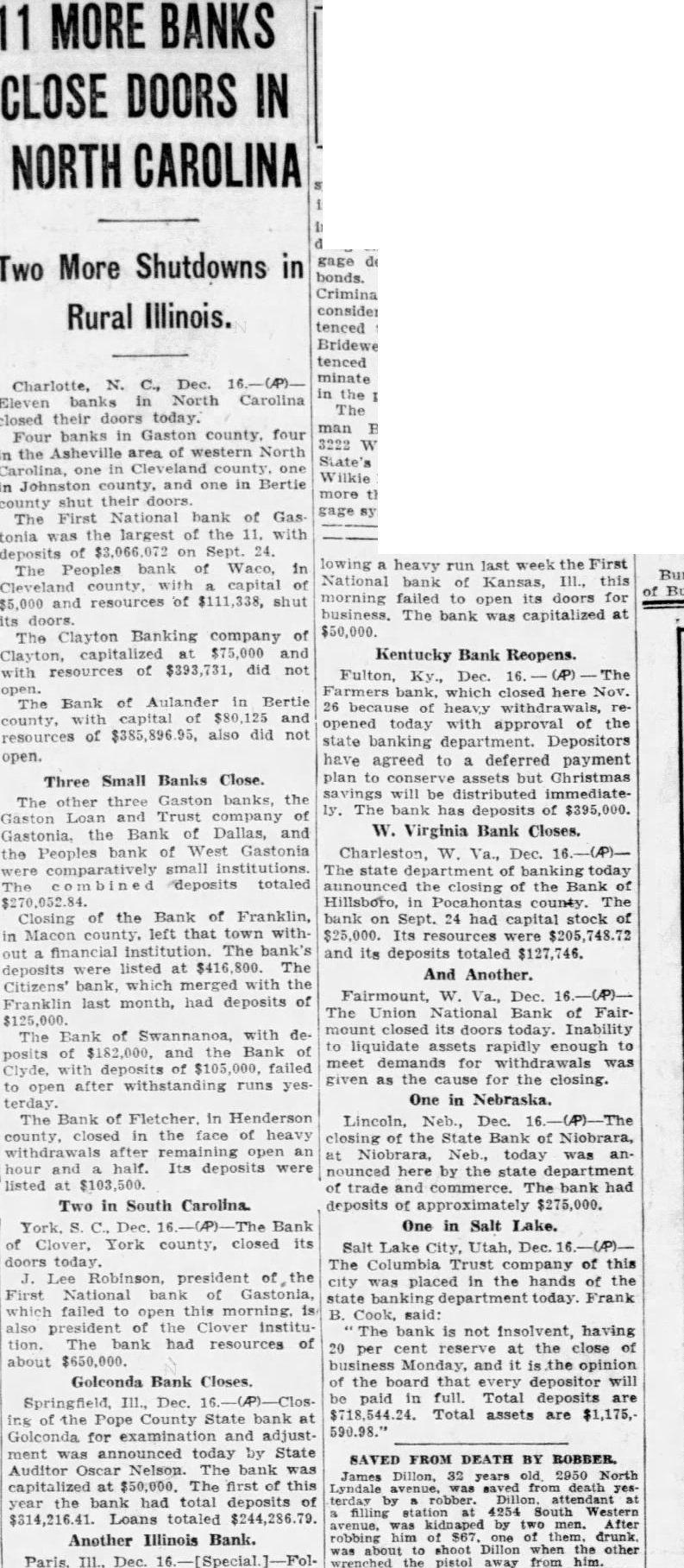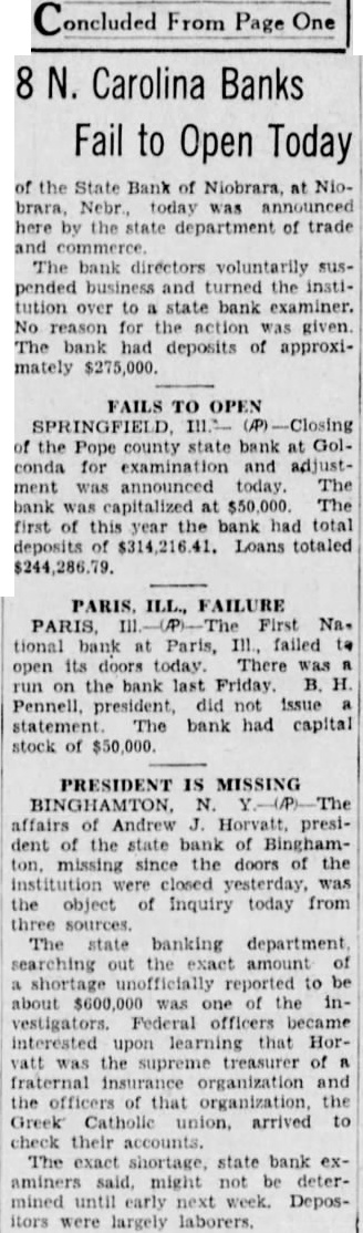 Concluded From Page One 8 Carolina Banks Fail to Open Today the State Bank of Niobrara, at NioNebr. today was here by the department of trade The bank directors voluntarily suspended and turned the institution over to state bank examiner. No reason for action was given. bank had deposits of approximately $275,000. FAILS TO OPEN of the Pope county state bank Golconda for examination and adjustment was announced today. capitalized at $50,000. The first of year the bank had deposits $314,216.41. Loans totaled $244,286.79. PARIS, ILL., FAILURE PARIS, Na. tional at Paris, III., failed its There was run on the bank last Friday. H. Pennell, did not issue statement The bank had capital stock of $50,000. PRESIDENT IS MISSING affairs Andrew president of the state bank of Binghamton, missing since the doors of the institution were closed yesterday, was the object of Inquiry today from sources. The state banking department searching the amount shortage reported to about was one the inFederal officers became interested that Horvatt was the supreme organization and the officers of that organization, the Greek Catholic union, arrived to check their accounts. The exact shortage, state bank examiners might not be determined until early next week. Depositors were largely laborers.