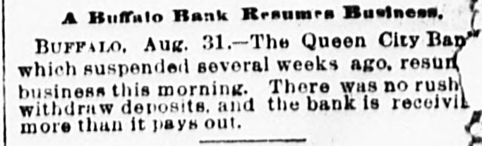 FAILURES. MINNEAPOLIS, Minn., June 26.-The Bank of New England suspended payment Since this morning, temporarily at least. the failure of the State bank on Thursday dethere has been a steady withdrawal of posits. A. J. Blethen, the president of the bank, says that it had considerable money tied up by the Chicago failures. Every depositor, be adds, will be paid in full, of the as the stockholders i suffer instead if the bank does had cash available to the last depositors The bank not of resume. amount the $64,000 on May 4, the time and of but its liabilities were $200,000 that report, somewhat in excess of The capital stock of the is surplus, the amount. $100,000; assets $12,000; undivided bank profits, $4,000; deposits unknown. NESS CITY, Kan., June 26,-The Bank of ComNess City has been closed by Bank missioner Breidenthal, after an unsuccess- its ful attempt to raise money among its eastern stockholders to tide it over bank, present embarrassment. This had $31,300 which had a capital of $40,000, in deposits. When the bank commissioner took charge of it the cash on hand amountd to just $83.55. Mr. Breidenthal says real that the bank was loaded down with estate and bad debts. BUFFALO, N. Y. June 26.-The Queen The City bank of this city has failed. suspension is due to a drain of money bank out the bank for several weeks. The offiof owes depositors over $1,400,000. The will cers are hopeful that the bank reThe liabilities of the bank. accord- The sume. ing to the June report, are $2,323,754. assets are not known. The bank paid out all the money it had, Mr. to dimes, nickels and pennies. even Englehart, one of the directors, said that but the bank had plenty of collateral, found it impossible to realize on it in New the present financial stringency. The York banks would not let them have any The depositors will be paid In money. The state superintendent of banking an examiner here. until when he full. dent, will send recently, resigned The presi- on H. account of ill health, was William Jackson. Since his resignation the bank has been in charge of a committee of its directors. ALBANY, N. Y., June 26.-SuperintendPreston of the state banking department, ent speaking of the Queen City bank failure, said that the report of the condi- re-tion of the bank on June 1st showed sources of $2,351,600 and liabilities of $2,Reference to the amount of cash 351,600. on hand shows that it does not equal the amount of the 10 per cent legal reserve required by law. The report of the examiner for Feburary showed a nominal sur- had plus of $35,600. Poor investments considerable to do with the collapse. CHESTER, Pa., June 26. - The Crum Creek Iron and Steel company has assigned. The liabilities are estimated at $120,000 and the assets at $119,000. The sum of $40,000.is due the company from a former agent. Dullness in trade and threatened suits caused the failure. NEW YORK, June 26.Mann Bros., clothing dealers, today confessed judgment for $55,000. The attorneys for the say that the liabilities are about $300,000, half of which istor borrowed money and the other half for merchandise, The value of the assets is not known. The failure is attributed to several causes, the stringency in the money market being the principal one, as they were unable to meet notes as they mature. NEW YORK, June 26.-The supreme court this morning appointed a receiver for the Mutual Brewing company of College Point. GALLIPOLIS, O., June 26.-The Carl coal works, at Carlton, have assigned. The liabilities are $50,000, and the assets ยฃ7,000. HAMILTON, O., June 26.-Louis Snyder's Sons tonight assigned their four great paper mills at Hamilton, and their real estate and paper warehouses, with contents, in Cincinnati. The assets are over $1,000,000. The liabilities are less than $300,000. The assignment is due to the fact that they were unable to borrow $7, 000 from the banks. It is an old and well established firm. PORT ANGIERS, Wash., June 26.-The First National bank has suspended temporarily. The assets are $142,000, and the liabilities $85,000. SAN FRANCISCO, June 26.-Sands & Gump. extensive dealers in rt goods, have assigned. The liabilities are $14,000 and in the assets $100,000. The stringency money caused the failure. WILMINGTON, O., June -The Sabina bank, a private banking institution in this is county, has suspended. The capital $12,000. No statement was made. BOSTON, June xi-Forty-three banks, represented at the clearing house meeting this morning, voted unanimously in favor of clearing house certificates for payment at the clearing house.