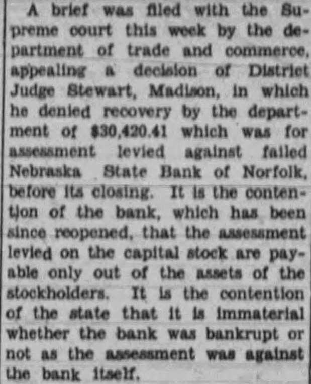 brief was filed with the preme court this week by the partment of trade and commerce, appealing decision of District Judge Stewart, Madison, in which he denied recovery by the department of which was for assessment levied against failed Nebraska State Bank of Norfolk, before closing. the contenof the bank, which has been since reopened, that the assessment on the capital stock are payable only out of the assets of the stockholders. It the contention the state that immaterial whether the bank was bankrupt as the assessment was against the bank itself.