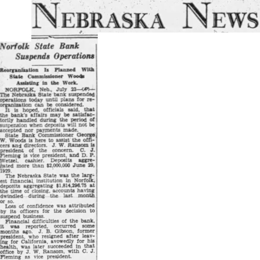 NEBRASKA News Norfolk State Bank Suspends Operations Reorganization Is Planned With State Commissioner Woods Assisting in the Work. The Nebraska State bank suspended operations today until plans for reorganization can be considered. hoped, officials said, that the bank's affairs may be satisfactorily handled during the period of suspension when deposits will not be accepted nor payments made State Bank Commissioner George Woods here to assist the officers and Ransom president the concern. Fleming vice president, and D. (Wetzel, cashier. Deposits aggregated more than $2,000,000 June 29, 1929 The Nebraska State was the largest financial institution Norfolk, deposits aggregating $1,814,296.75 at the time having dwindled during the last month Loss of confidence was attributed its officers for the decision to suspend Financial difficulties of the bank, was reported. occurred some months ago. Gibson, former president who resigned after leaving for California, avowedly for his health. was succeeded in that office by Ransom, with C. Fleming as vice president.