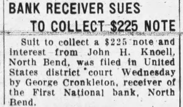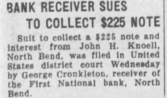 BANK RECEIVER SUES TO COLLECT $225 NOTE Suit to collect $225 note and interest from John H. Knoell, North Bend, was filed in United States district court Wednesday by George Cronkleton, receiver of the First National bank, North Bend.