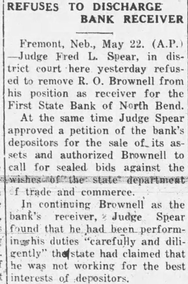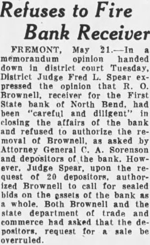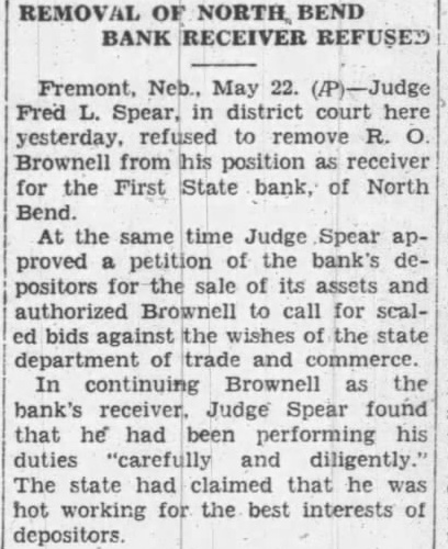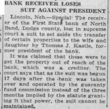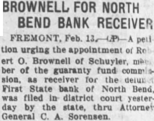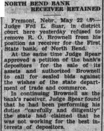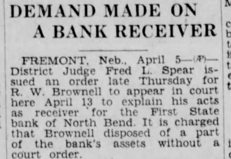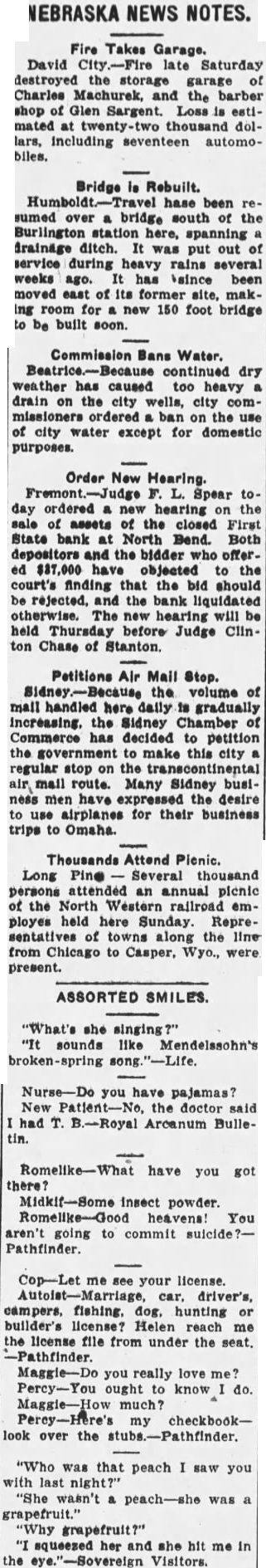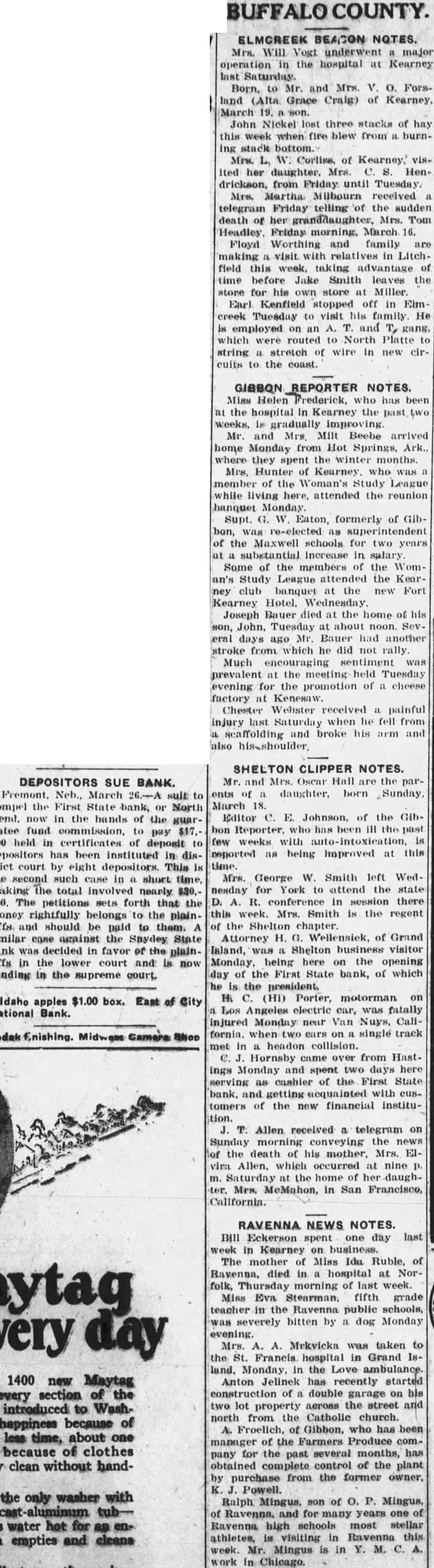 BUFFALO COUNTY. ELMCREEK BEACON NOTES. Mrs. Will Vogt underwent a major operation in the hospital at Kearney last Saturday. Born, to Mr. and Mrs. V. O. Forsland (Alta Grace Craig) of Kearney, March 19. son. John Nickel lost three stacks of hay this week when fire blew from a burning stack bottom. Mrs. L. W. Corlise. of Kearney, visited her daughter, Mrs. C. S. Hendrickson, from Friday until Tuesday. Mrs. Martha Milbourn received telegram Friday telling of the sudden death of her granddaughter, Mrs. Tom Headley Friday morning. March 16. Floyd Worthing and family are making visit with relatives in Litchfield this week, taking advantage of time before Jake Smith leaves the store for his own store at Miller. Earl Kenfield stopped off in Elm creek Tuesday to visit his family He is employed on an A. T. and T, gang, which were routed to North Platte to string a stretch of wire in new circuits to the coast. GIBBON REPORTER NOTES. Miss Helen Frederick, who has been at the hospital In Kearney the past two weeks, is gradually improving Mr. and Mrs. Milt Beebe arrived home Monday from Hot Springs, Ark., where they spent the winter months. Mrs. Hunter of Kearney. who was a member of the Woman's Study League while living here, attended the reunion banquet Supt. G. W. Eaton, formerly of Glbbon, re-elected as superintendent of the Maxwell schools for two years at a substantial increase in salary Some of the members of the Woman's Study League attended the Kearney club banquet at the new Fort Kearney Hotel, Wednesday Joseph Bauer died at the home of his son, John, Tuesday at about noon. Several days ago Mr. Bauer had another stroke from which he did not rally Much encouraging sentiment was prevalent at the meeting held Tuesday evening for the promotion of a cheese factory at Kenesaw. Chester Webster received a painful injury last Saturday when he fell from a scaffolding and broke his arm and also his-shoulder SHELTON CLIPPER NOTES. DEPOSITORS SUE BANK. Mr. and Mrs. Oscar Hall are the parPremont. Neb., March 26.-A suit to ents of daughter. born Sunday compel the First State bank, or North March 18. Bend. now in the hands of the guar- Editor C. E. Johnson, of the Gibantee fund commission, to pay $17,- hon Reporter, who has been ill the past 000 held in certificates of deposit to few weeks with auto-intoxication, is depositors has been instituted in dis- reported as being improved at this trict court by eight depositors. This is time. the second such case in a short time, Mrs. George W. Smith left Wedmaking the total involved nearly $30.- nesday for York to attend the state 000, The petitions sets forth that the D. A. R. conference in there money rightfully belongs to the plain- this week. Mrs. Smith is the regent tiffs and should be paid to them. A of the Shelton chapter. similar case against the Snydey State Attorney H. G. Wellensiek, of Grand bank was decided in favor of the plain- Island, a Shelton business visitor tiffs in the lower court and is now Monday, being here on the opening pending in the supreme court. day of the First State bank, of which he is the president. H. C. (HI) Porter, motorman on Idaho apples $1.00 box. East of City a Los Angeles electric car, was fatally National Bank. injured Monday near Van Nuys, Cali fornin. when two ears on single track Kodak Enishing. Midwess Gamera Shop met in a headon collision. C. J. Hornsby came over from Hastings Monday and spent two days here serving as cashier of the First State bank, and getting acquainted with eustomers of the new financial institution. J. T. Allen received a telegram on Sunday morning conveying the news of the death of his mother, Mrs. Elvira Allen, which occurred at nine p. m. Saturday at the home of her daughter. Mrs. McMahon, in San Francisco, RAVENNA NEWS NOTES. Bill Eckerson spent one day last week in Kearney on business. The mother of Miss Ida Ruble, of Ravenna, died in a hospital at Norfolk, Thursday morning of last week. Miss Eva Stearman, fifth grade teacher in the Ravenna public schools, was severely bitten by a dog Monday evening. Mrs. A. A. Mrkvicka was taken to the St. Francis hospital in Grand Island. Monday, in the Love ambulance. Anton Jelinek has recently started construction of a double garage on bis two lot property aeross the street and north from the Catholic church. A. Froelich, of Gibbon, who has been manager of the Farmers Produce company for the past several months, has obtained complete control of the plant by purchase from the former owner, K. J. Powell. Ralph Mingus. son of O. P. Mingus, of Ravenna, and for many years one of Ravenna high schools most stellar athletes, is visiting in Ravenna this week. Mr. Mingus is in Y. M. C. A. work in Chicago