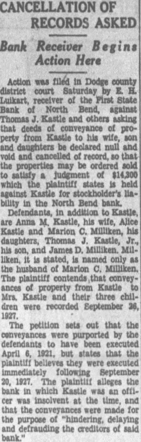 LIGHTNER RETIRES FROM BANK SUIT (Continued from Page One) ceiver matter. The conference between Attorney Beynon and Judge Lightner was not in open court. Another objection made by Beynon to Lightner's participation in based on the fact that the case was to the disLightner was appointed bench by Governor Bryan trict during previous administration. Other cases in which the receivership matter has been heard have come before judges whom Bryan had appointed, Beynon charged, and he believed these judges should be dis qualified The hearing today is to decide the right of Governor Bryan in his attempt to transfer receiverships of failed banks in the state to E. Luikart. newly appointed secretary of trade and of the commerce after he had discharged Clarence Bliss, who was the republican appointee of Governor Weaver as head of the department, and who still holds his appointment by the district courts of the state as the receiver of 200 failed banks. The governor claims that receivof the banking erships are part department and that they are unjurisdiction though receivder his ers are appointed by the courts. There is said to be some contention on the right of the legislature to tell whom they must appoint This is mainly the to contention in the present hearing. Bliss has indicated he will not the transfer of the receiveroppose the applications for ships as long as entered and handled transfers are but he in the regular claims the governor does not have to discharge him from his the right official capacity through the court's appointment. The banks involved in this hearing include the First State bank of North Bend; the Scribner State: Dodge State and the Snyder State bank, all of Dodge county and the Farmers State bank of Belgrade, Boone State bank; Farmers State State bank of Chapman State, Clarks State, Farmers State bank of Farmers State of GenFullerton,
