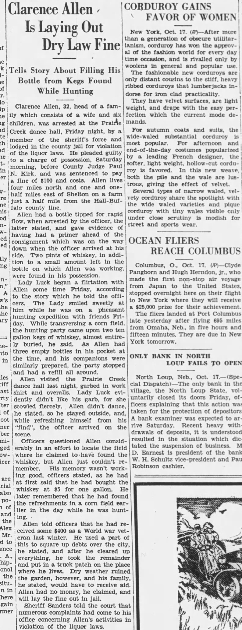 Clarence Laying Dry Tells Story About Filling His Bottle from Kegs Found While Hunting Clarence Allen, 32, head of weight, and drape with the easy perily which consists of wife and six fection which the current mode children, was arrested at the Prairie mands. For autumn coats and suits, the Creek dance hall, Friday night, by substantial corduroy member of the sheriff's force and most popular. For afternoon and lodged the county for violation popularized the liquor laws. He pleaded guilty leading French designer, the charge of possession, Saturday softer, light weight, hollow-cut cordumorning, before County Judge Paul roy favored. In this new weave, Kirk, and was sentenced pay both the pile and the wale are fine of $100 and costs. Allen lives trous, giving the effect of velvet. four miles north and and Several types of narrow waled, half miles east of Shelton farm corduroy share the spotlight with half mile from the the wide waled varieties and pique county corduroy with tiny wales visible only Allen had bottle tipped for rapid under close scrutiny modish for flow, when arrested by the officer, the street and sports wear. latter stated, and gave evidence of having had primer ahead of the OCEAN FLIERS consignment which was on the way down when the officer arrived at his REACH COLUMBUS side. Two pints of whiskey, in addition to small amount left in the Columbus, Oct. 17. bottle on which Allen was working, Pangborn and Hugh Herndon, who found his possession. made the first non-stop air voyage Lady Luck began flirtation with from Japan to the United States, Allen some time Friday, according stopped overnight here on their flight to the story which he told the offito New York where they will receive cers. The Lady smiled sweetly prize for their achievement. him while he was on pheasant The fliers landed at Port Columbus hunting expedition with friends Frilate yesterday after flying 695 miles day. While transversing corn field. from Omaha, Neb., in five hours and the hunting party came upon two ten fifteen minutes. They are due in New gallon kegs of whiskey, almost entireYork tomorrow. buried, he said. As Allen had three empty bottles in his pocket ONLY BANK IN NORTH the time, and his companions were LOUP FAILS TO OPEN similarly prepared, the party stopped and had refill all around. North Loup, Neb., Oct. Allen visited the Prairie Creek cial only bank in the dance hall last night, garbed in work village, the North Loup State, volshirt and Lady Luck untarily closed its doors Friday, dently didn't like his garb, for she ficers explaining that this action scowled fiercely. Allen didn't dance, taken for the protection of depositors. he stated, so he stayed outside, and, bank examiner was expected to while refreshing himself from his rive Saturday. Recent heavy with"find", the officer arrived on the drawals of deposits, it is understood, scene. resulted in the situation which dicOfficers questioned Allen considtated the suspension of business. M. erably in an effort to locate the field Earnest is president of the bank, where he claimed to have found the Schultz vice-president and Paul whiskey, but Allen just couldn't Robinson cashier. member. His wasn't working good, officers stated, he had first said that he had bought the whiskey at $5 for one gallon. He later remembered that he had found the refreshments in corn field earlier in the day while he was hunting. Allen told officers that he had received $400 as World war veteran last winter. He used part of this to square up debts over the city, he stated, and after he cleared up everything, he took the remainder and put in truck patch on the place where he lives. Dry weather ruined the garden, however, and his family, he stated, would have to receive aid. Allen had no money, he claimed, and will lay the fine out in jail. Sheriff Sanders told the court that complaints had come to his office concerning Allen's activities in violation of the liquor laws.