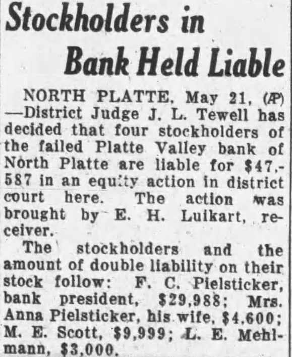 in Bank Held Liable NORTH PLATTE. May 21. (AP) District Judge Tewell has decided that four stockholders of the failed Platte Valley bank North Platte are liable for $47. 587 in an equity action in district court The action was brought by E. H. Luikart, receiver. The stockholders and the amount double their stock follow: bank president, Mrs. Anna Pielsticker. Scott, $9,999; L. E. Mehlmann, $3,000.