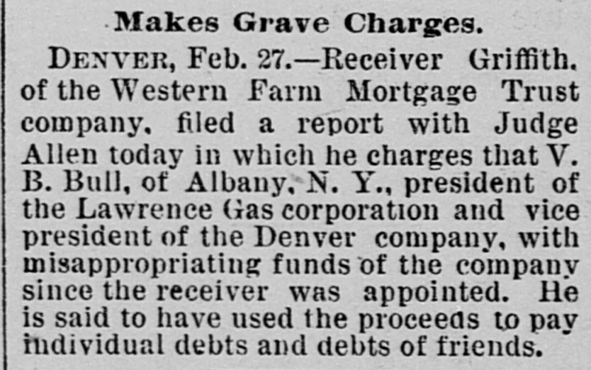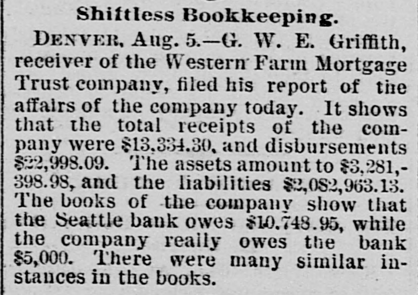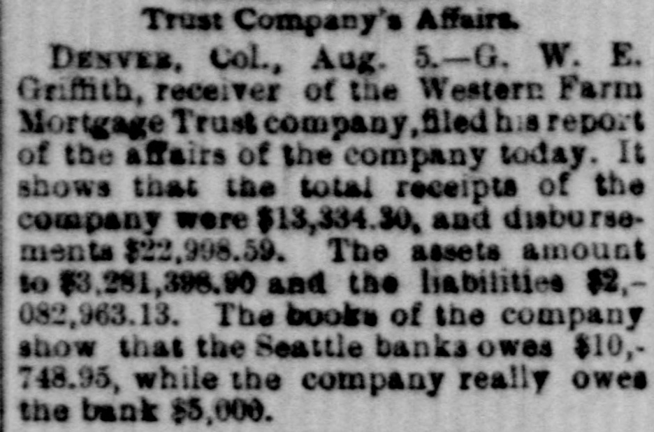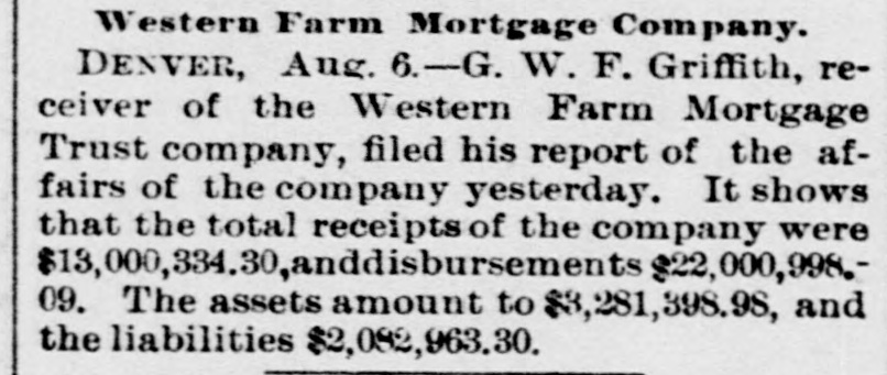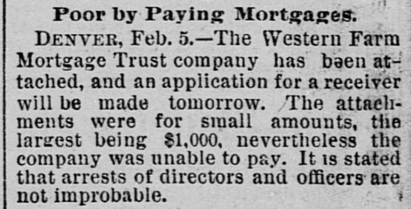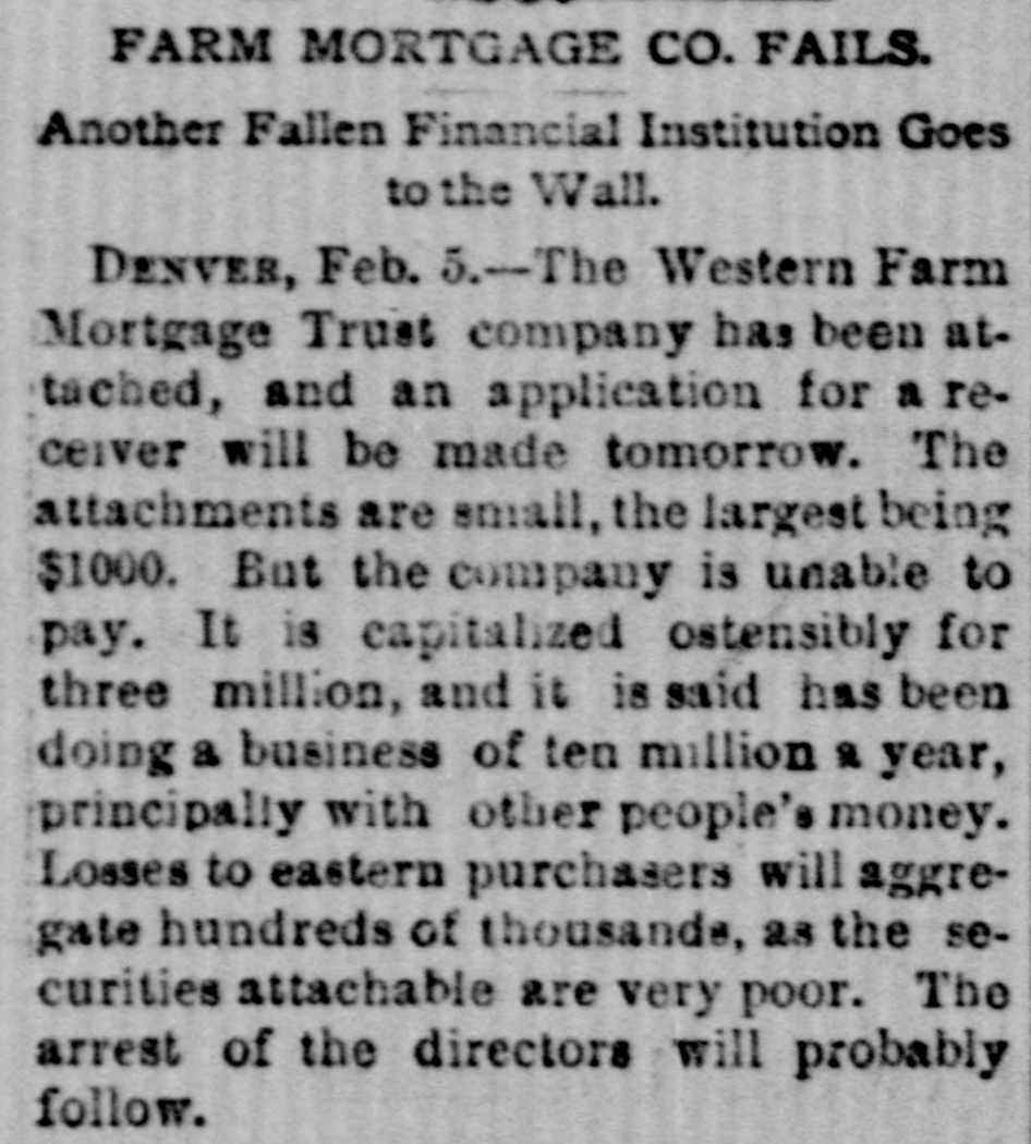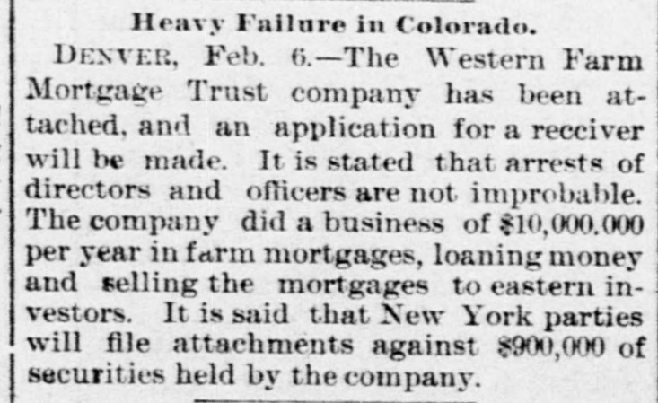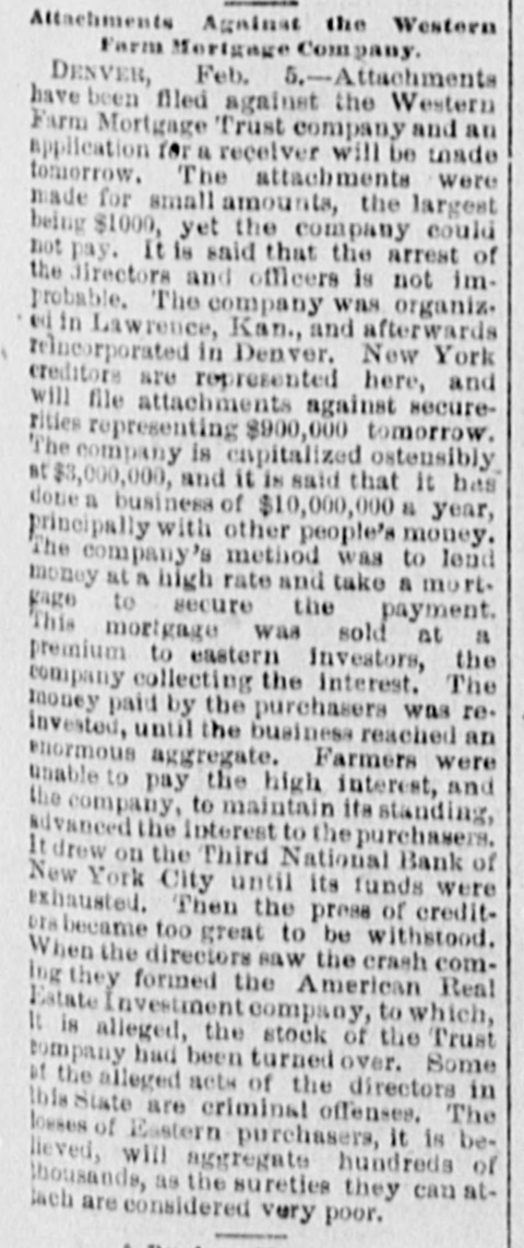 Attachments Against the Western Form Mortgage Company. Denver, Feb. 5.-Attachments have been filed against the Western Farm Mortgage Trust company and an application for a receiver will be tosde tomorrow. The attachments were made for small amounts, the largest being $1000, yet the company could not pay. It is said that the arrest of the directors and officers is not improbable. The company was organiz. ed in Lawrence, Kan., and afterwards reincorporated in Denver. New York creditors are represented here, and will file attachments against securerities representing $900,000 tomorrow. The company is enpitalized ostensibly at $3,000,000, and it is said that it has done: a business of $10,000,000 a year, principally with other people's money. The company's method was to lend money at a high rate and take & mort. gage to secure the payment. This mortgage was sold at a premium to eastern investors, the company collecting the interest. The money paid by the purchasers was reinvested, until the business reached an enormous aggregate. Farmers were unable to pay the high interest, and the company, to maintain its standing, advanced the interest to the purchasers. It drew on the Third National Bank of New York City until its funds were exhausted. Then the press of credits became too great to be withstood. When the directors saw the crash comIng they formed the American Real Estate Investment company, to which, It is alleged, the stock of the Trust tompany had been turned over. Some DE the alleged acts of the directors in lbis State are criminal offenses. The losses of Eastern purchasers, it is believed, will aggregate hundreds of thousands, as the sureties they can attach are considered very poor.