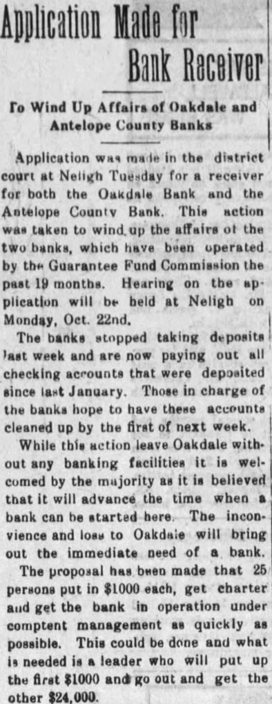 Geo. I. Parker of New Castle, state bank commissioner for this district, was appointed receiver for the Oakdale and Antelope County banks Monday L. O. Schoenthal will have charge of collecting notes due the banks. Chas Stone will also be here at times to at tend to business relative to the banks The work of winding up the affairs of the banks will not require the full tim. of any of these men and they will only be in Oakdale when needed here. Miss Ruth Herrmann will be at the Oakdale Bank to receive and file claims. De positors nave until the 8th of Decem ber to file claims.