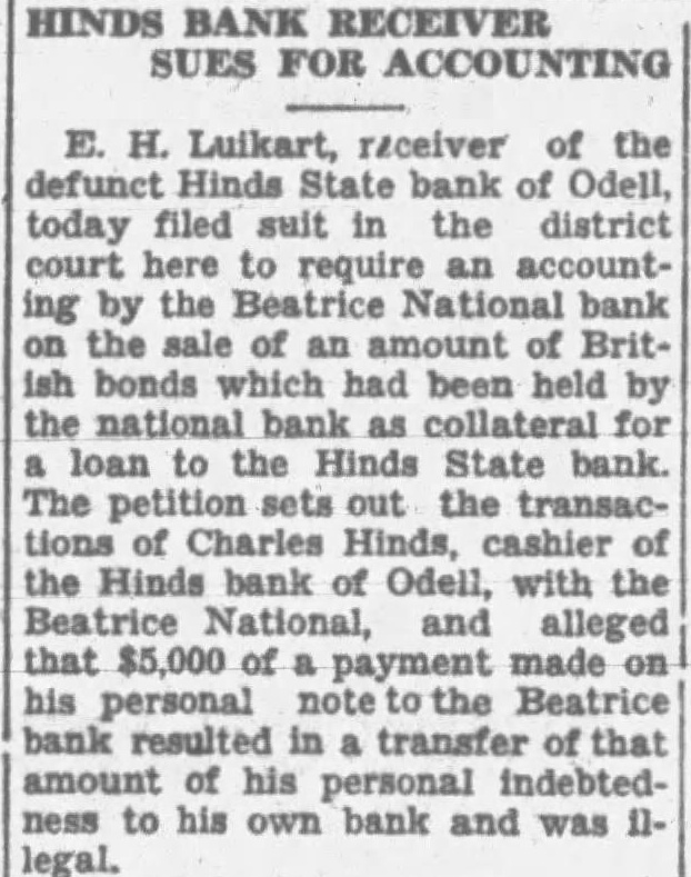 HINDS BANK RECEIVER SUES FOR ACCOUNTING E. H. Luikart, receiver of the defunct Hinds State bank of Odell, today filed suit in the district court here to require an accounting by the Beatrice National bank the sale of an amount Britbonds which had been held the national bank collateral for loan to the Hinds State bank. The petition sets out the transactions Charles Hinds, cashier of the Hinds bank of Odell, with the Beatrice National, and alleged that $5,000 of payment made on his personal the Beatrice bank resulted in transfer of that amount of his personal indebtedness to his own bank and was legal.
