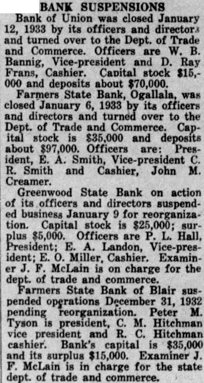 BANK SUSPENSIONS Bank of Union was closed January 12, 1933 by its officers and directors and turned over to the Dept. of Trade and Commerce. Officers are W. B. Bannig, Vice-president and D. Ray Frans, Cashier. Capital stock $15,000 and deposits about $70,000. Farmers State Bank, Ogallala, was closed January 6, 1933 by its officers and directors and turned over to the Dept. of Trade and Commerce. Capital stock is $35,000 and deposits about Officers are: President, E. A. Smith, Vice-president C. R. Smith and Cashier, John M. Creamer. Greenwood State Bank on action of its officers and directors suspended business January 9 for reorganization. Capital stock is $25,000; surplus $5,000. Officers are P. L. Hall, President; E. A. Landon, Vice-president; E. O. Miller, Cashier. Examiner J. F. McLain is on charge for the dept. of trade and commerce. Farmers State Bank of Blair suspended operations December 31, 1932 pending reorganization. Peter M. Tyson is president, C. M. Hitchman vice president and R. C. Hitchman cashier. Bank's capital is $35,000 and its surplus $15,000. Examiner J. F. McLain is in charge for the state dept. of trade and commerce.
