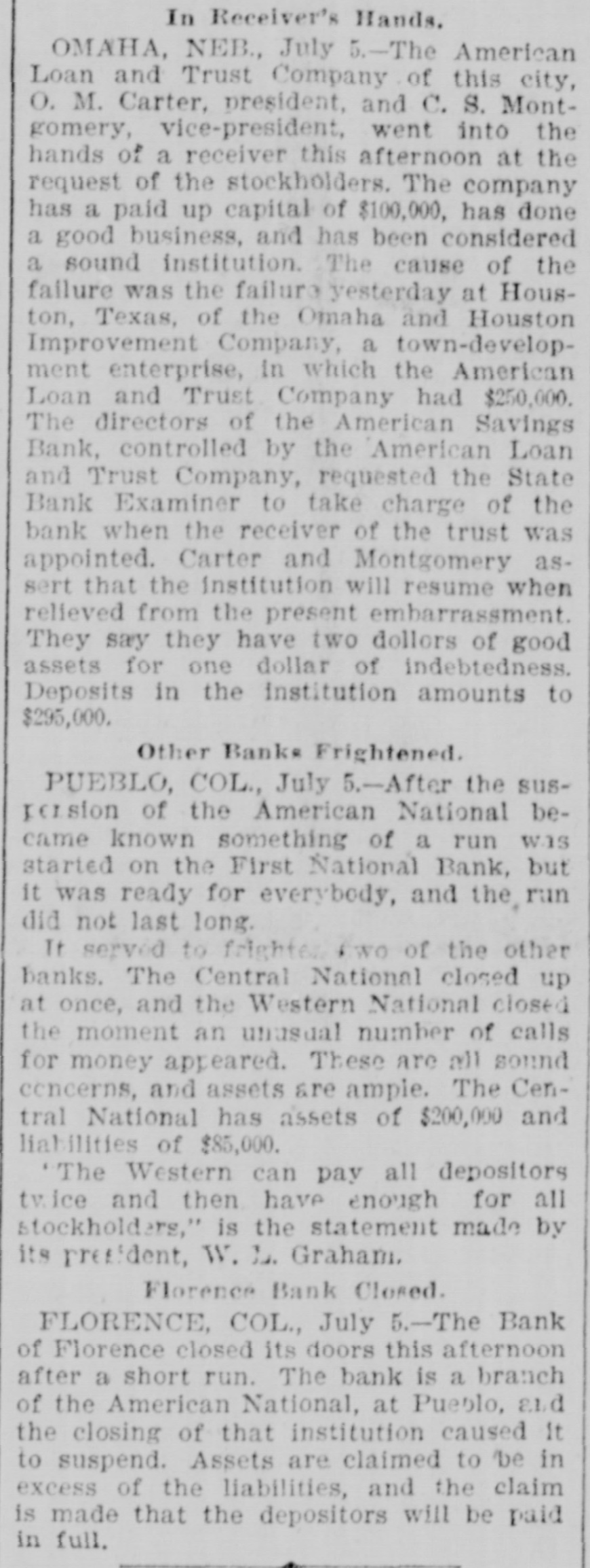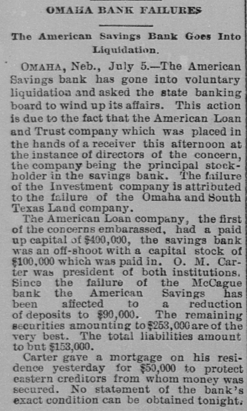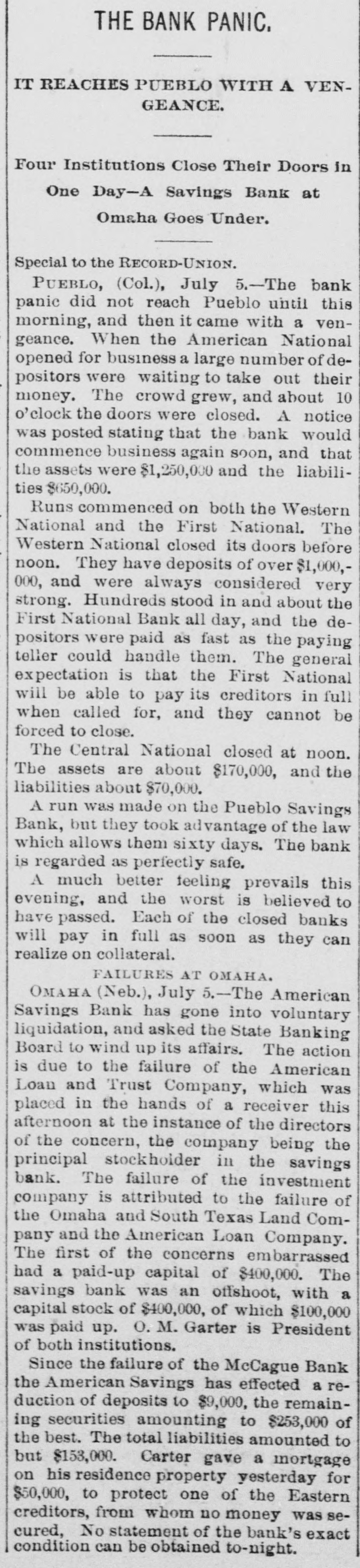 THE BANK PANIC. IT REACHES PUEBLO WITH A VENGEANCE. Four Institutions Close Their Doors in One Day-A Savings Bank at Omaha Goes Under. Special to the RECORD-UNION. PUEBLO, (Col.), July 5.-The bank panic did not reach Pueblo until this morning, and then it came with a vengeance. When the American National opened for business a large number of depositors were waiting to take out their money. The crowd grew, and about 10 o'clock the doors were closed. A notice was posted stating that the bank would commence business again soon, and that the assets were $1,250,000 and the liabilities $650,000. Runs commenced on both the Western National and the First National. The Western National closed its doors before noon. They have deposits of over $1,000,000, and were always considered very strong. Hundreds stood in and about the First National Bank all day, and the depositors were paid as fast as the paying teller could handle them. The general expectation is that the First National will be able to pay its creditors in full when called for, and they cannot be forced to close. The Central National closed at noon. The assets are about $170,000, and the liabilities about $70,000. A run was made on the Pueblo Savings Bank, but they took advantage of the law which allows them sixty days. The bank is regarded as perfectly safe. A much better feeling prevails this evening, and the worst is believed to have passed. Each of the closed banks will pay in full as soon as they can realize on collateral. FAILURES AT OMAHA. OMAHA (Neb.), July 5.-The American Savings Bank has gone into voluntary liquidation, and asked the State Banking Board to wind up its affairs. The action is due to the failure of the American Loan and Trust Company, which was placed in the hands of a receiver this afternoon at the instance of the directors of the concern, the company being the principal stockholder in the savings bank. The failure of the investment company is attributed to the failure of the Omaha and South Texas Land Company and the American Loan Company. The first of the concerns embarrassed had a paid-up capital of $400,000. The savings bank was an offshoot, with a capital stock of $400,000, of which $100,000 was paid up. O. M. Garter is President of both institutions. Since the failure of the McCague Bank the American Savings has effected a reduction of deposits to $9,000, the remaining securities amounting to $253,000 of the best. The total liabilities amounted to but $153,000. Carter gave a mortgage on his residence property yesterday for $50,000, to protect one of the Eastern creditors, from whom no money was secured, No statement of the bank's exact condition can be obtained to-night.