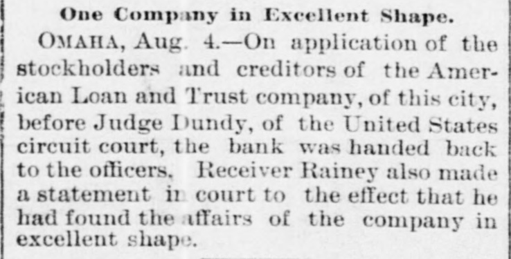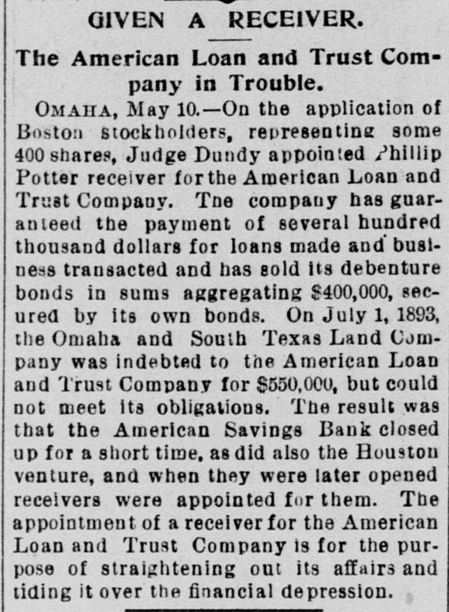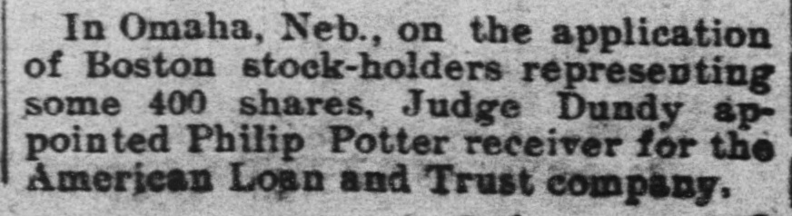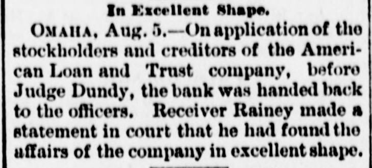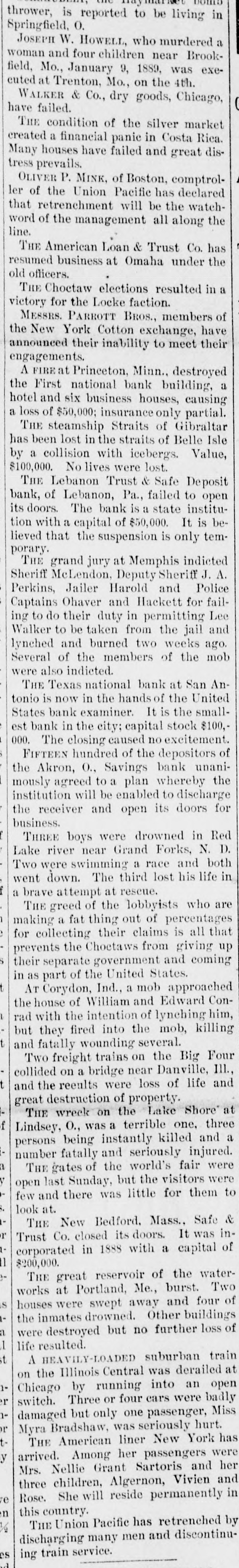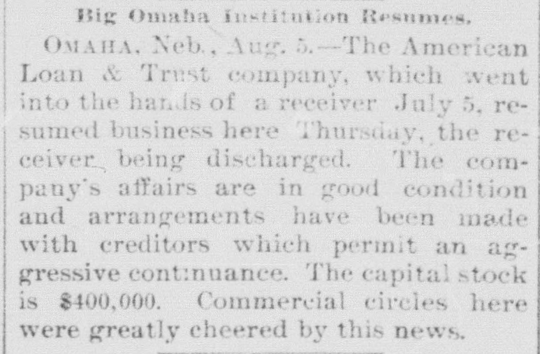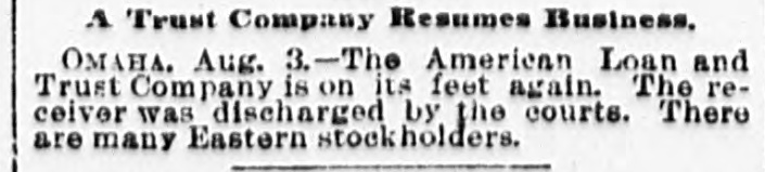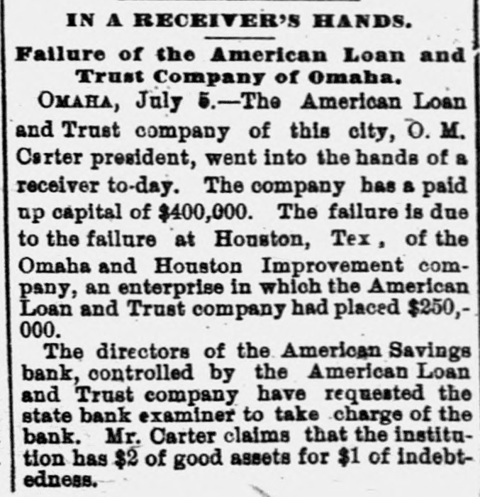THE BANK PANIC. IT REACHES PUEBLO WITH A VENGEANCE. Four Institutions Close Their Doors in One Day-A Savings Bank at Omaha Goes Under. Special to the RECORD-UNION. PUEBLO, (Col.), July 5.-The bank panic did not reach Pueblo until this morning, and then it came with a vengeance. When the American National opened for business a large number of depositors were waiting to take out their money. The crowd grew, and about 10 o'clock the doors were closed. A notice was posted stating that the bank would commence business again soon, and that the assets were $1,250,000 and the liabilities $650,000. Runs commenced on both the Western National and the First National. The Western National closed its doors before noon. They have deposits of over $1,000,000, and were always considered very strong. Hundreds stood in and about the First National Bank all day, and the depositors were paid as fast as the paying teller could handle them. The general expectation is that the First National will be able to pay its creditors in full when called for, and they cannot be forced to close. The Central National closed at noon. The assets are about $170,000, and the liabilities about $70,000. A run was made on the Pueblo Savings Bank, but they took advantage of the law which allows them sixty days. The bank is regarded as perfectly safe. A much better feeling prevails this evening, and the worst is believed to have passed. Each of the closed banks will pay in full as soon as they can realize on collateral. FAILURES AT OMAHA. OMAHA (Neb.), July 5.-The American Savings Bank has gone into voluntary liquidation, and asked the State Banking Board to wind up its affairs. The action is due to the failure of the American Loan and Trust Company, which was placed in the hands of a receiver this afternoon at the instance of the directors of the concern, the company being the principal stockholder in the savings bank. The failure of the investment company is attributed to the failure of the Omaha and South Texas Land Company and the American Loan Company. The first of the concerns embarrassed had a paid-up capital of $400,000. The savings bank was an offshoot, with a capital stock of $400,000, of which $100,000 was paid up. O. M. Garter is President of both institutions. Since the failure of the McCague Bank the American Savings has effected a reduction of deposits to $9,000, the remaining securities amounting to $253,000 of the best. The total liabilities amounted to but $153,000. Carter gave a mortgage on his residence property yesterday for $50,000, to protect one of the Eastern creditors, from whom no money was secured, No statement of the bank's exact condition can be obtained to-night.