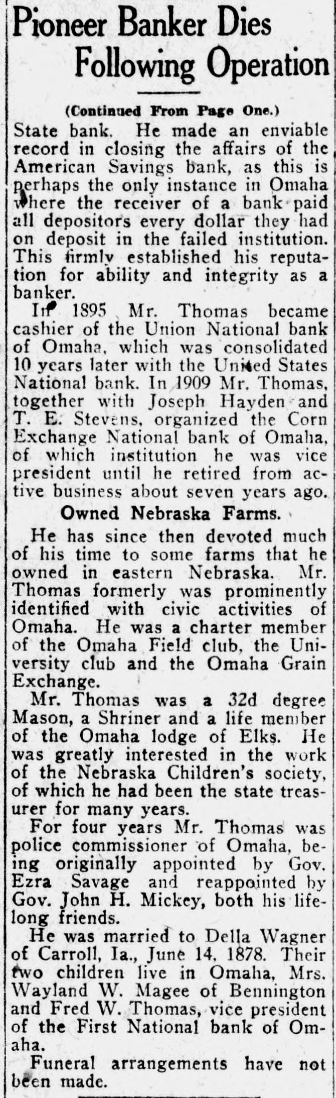 # Pioneer Banker Dies # Following Operation (Continued From Page One.) State bank. He made an enviable record in closing the affairs of the American Savings bank, as this is perhaps the only instance in Omaha where the receiver of a bank paid all depositors every dollar they had on deposit in the failed institution. This firmly established his reputation for ability and integrity as a banker. Inf 1895 Mr. Thomas became cashier of the Union National bank of Omaha, which was consolidated 10 years later with the United States National bank. In 1909 Mr. Thomas, together with Joseph Hayden and T. E. Stevens, organized the Corn Exchange National bank of Omaha, of which institution he was vice president until he retired from active business about seven years ago. Owned Nebraska Farms. He has since then devoted much of his time to some farms that he owned in eastern Nebraska. Mr. Thomas formerly was prominently identified with civic activities of Omaha. He was a charter member of the Omaha Field club, the University club and the Omaha Grain Exchange. Mr. Thomas was a 32d degree Mason, a Shriner and a life member of the Omaha lodge of Elks. He was greatly interested in the work of the Nebraska Children's society, of which he had been the state treasurer for many years. For four years Mr. Thomas was police commissioner of Omaha, being originally appointed by Gov. Ezra Savage and reappointed by Gov. John H. Mickey, both his life-long friends. He was married to Della Wagner of Carroll, Ia., June 14, 1878. Their two children live in Omaha, Mrs. Wayland W. Magee of Bennington and Fred W. Thomas, vice president of the First National bank of Omaha. Funeral arrangements have not been made.