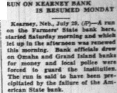 OCR of the single short article is poor. The brief text suggests the American State Bank (Omaha) was forced into failure (closure) rather than a depositor run; no explicit run is mentioned. I therefore classify this as a suspension leading to closure/receivership. Date is taken from the newspaper (1929-07-29). Low confidence due to fragmentary OCR.