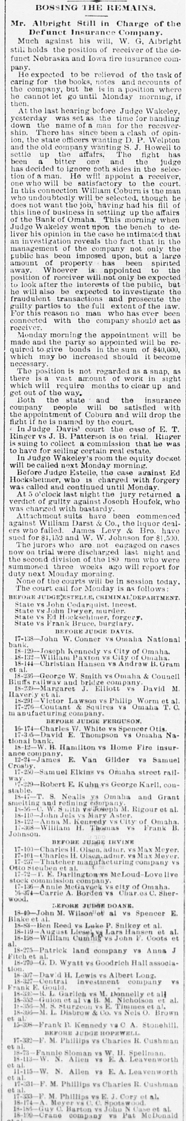 one who will be satisfactory to the court. In this connection William Coburn is the man who undoubtedly will be selected. though he does not want the job, having had his fill of this line of business in settling up the affairs of the Bank of Omaha. This morning when Judge Wakeley went upon the bench to deliver his opinion in the case he intimated that an investigation reveals the fact that in the management of the company not only the public has been imposed upon, but a large amount of property has been spirited away. Whoever is appointed to the position of receiver will not only be expected to look after the interests of the public, but he will also be expected to investigate the fraudulent transactions and prosecute the guilty parties to the full extent of the law. For this reason no man who has ever been connected with the company should act as receiver. Monday morning the appointment will be made and the party so appointed will be required to give bonds in the sum of $40,000, which may be increased should it become necessary. The position is not regarded as a snap, as there is a vast amount of work in sight which will require months to clear up and get out of the way. Both the state and the insurance company people will be satisfied with the appointment of Coburn and will drop the fight if he is named by the court. In Judge Davis' court the case of E. T. Ringer vs J. B. Patterson is on trial. Ringer is suing to collect a commission that he was to have for seiling certain real estate. In Judge Wakeley's room the equity docket will be called next Monday morning. Before Judge Estelle, the case against Ed Hocksheimer, who IS charged with forgery was called and continued until Monday. At 5 o'clock last night the jury returned a verdict of guilty against Joseph Houfek, who was charged with bastardy. Attachment suits have been commenced against William Darst & Co., the liquor dealers who failed. James Levy & Bro. have sued for $1,152 and W. W. Johnson for $1,500. The jurors who are not engaged on cases now on trial were discharged last night and the second division of the 180 men who were summoned three weeks ago will report for duty next Monday morning. None of the courts will be in session today. The court call for Monday is as follows: BEFORE JUDGE,ESTELLE, CRIMINAL(DEPARTMENT. State vs John Cedarquist. incest. State VS John Dwyer. murder. State vs Ed Hockschimer. forgery. State vs Frank Bruce, burgiary. BEFORE JUDGE DAVIS. 17-138-John W. Conner VS Omaha National bank. 18-129-Joseph Kennody vs City of Omaha. 18-I32-William Paxton VS City of Omaha. 18-144-Christian Hansen vs Andrew B. Gram et al. 18-236-George W. Smith vs Omaha & Council Bluffs railway and bridge company. 18-23-Margaret J. Elliott vs David M. Haverly al. 18-291-Victor Lawson VS Philip Worm et al. 17-276-Coutant & Squires vs Omaha T. C. m anufacturing company. BEFORE JUDGE FERGUSON. 16-174-Charles W. White vs Spencer Otis. 17-355-David E. Thompson vs Omaha National bank. 18-12-W. B. Hamilton vs Home Fire insurancecompany. 12-24-James E. Van Gilder VS Samuel Crosby. 17-250-Samuel Elkins vs Omaha street railway. 17-220-Robert E. Kuhnys George Karil, constable. 18-47-T. S. Nealis ys Omaha and Grant smelting and refining ederpany. 18-56-C. W. Smith vs Joseph M. Rigour et al. 18-110-John Jels VS Mary Aster. 18-122-Anna M. Kennedy vs City of Omaha. 17-308-Willian H. Thomas vs Frank B. Johnson. BEFORE JUDGE IRVINE 17-100-Charles H. Olsen, admr. vs Max Meyer. 17-101-Charles H. Olsen.admr. vs Max Meyer. 17-237-Thateher manufacturing company vs Otto Steuben et al. 17-72-1. E. Darlingtows McLoud-Love live stock commission company. 17-136-Annie McGavock vs city of Omaha. 36-374-Carrie A. Borden vs Charles C. Sherwood. DEFORE JUDGE DOANE. 18-40-John M. Wilson'et al VS Spencer E. Blake et al. 18-83-Ben Reed VS Luke P. Snikey et al. 18-119-August Liesel Lars Hansen et al. 18-198-William Cummig vs John F. Coots et al. 18-275-Patrick land company VS Anna J Fitch et al. 18-370-G. D. Wyatt vs Goodrich Hall association. 18-307-David H. Lewis vs Albert Long. 18-327-Central investment company vs Frank E. Gould. 18-330-R. L. Garlich VS M. Donnelly et all 18-352-Guion et al vs B. M. Nicholson et al. 18-356-M. S. sturgeon VS E. Timmes et al. 18-396-M. L. Disbrow & Co. VS Nels O. Brown et al. 15-398-Frank B. Kennedy va o A. Stonehill, BEFORE JUDGE HOPEWELL 17-332-F. M. Phillips vs Charles R. Cushman et al. 18-73-Fannie Sloman VS W. H. Spellman. 18-113-W. N. Allen vs E. A. Leavenworth al. 11-115-W. N. Allen vs E. A. Leavenworth et al. 17-331-F. M. Phillips vs Charles R. Cushman et al. 17-333-P. M. Phillips VS E. J. Cory et al. 18-174-A. Meyer vs O. C. Spotswood. 18-185-Guy O. Barton vs John N Case et al. 18-199-Crane company vs Pat McDonald