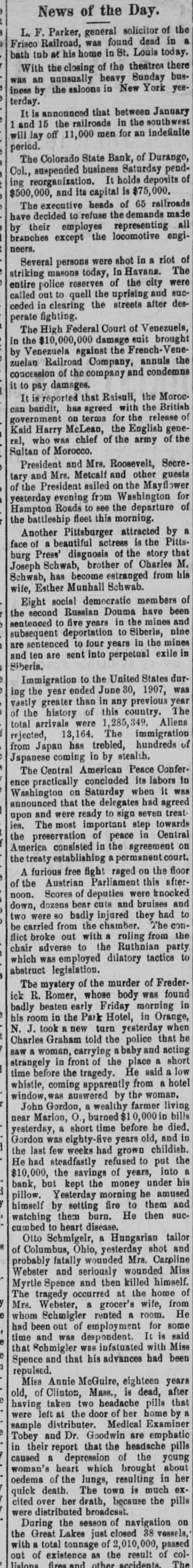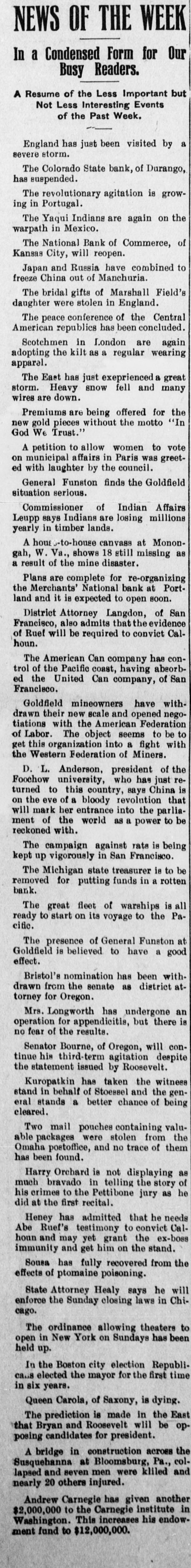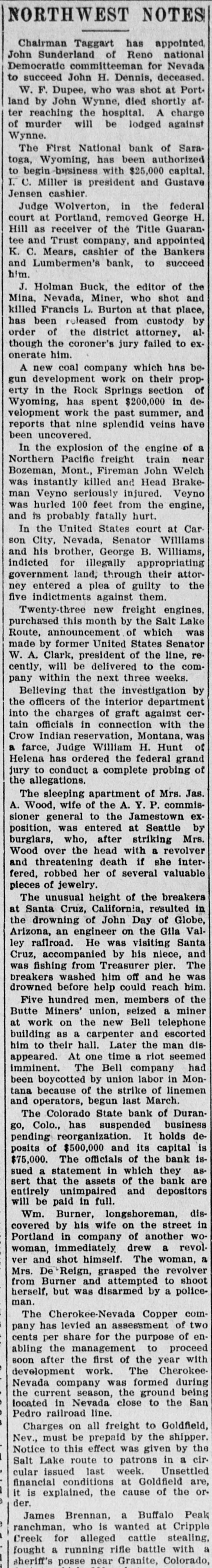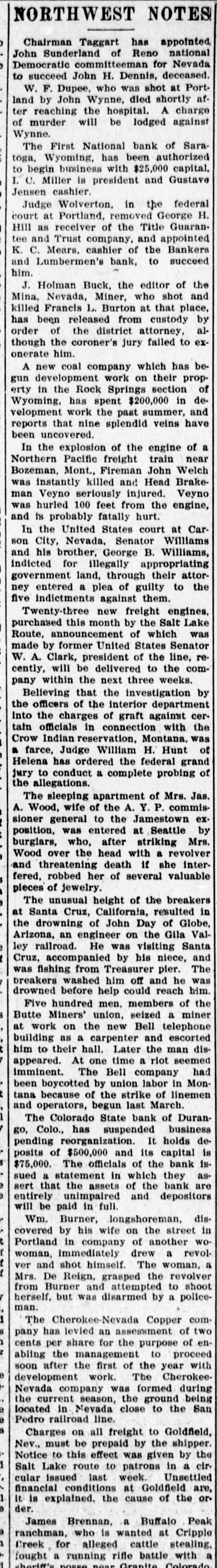 NORTHWEST NOTES Chairman Taggart has appointed John Sunderland of Reno national Democratic committeeman for Nevada to succeed John H. Dennis, deceased. W. F. Dupee, who was shot at Port. land by John Wynne, died shortly after reaching the hospital. A charge of murder will be lodged against Wynne. The First National bank of Saratoga, Wyoming, has been authorized to begin-business with $25,000 capital. I. C. Miller is president and Gustave Jensen cashier. Judge Wolverton, in the federal court at Portland, removed George H. Hill as receiver of the Title Guarantee and Trust company, and appointed K. C. Mears, cashier of the Bankers and Lumbermen's bank, to succeed him. J. Holman Buck, the editor of the Mina. Nevada, Miner, who shot and killed Francis L. Burton at that place, has been released from custody by order of the district attorney, although the coroner's jury failed to exonerate him. A new coal company which hns begun development work on their property in the Rock Springs section of Wyoming, has spent $200,000 in development work the past summer, and reports that nine splendid veins have been uncovered. In the explosion of the engine of a Northern Pacific freight train near Bozeman, Mont., Fireman John Welch was instantly killed and Head Brakeman Veyno seriously injured. Veyno was hurled 100 feet from the engine, and is probably fatally hurt. In the United States court at Carson City, Nevada, Senator Williams and his brother, George B. Williams, indicted for illegally appropriating government land, through their attorney entered a plea of guilty to the five indictments against them. Twenty-three new freight engines, purchased this month by the Salt Lake Route, announcement of which was made by former United States Senator W. A. Clark, president of the line, recently, will be delivered to the company within the next three weeks. Believing that the investigation by the officers of the interior department into the charges of graft against certain officials in connection with the Crow Indian reservation, Montana, was a farce, Judge William H. Hunt of Helena has ordered the federal grand jury to conduct a complete probing of the allegations. The sleeping apartment of Mrs. Jas. A. Wood, wife of the A. Y. P. commissioner general to the Jamestown exposition, was entered at Seattle by burglars, who, after striking Mrs. Wood over the head with a revolver and threatening death if she interfered, robbed her of several valuable pieces of jewelry. The unusual height of the breakers at Santa Cruz, California, resulted in the drowning of John Day of Globe, Arizona, an engineer on the Gila Valley raflroad. He was visiting Santa Cruz, accompanied by his niece, and was fishing from Treasurer pier. The breakers washed him off and he was drowned before help could reach him. Five hundred men, members of the Butte Miners' union, seized a miner at work on the new Bell telephone building as a carpenter and escorted him to their hall. Later the man disappeared. At one time a riot seemed imminent. The Bell company had been boycotted by union labor in Montana because of the strike of linemen and operators, begun last March. The Colorado State bank of Durango, Colo., has suspended business pending reorganization. It holds deposits of $500,000 and its capital is $75,000. The officials of the bank issued a statement in which they assert that the assets of the bank are entirely unimpaired and depositors will be paid in full. Wm. Burner, longshoreman, discovered by his wife on the street in Portland in company of another wowoman, immediately drew a revolver and shot himself. The woman, a Mrs. e*Reign, grasped the revolver from Burner and attempted to shoot herself, but was disarmed by a policeman. The Cherokee-Nevada Copper company has levied an assessment of two cents per share for the purpose of enabling the management to proceed soon after the first of the year with development work. The CherokeeNevada company was formed during the current season, the ground being located in Nevada close to the San Pedro railroad line. Charges on all freight to Goldfield, Nev., must be prepaid by the shipper. Notice to this effect was given by the Salt Lake route to patrons in a circular issued last week. Unsettled financial conditions at Goldfield are, It is explained, the cause of the order. James Brennan, a Buffalo Peak ranchman, who is wanted at Cripple Creek for alleged cattle stealing, fought a running rifle battle with a sheriff's posse near Granite, Colorado,