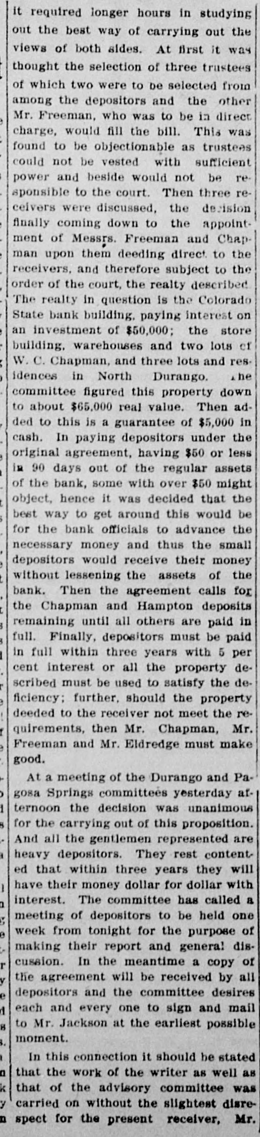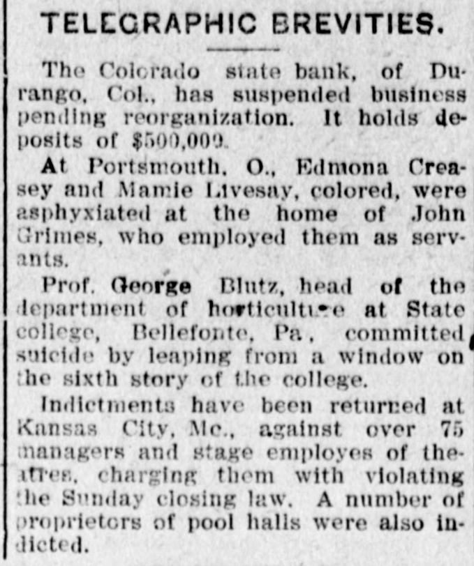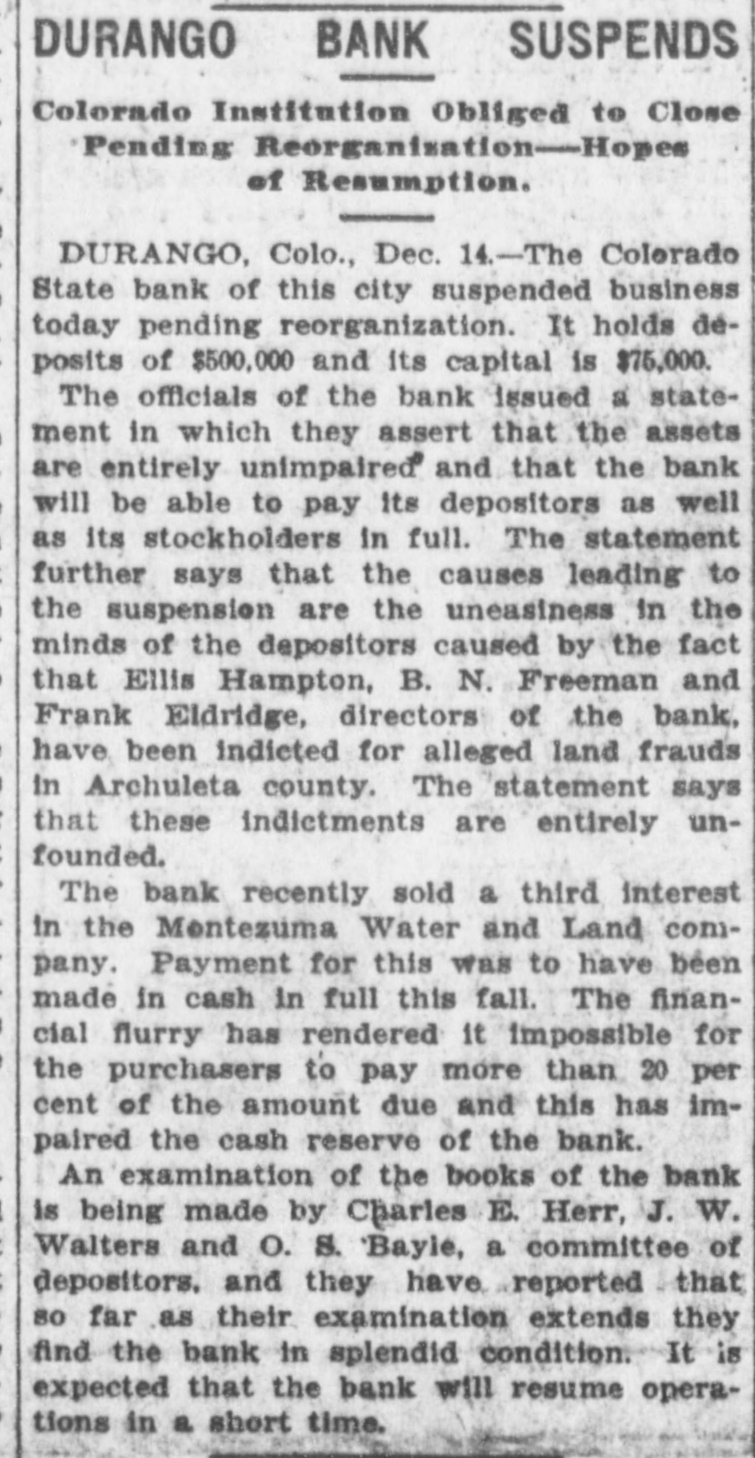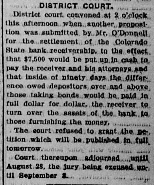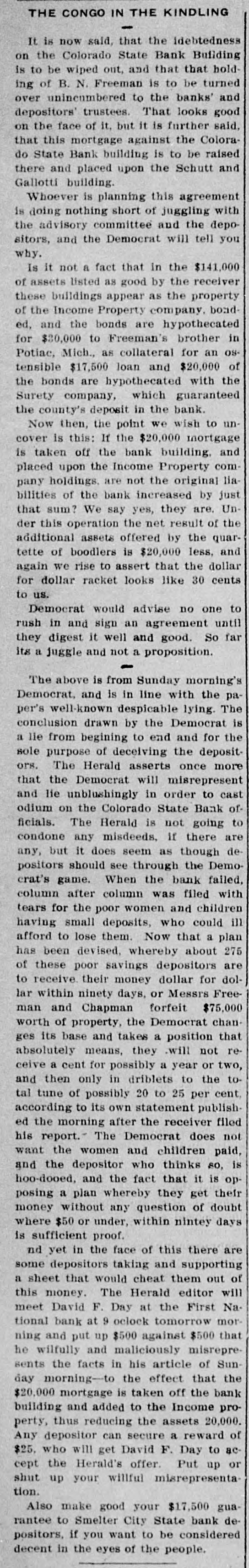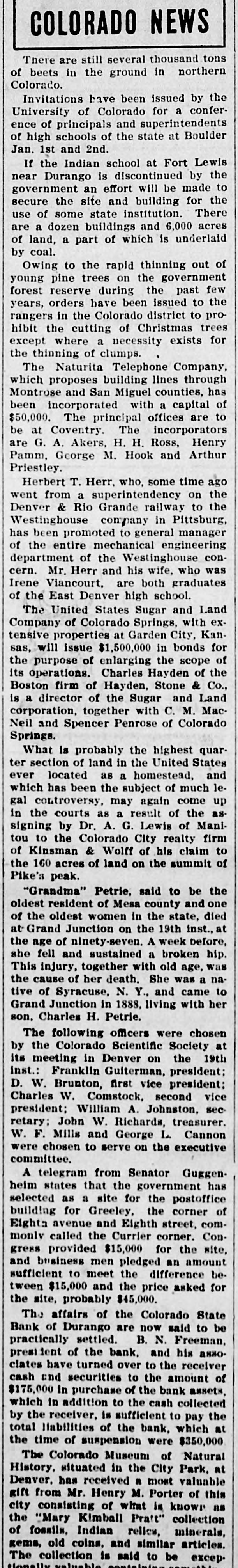 NORTHWEST NOTES Chairman Taggart has appointed John Sunderland of Reno national Democratic committeeman for Nevada to succeed John H. Dennis, deceased. W. F. Dupee, who was shot at Port. land by John Wynne, died shortly after reaching the hospital. A charge of murder will be lodged against Wynne. The First National bank of Saratoga, Wyoming, has been authorized to begin-business with $25,000 capital. I. C. Miller is president and Gustave Jensen cashier. Judge Wolverton, in the federal court at Portland, removed George H. Hill as receiver of the Title Guarantee and Trust company, and appointed K. C. Mears, cashier of the Bankers and Lumbermen's bank, to succeed him. J. Holman Buck, the editor of the Mina. Nevada, Miner, who shot and killed Francis L. Burton at that place, has been released from custody by order of the district attorney, although the coroner's jury failed to exonerate him. A new coal company which hns begun development work on their property in the Rock Springs section of Wyoming, has spent $200,000 in development work the past summer, and reports that nine splendid veins have been uncovered. In the explosion of the engine of a Northern Pacific freight train near Bozeman, Mont., Fireman John Welch was instantly killed and Head Brakeman Veyno seriously injured. Veyno was hurled 100 feet from the engine, and is probably fatally hurt. In the United States court at Carson City, Nevada, Senator Williams and his brother, George B. Williams, indicted for illegally appropriating government land, through their attorney entered a plea of guilty to the five indictments against them. Twenty-three new freight engines, purchased this month by the Salt Lake Route, announcement of which was made by former United States Senator W. A. Clark, president of the line, recently, will be delivered to the company within the next three weeks. Believing that the investigation by the officers of the interior department into the charges of graft against certain officials in connection with the Crow Indian reservation, Montana, was a farce, Judge William H. Hunt of Helena has ordered the federal grand jury to conduct a complete probing of the allegations. The sleeping apartment of Mrs. Jas. A. Wood, wife of the A. Y. P. commissioner general to the Jamestown exposition, was entered at Seattle by burglars, who, after striking Mrs. Wood over the head with a revolver and threatening death if she interfered, robbed her of several valuable pieces of jewelry. The unusual height of the breakers at Santa Cruz, California, resulted in the drowning of John Day of Globe, Arizona, an engineer on the Gila Valley raflroad. He was visiting Santa Cruz, accompanied by his niece, and was fishing from Treasurer pier. The breakers washed him off and he was drowned before help could reach him. Five hundred men, members of the Butte Miners' union, seized a miner at work on the new Bell telephone building as a carpenter and escorted him to their hall. Later the man disappeared. At one time a riot seemed imminent. The Bell company had been boycotted by union labor in Montana because of the strike of linemen and operators, begun last March. The Colorado State bank of Durango, Colo., has suspended business pending reorganization. It holds deposits of $500,000 and its capital is $75,000. The officials of the bank issued a statement in which they assert that the assets of the bank are entirely unimpaired and depositors will be paid in full. Wm. Burner, longshoreman, discovered by his wife on the street in Portland in company of another wowoman, immediately drew a revolver and shot himself. The woman, a Mrs. e*Reign, grasped the revolver from Burner and attempted to shoot herself, but was disarmed by a policeman. The Cherokee-Nevada Copper company has levied an assessment of two cents per share for the purpose of enabling the management to proceed soon after the first of the year with development work. The CherokeeNevada company was formed during the current season, the ground being located in Nevada close to the San Pedro railroad line. Charges on all freight to Goldfield, Nev., must be prepaid by the shipper. Notice to this effect was given by the Salt Lake route to patrons in a circular issued last week. Unsettled financial conditions at Goldfield are, It is explained, the cause of the order. James Brennan, a Buffalo Peak ranchman, who is wanted at Cripple Creek for alleged cattle stealing, fought a running rifle battle with a sheriff's posse near Granite, Colorado,