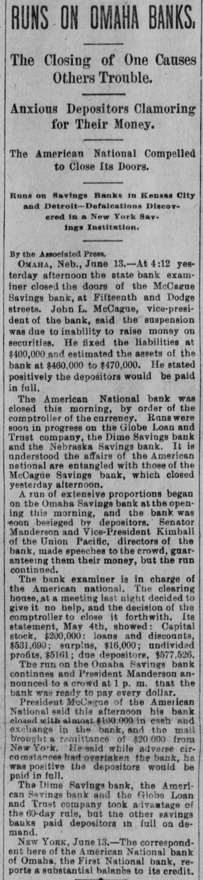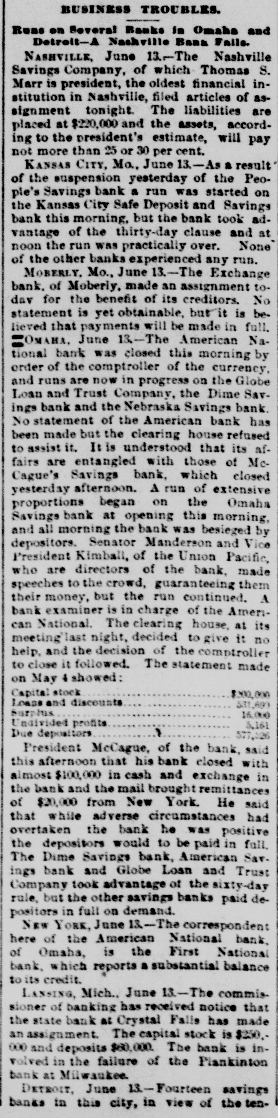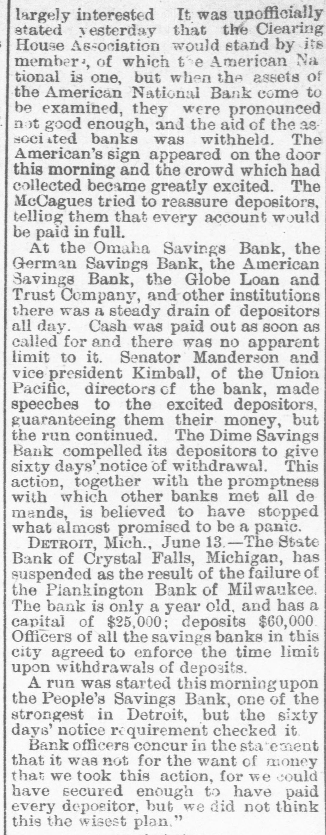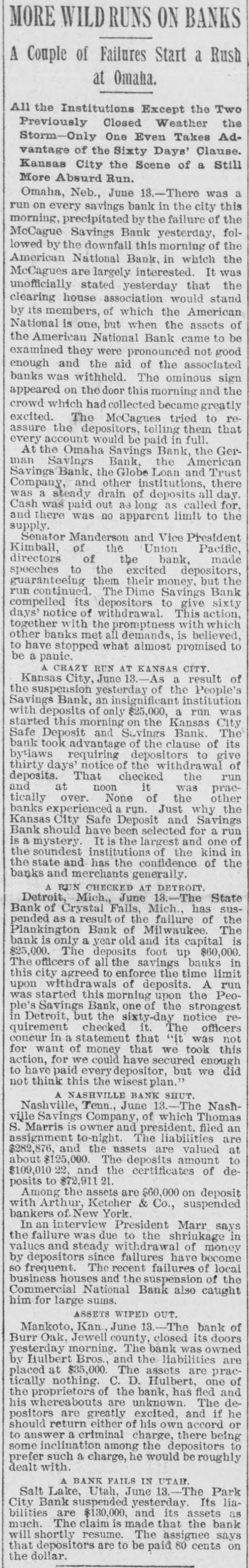 MORE WILDRUNS ON BANKS A Couple of Failures Start a Rush at Omaha. All the Institutions Except the Two Previously Closed Weather the Storm-Only One Even Takes Advantage of the Sixty Days' Clause. Kansas City the Scene of a Still More Absurd Run. Omaha, Neb., June 13.-There was a run on every savings bank in the city this morning, precipitated by the failure of the McCague Savings Bank yesterday, followed by the downfall this morning of the American National Bank, in which the McCagues are largely interested. It was unofficially stated yesterday that the clearing house association would stand by its members, of which the American National is one, but when the assets of the American National Bank came to be examined they were pronounced not good enough and the aid of the associated banks was withheld. The ominous sign appeared on the door this morning and the crowd which had collected becamegreatly excited. The McCagues tried to reassure the depositors, telling them that every account would be paid in full. At the Omaha Savings Bank, the German Savings Bank, the American Savings Bank, the Globe Loan and Trust Company, and other institutions, there was a steady drain of deposits all day Cash was paid out as long as called for, and there was no apparent limit to the supply. Senator Manderson and Vice President Kimball, of the Union Pacific, directors of the bank, made speeches to the excited depositors, guaranteeing them their money, but the run continued. The Dime Savings Bank compelled its depositors to give sixty days' notice of withdrawal. This action, together with the promptness with which other banks met all demands, is believed, to have stopped what almost promised to be a panic. A CRAZY RUN AT KANSAS CITY. Kansas City, June 13.-As a result of the suspension yesterday of the People's Savings Bank, an insignificant institution with deposits of only $25,000, a run was started this morning on the Kansas City Safe Deposit and Savings Bank. The bank took advantage of the clause of its by-laws requiring depositors to give thirty days' notice of the withdrawal of deposits. That checked the run and at it noon was practically over. None of the other banks experienced a run. Just why the Kansas City Safe Deposit and Savings Bank should have been selected for a run is a mystery. It is the largest and one of the soundest institutions of the kind in the state and has the confidence of the banks and merchants generally. A RUN CHECKED AT DETROIT. Detroit, Mich., June 3.-The State Bank of Crystal Falls, Mich. has suspended as a result of the failure of the Plankington Bank of Milwaukee. The bank is only a year old and its capital is $25,000. The deposits foot up $60,000. The officers of all the savings banks in this city agreed to enforce the time limit upon withdrawals of deposits. A run was started this morning upon the People's Savings Bank, one of the strongest in Detroit, but the sixty-day notice requirement checked it. The officers coneur in a statement that "it was not for want of money that we took this action, for we could have secured enough to have paid every depositor, but we did not think this the wisest plan.' A NASHVILLE BANK SHUT. Nashville, Tenn., June -The Nashville Savings Company, of which Thomas S. Marris is owner and president. filed an assignment to-night. The liabilities are $282,876, and the assets are valued at $ 125,000. The deposits amount to $109,010 22, and the certificates of deposits to $72,911 21. Among the assets are $60,000 on deposit with Arthur, Ketcher & Co., suspended bankers of New York. In an interview President Marr says the failure was due to the shrinkage in values and steady withdrawal of money by depositors since failures have become so frequent. The recent failures of local business houses and the suspension of the Commercial National Bank also caught him for large sums. ASSETS WIPED OUT. Mankoto, Kan. June 3.-The bank of Burr Oak, Jewell county, closed its doors yesterday morning. The bank was owned by Hulbert Bros., and the liabilities are placed at $35,000. The assets are practically nothing. C. D. Hulbert, one of the proprietors of the bank, has fled and his whereabouts are unknown The depositors are greatly excited, and if he should return either of his own accord or to answer a criminal charge, there being some inclination among the depositors to prefer such a charge, he would be roughly dealt with. A BANK FAILS IN UTAIF. Salt Lake, Utah, June 13.-The Park City Bank suspended yesterday. Its liabilities are $130,000, and its assets as much. The claim is made that the bank will shortly resume. The assignee says that depositors are to be paid 80 cents on the dollar.