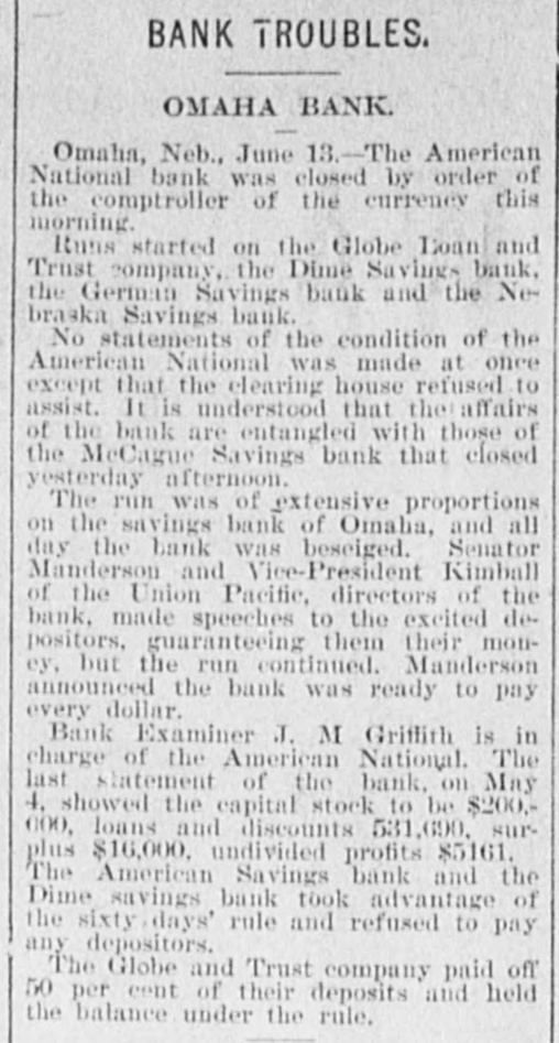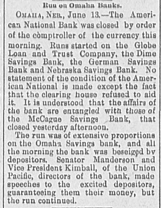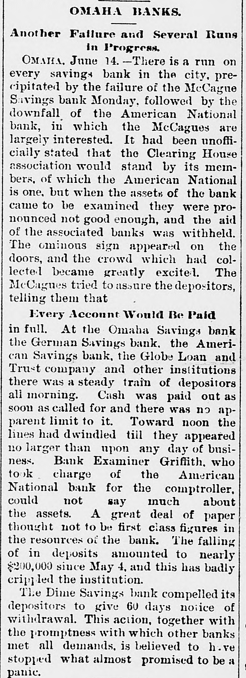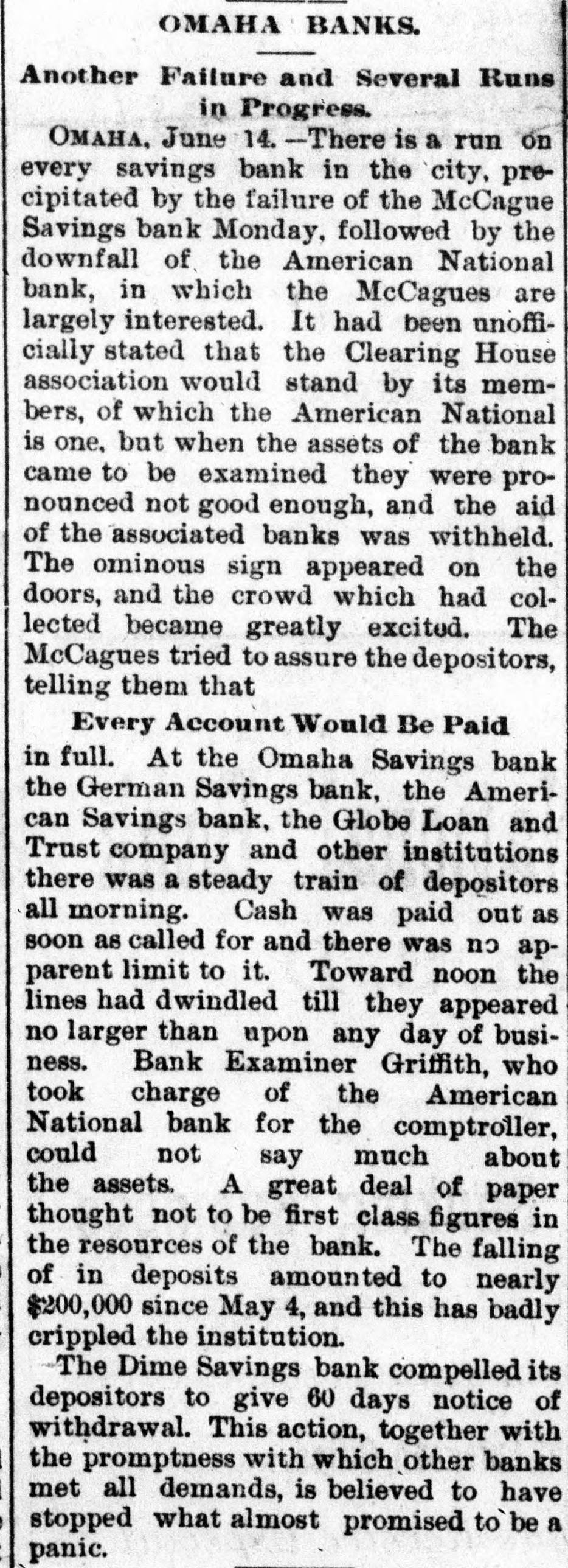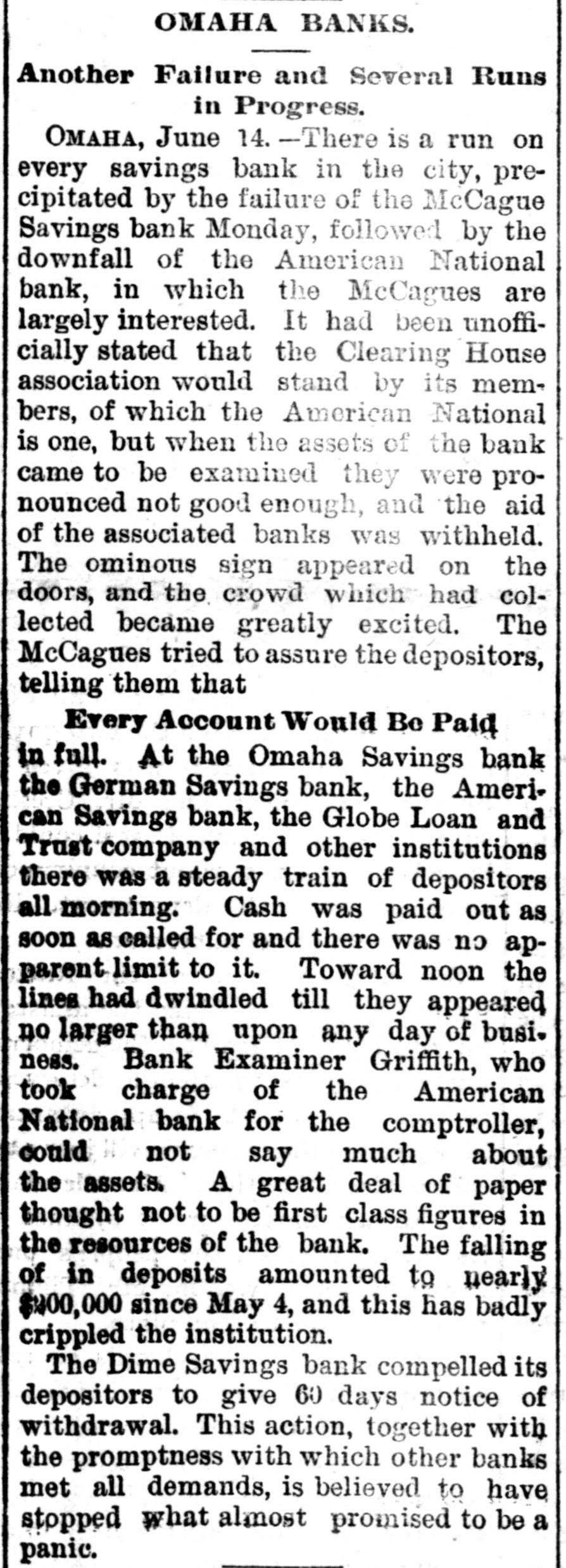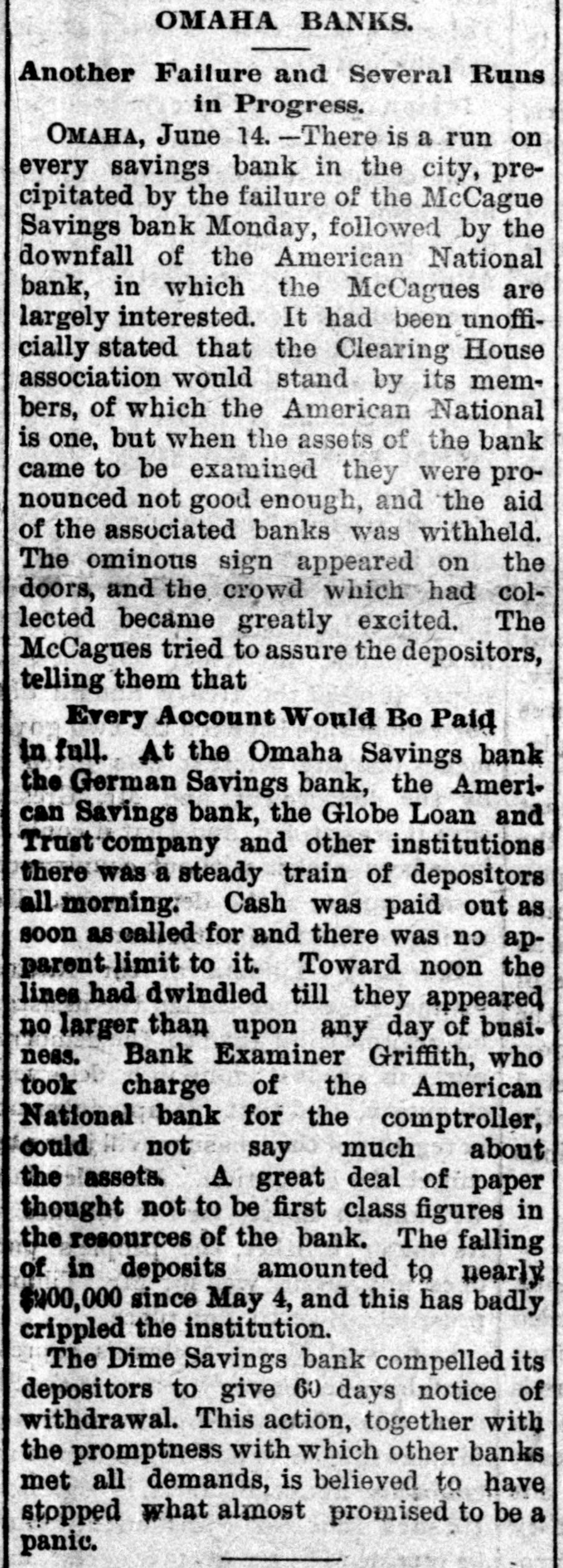 MORE WILDRUNS ON BANKS A Couple of Failures Start a Rush at Omaha. All the Institutions Except the Two Previously Closed Weather the Storm-Only One Even Takes Advantage of the Sixty Days' Clause. Kansas City the Scene of a Still More Absurd Run. Omaha, Neb., June 13.-There was a run on every savings bank in the city this morning, precipitated by the failure of the McCague Savings Bank yesterday, followed by the downfall this morning of the American National Bank, in which the McCagues are largely interested. It was unofficially stated yesterday that the clearing house association would stand by its members, of which the American National is one, but when the assets of the American National Bank came to be examined they were pronounced not good enough and the aid of the associated banks was withheld. The ominous sign appeared on the door this morning and the crowd which had collected becamegreatly excited. The McCagues tried to reassure the depositors, telling them that every account would be paid in full. At the Omaha Savings Bank, the German Savings Bank, the American Savings Bank, the Globe Loan and Trust Company, and other institutions, there was a steady drain of deposits all day Cash was paid out as long as called for, and there was no apparent limit to the supply. Senator Manderson and Vice President Kimball, of the Union Pacific, directors of the bank, made speeches to the excited depositors, guaranteeing them their money, but the run continued. The Dime Savings Bank compelled its depositors to give sixty days' notice of withdrawal. This action, together with the promptness with which other banks met all demands, is believed, to have stopped what almost promised to be a panic. A CRAZY RUN AT KANSAS CITY. Kansas City, June 13.-As a result of the suspension yesterday of the People's Savings Bank, an insignificant institution with deposits of only $25,000, a run was started this morning on the Kansas City Safe Deposit and Savings Bank. The bank took advantage of the clause of its by-laws requiring depositors to give thirty days' notice of the withdrawal of deposits. That checked the run and at it noon was practically over. None of the other banks experienced a run. Just why the Kansas City Safe Deposit and Savings Bank should have been selected for a run is a mystery. It is the largest and one of the soundest institutions of the kind in the state and has the confidence of the banks and merchants generally. A RUN CHECKED AT DETROIT. Detroit, Mich., June 3.-The State Bank of Crystal Falls, Mich. has suspended as a result of the failure of the Plankington Bank of Milwaukee. The bank is only a year old and its capital is $25,000. The deposits foot up $60,000. The officers of all the savings banks in this city agreed to enforce the time limit upon withdrawals of deposits. A run was started this morning upon the People's Savings Bank, one of the strongest in Detroit, but the sixty-day notice requirement checked it. The officers coneur in a statement that "it was not for want of money that we took this action, for we could have secured enough to have paid every depositor, but we did not think this the wisest plan.' A NASHVILLE BANK SHUT. Nashville, Tenn., June -The Nashville Savings Company, of which Thomas S. Marris is owner and president. filed an assignment to-night. The liabilities are $282,876, and the assets are valued at $ 125,000. The deposits amount to $109,010 22, and the certificates of deposits to $72,911 21. Among the assets are $60,000 on deposit with Arthur, Ketcher & Co., suspended bankers of New York. In an interview President Marr says the failure was due to the shrinkage in values and steady withdrawal of money by depositors since failures have become so frequent. The recent failures of local business houses and the suspension of the Commercial National Bank also caught him for large sums. ASSETS WIPED OUT. Mankoto, Kan. June 3.-The bank of Burr Oak, Jewell county, closed its doors yesterday morning. The bank was owned by Hulbert Bros., and the liabilities are placed at $35,000. The assets are practically nothing. C. D. Hulbert, one of the proprietors of the bank, has fled and his whereabouts are unknown The depositors are greatly excited, and if he should return either of his own accord or to answer a criminal charge, there being some inclination among the depositors to prefer such a charge, he would be roughly dealt with. A BANK FAILS IN UTAIF. Salt Lake, Utah, June 13.-The Park City Bank suspended yesterday. Its liabilities are $130,000, and its assets as much. The claim is made that the bank will shortly resume. The assignee says that depositors are to be paid 80 cents on the dollar.