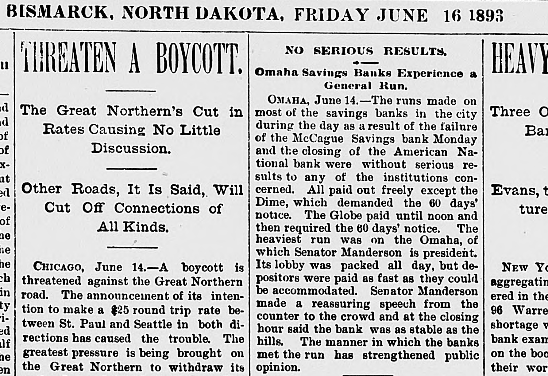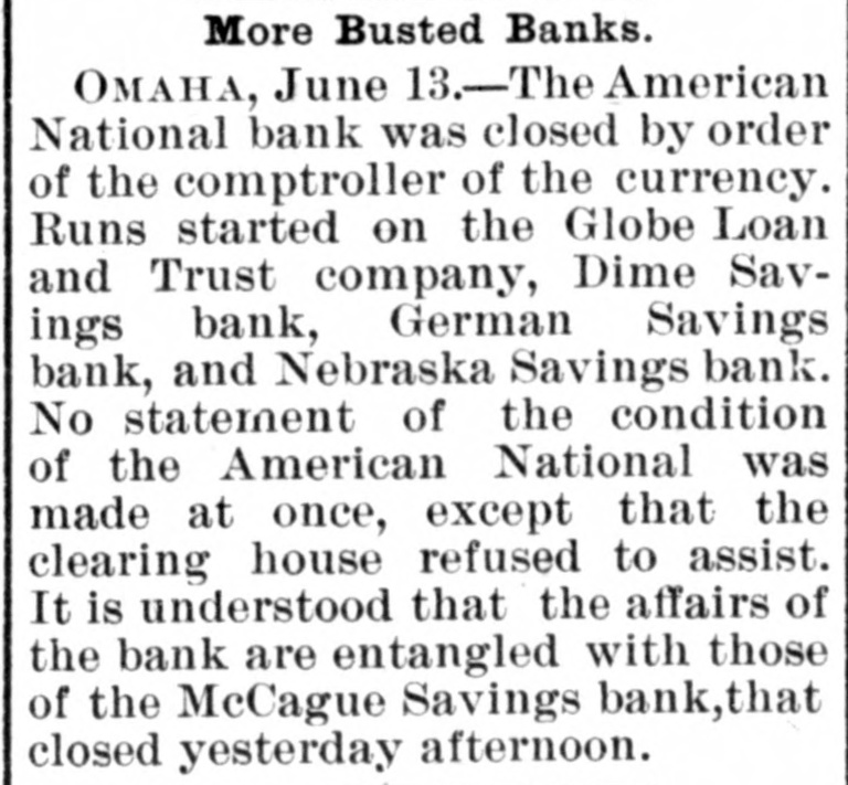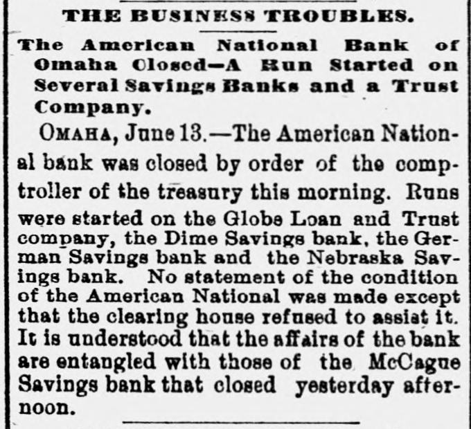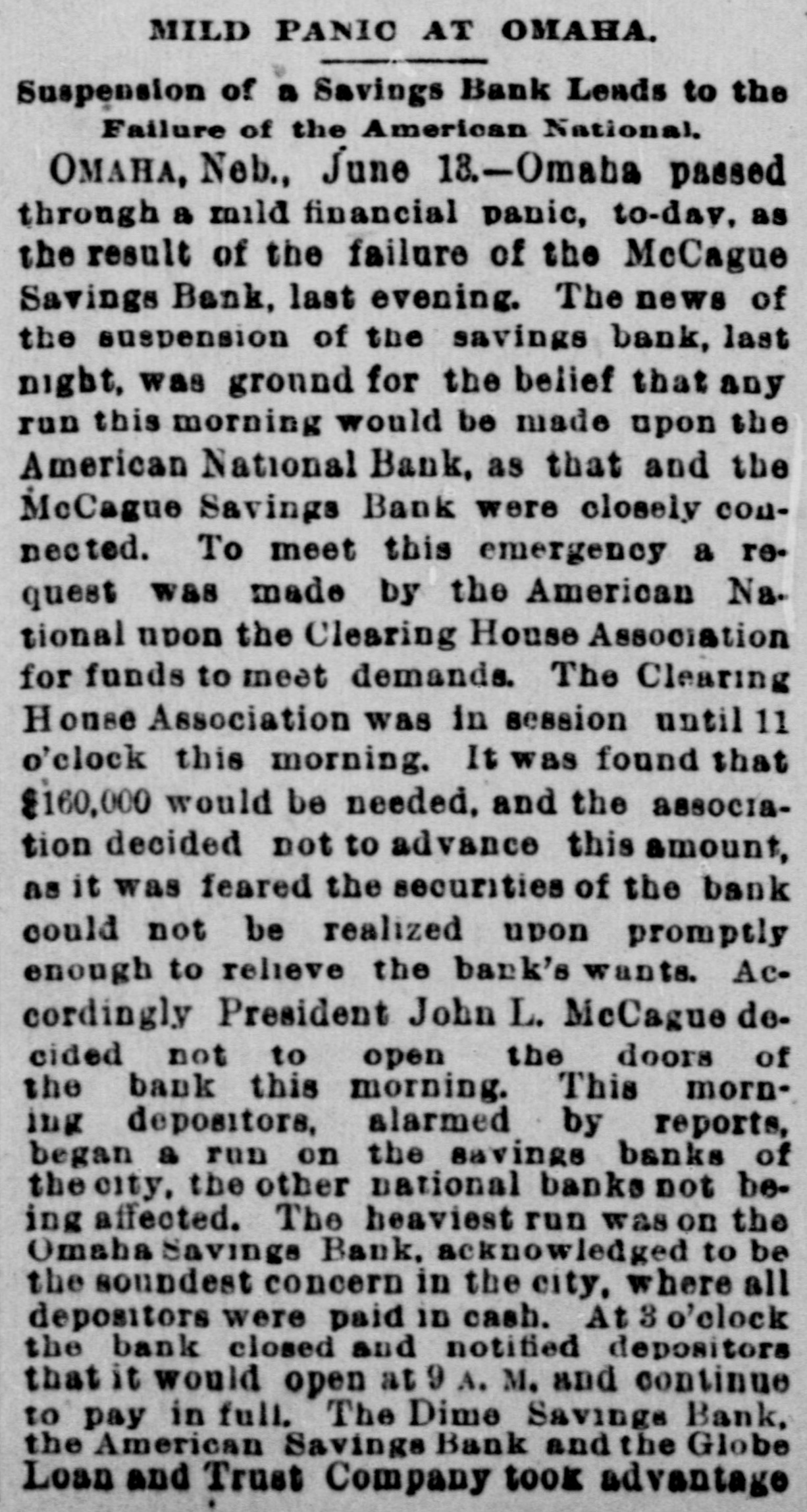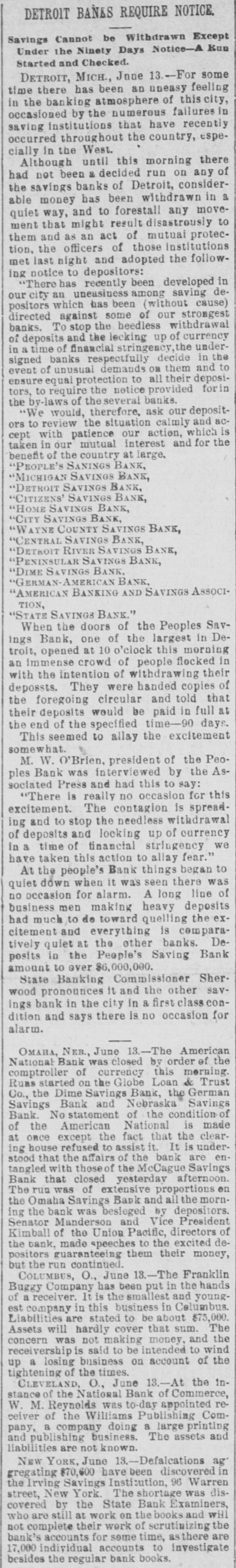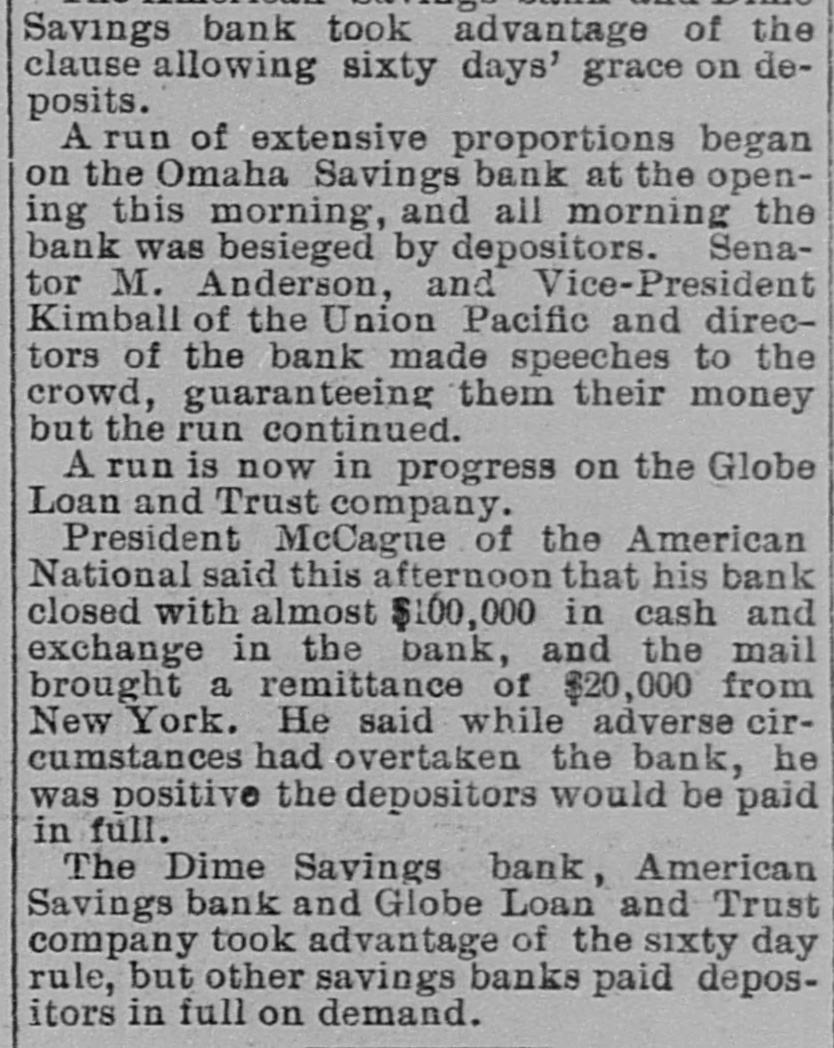 MORE WILDRUNS ON BANKS A Couple of Failures Start a Rush at Omaha. All the Institutions Except the Two Previously Closed Weather the Storm-Only One Even Takes Advantage of the Sixty Days' Clause. Kansas City the Scene of a Still More Absurd Run. Omaha, Neb., June 13.-There was a run on every savings bank in the city this morning, precipitated by the failure of the McCague Savings Bank yesterday, followed by the downfall this morning of the American National Bank, in which the McCagues are largely interested. It was unofficially stated yesterday that the clearing house association would stand by its members, of which the American National is one, but when the assets of the American National Bank came to be examined they were pronounced not good enough and the aid of the associated banks was withheld. The ominous sign appeared on the door this morning and the crowd which had collected becamegreatly excited. The McCagues tried to reassure the depositors, telling them that every account would be paid in full. At the Omaha Savings Bank, the German Savings Bank, the American Savings Bank, the Globe Loan and Trust Company, and other institutions, there was a steady drain of deposits all day Cash was paid out as long as called for, and there was no apparent limit to the supply. Senator Manderson and Vice President Kimball, of the Union Pacific, directors of the bank, made speeches to the excited depositors, guaranteeing them their money, but the run continued. The Dime Savings Bank compelled its depositors to give sixty days' notice of withdrawal. This action, together with the promptness with which other banks met all demands, is believed, to have stopped what almost promised to be a panic. A CRAZY RUN AT KANSAS CITY. Kansas City, June 13.-As a result of the suspension yesterday of the People's Savings Bank, an insignificant institution with deposits of only $25,000, a run was started this morning on the Kansas City Safe Deposit and Savings Bank. The bank took advantage of the clause of its by-laws requiring depositors to give thirty days' notice of the withdrawal of deposits. That checked the run and at it noon was practically over. None of the other banks experienced a run. Just why the Kansas City Safe Deposit and Savings Bank should have been selected for a run is a mystery. It is the largest and one of the soundest institutions of the kind in the state and has the confidence of the banks and merchants generally. A RUN CHECKED AT DETROIT. Detroit, Mich., June 3.-The State Bank of Crystal Falls, Mich. has suspended as a result of the failure of the Plankington Bank of Milwaukee. The bank is only a year old and its capital is $25,000. The deposits foot up $60,000. The officers of all the savings banks in this city agreed to enforce the time limit upon withdrawals of deposits. A run was started this morning upon the People's Savings Bank, one of the strongest in Detroit, but the sixty-day notice requirement checked it. The officers coneur in a statement that "it was not for want of money that we took this action, for we could have secured enough to have paid every depositor, but we did not think this the wisest plan.' A NASHVILLE BANK SHUT. Nashville, Tenn., June -The Nashville Savings Company, of which Thomas S. Marris is owner and president. filed an assignment to-night. The liabilities are $282,876, and the assets are valued at $ 125,000. The deposits amount to $109,010 22, and the certificates of deposits to $72,911 21. Among the assets are $60,000 on deposit with Arthur, Ketcher & Co., suspended bankers of New York. In an interview President Marr says the failure was due to the shrinkage in values and steady withdrawal of money by depositors since failures have become so frequent. The recent failures of local business houses and the suspension of the Commercial National Bank also caught him for large sums. ASSETS WIPED OUT. Mankoto, Kan. June 3.-The bank of Burr Oak, Jewell county, closed its doors yesterday morning. The bank was owned by Hulbert Bros., and the liabilities are placed at $35,000. The assets are practically nothing. C. D. Hulbert, one of the proprietors of the bank, has fled and his whereabouts are unknown The depositors are greatly excited, and if he should return either of his own accord or to answer a criminal charge, there being some inclination among the depositors to prefer such a charge, he would be roughly dealt with. A BANK FAILS IN UTAIF. Salt Lake, Utah, June 13.-The Park City Bank suspended yesterday. Its liabilities are $130,000, and its assets as much. The claim is made that the bank will shortly resume. The assignee says that depositors are to be paid 80 cents on the dollar.