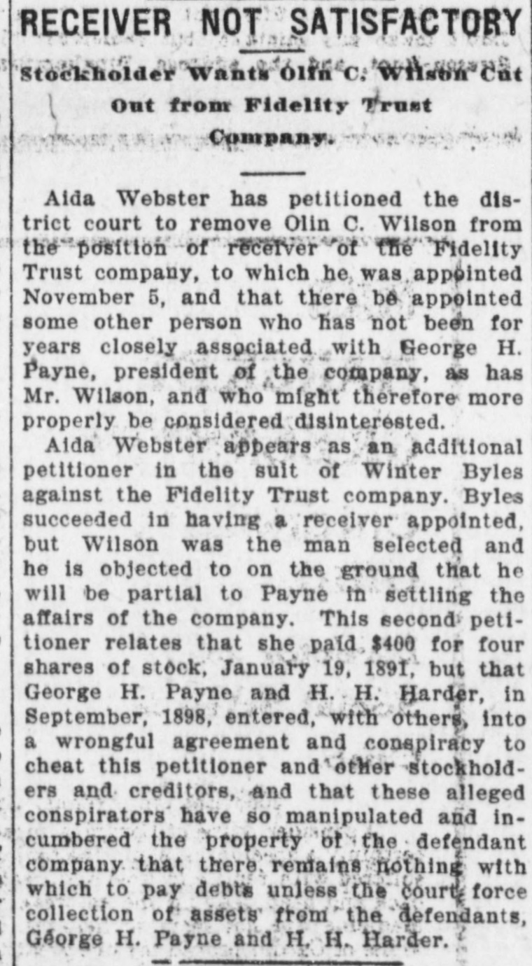 RECEIVER NOT SATISFACTORY Stockholder Wants Olfn C: Wilson Cut Out from Fidelity Trust Company. Aida Webster has petitioned the district court to remove Olin C. Wilson from the position of receiver of the Fidelity Trust company, to which he, was appointed November 5, and that there be appointed some other person who has not been for years closely associated with George H. Payne, president of the company, as has Mr. Wilson, and who might therefore more properly be considered disinterested. Aida Webster appears as an additional petitioner in the sult of Winter Byles against the Fidelity Trust company. Byles succeeded in having a receiver appointed, but Wilson was the man selected and he is objected to on the ground that he will be partial to Payne in settling the affairs of the company. This second petitioner relates that she paid $400 for four shares of stock, January 19, 1891, but that George H. Payne and H. H. Harder, in September, 1898, entered, with others, into a wrongful agreement and conspiracy to cheat this petitioner and other stockholders and creditors, and that these alleged conspirators have so manipulated and incumbered the property of the defendant company that there. remains nothing with which to pay debts unless the court force collection of assets from the defendants, George H. Payne and H. H. Harder.