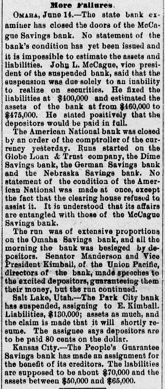 More Failures. OMAHA, June 14.-The state bank examiner has closed the doors of the McCague Savings bank. No statement of the bank's condition has yet been issued and it is impossible to estimate the assets and liabilities. John L. McCague, vice president of the suspended bank, said that the suspension was due solely to an inability to realize on securities. He fixed the liabilities at $400,000 and estimated the assets of the bank at from $460,000 to $475,000. He stated positively that the depositors would be paid in full. The American National bank was closed by an order of the comptroller of the currency yesterday. Runs started on the Globe Loan & Trust company, the Dime Savings bank, the German Savings bank and the Nebraska Savings bank. No statement of the condition of the American National was made at once, except the fact that the clearing house refused to assist it. It is understood that its affairs are entangled with those of the McCague Savings bank. The run was of extensive proportions on the Omaha Savings bank, and all the morning the bank was besieged by depositors. Senator Manderson and Vice President Kimball, of the Union Pacific, directors of the bank, made speeches to the excited depositors, guaranteeing them their money, but the run continued. Salt Lake, Utah.-The Park City bank has suspended, assigning to E. Kimball. Liabilities, $130,000; assets as much, and the claim is made that it will shortly resume. The assignee says depositors are to be paid 80 cents on the dollar. Kansas City.-The People's Guarantee Savings bank has made an assignment for the benefit of its creditors. The liabilities are supposed to be about $70,000 and the assets between $50,000 and $65,000.