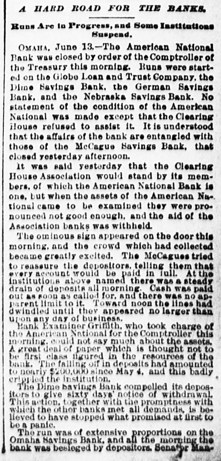 A HARD ROAD FOR THE BANKS. Runs Are In Progress, and Some Institutions Suspend. OMAHA. June 13.-The American National Bank was closed by order of the Comptroller of the Treasury this morning. Runs were started on the Globe Loan and Trust Company. the Dine Savings Bank. the German Savings Bank. and the Nebraska Savings Bank. No statement of the condition of the American National was made except that the Clearing House refused to assist it. It is understood that the affairs of the bank are entangled with those of the McCague Savings Bank, that closed yesterday afternoon. It was said yesterday that the Clearing House Association would stand by its members. of which the American National Bank is one. but when the assets of the American National came to be examined they were pronounced not good enough. and the aid of the Association banks was withheld. The ominous sign appeared on the door this morning. and the crowd which had collected became greatly excited. The McCagues tried to reasoure the depositors. telling them that every account would be paid in full. At the institutions above named there was a steady drain of deposits all morning. Cash was paid out as ROOD as called for. and there was no ap. parent limit to it. Toward noon the lines had dwindled until they appeared no larger than upon any day of business. Bank Examiner Griffth. who took charge of the American National for the Comptroller this morning. could not say much about the assets. A great deal of paper which is thought not to be first class figured in the resources of the bank. The failing off in deposits had amounted to noarly $200,000 since May 4. and this badly crippled the institution. The Dime havings Bank compelled its depositors to give sixty days' notice of withdrawal This action. together with the promptness with which the other banks met all demanda, is believed to have stopped what promised at first to be a panic. The run was of extensive proportions on the Omaha Havings Bank. and all the morning the bank was besieged by depositors. Senafor Man.