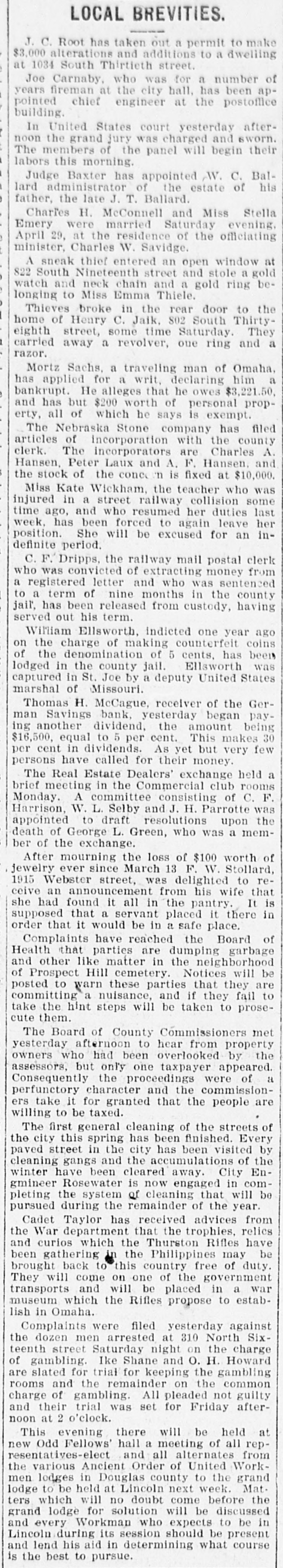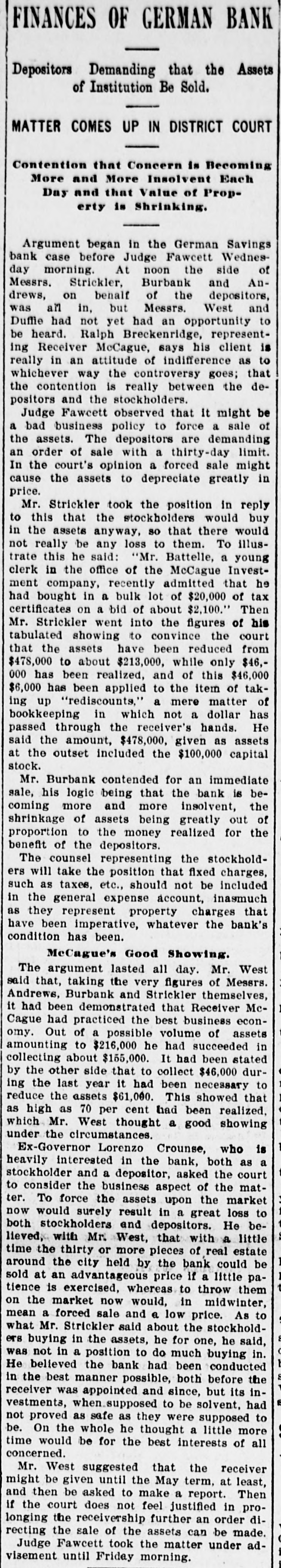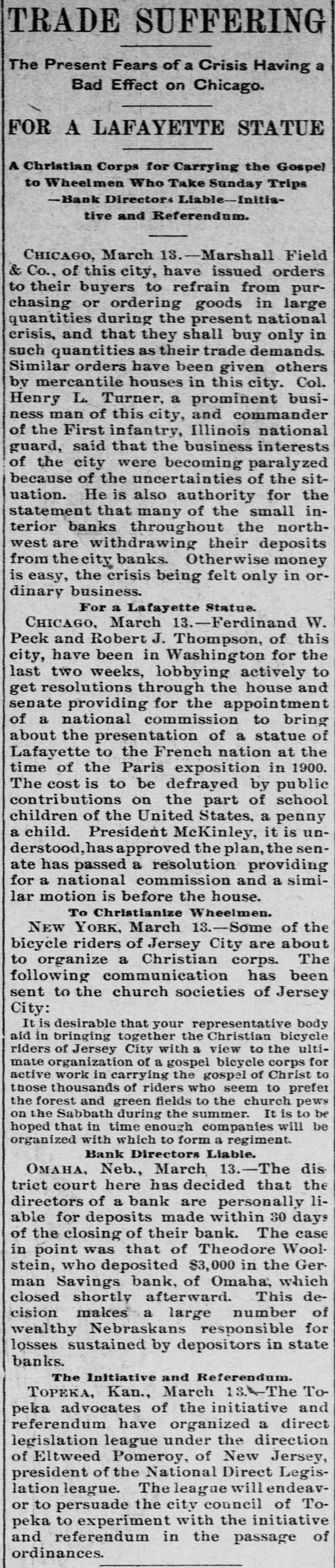 TRADE SUFFERING The Present Fears of a Crisis Having a Bad Effect on Chicago. FOR A LAFAYETTE STATUE A Christian Corps for Carrying the Gospel to Wheelmen Who Take Sunday Trips -Bank Directors Liable-Initistive and Referendum. CHICAGO, March 13.-Marshall Field & Co., of this city, have issued orders to their buyers to refrain from purchasing or ordering goods in large quantities during the present national erisis, and that they shall buy only in such quantities as their trade demands. Similar orders have been given others by mercantile houses in this city. Col. Henry L. Turner, a prominent business man of this city, and commander of the First infantry, Illinois national guard, said that the business interests of the city were becoming paralyzed because of the uncertainties of the situation. He is also authority for the statement that many of the small interior banks throughout the northwest are withdrawing their deposits from the iity banks. Otherwise money is easy, the crisis being felt only in ordinary business. For a Lafayette Statue. CHICAGO, March 13.-Ferdinand W. Peck and Robert J. Thompson, of this city, have been in Washington for the last two weeks, lobbying actively to get resolutions through the house and senate providing for the appointment of a national commission to bring about the presentation of a statue of Lafayette to the French nation at the time of the Paris exposition in 1900. The cost is to be defraved by public contributions on the part of school children of the United States. a penny a child. President McKinley, it is understood, has approved the plan, the senate has passed a resolution providing for a national commission and a similar motion is before the house. To Christianize Wheelmen. NEW YORK, March 13.-Some of the bicycle riders of Jersey City are about to organize a Christian corps. The following communication has been sent to the church societies of Jersey City: It is desirable that your representative body aid in bringing together the Christian bicycle riders of Jersey City with a view to the ultimate organization of a gospel bicycle corps for active work in carrying the gospel of Christ to those thousands of riders who seem to prefer the forest and green fields to the church pews on the Sabbath during the summer. It is to be hoped that in time enough companies will be organized with which to form a regiment. Bank Directors Liable. OMAHA. Neb., March 13.-The district court here has decided that the directors of a bank are personally liable for deposits made within 30 days of the closing of their bank. The case in point was that of Theodore Woolstein, who deposited $3,000 in the German Savings bank, of Omaha. which closed shortly afterward. This decision makes a large number of wealthy Nebraskans responsible for losses sustained by depositors in state banks. The Initiative and Referendum. TOPEKA, Kan., March 13.4-The Topeka advocates of the initiative and referendum have organized a direct legislation league under the direction of Eltweed Pomeroy, of New Jersey, president of the National Direct Legislation league. The league will endeavor to persuade the city council of Topeka to experiment with the initiative and referendum in the passage of ordinances.