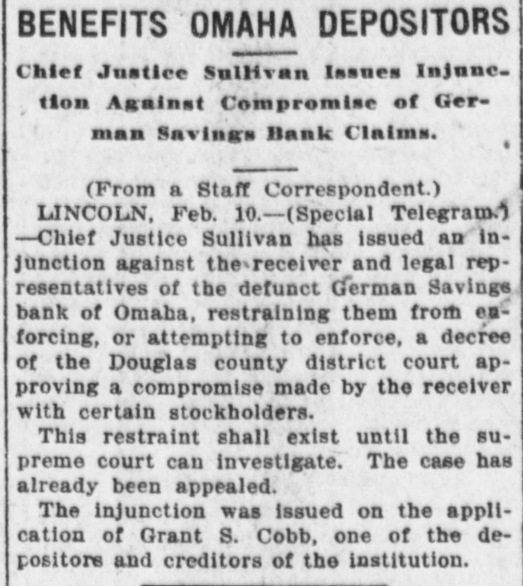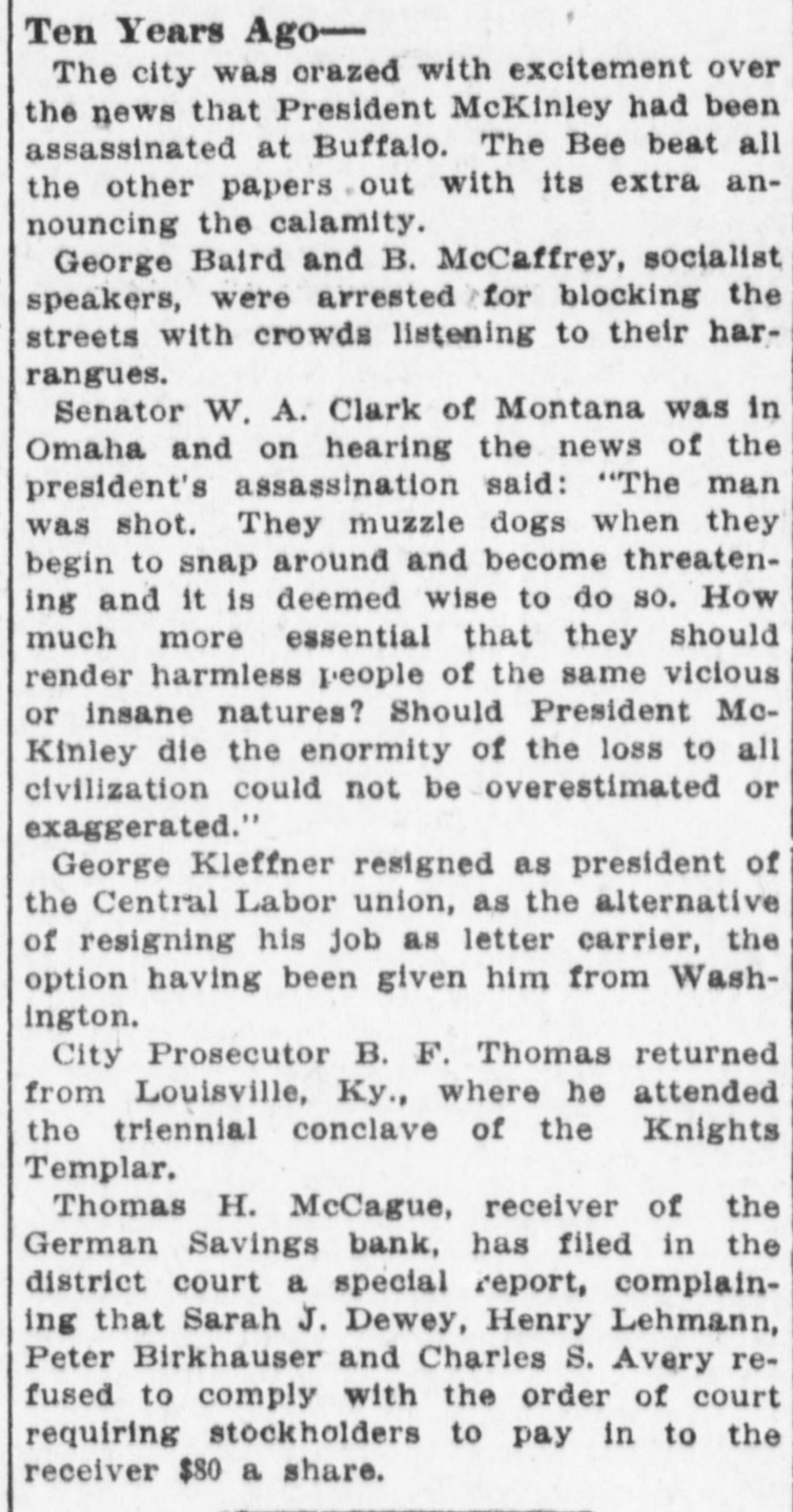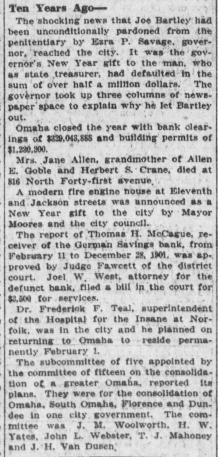 Ten Years AgoThe shocking news that Joe Bartley had been unconditionally pardoned from the penitentiary by Ezra P. Savage, governor, reached the city. It was the governor's New Year gift to the man, who as state treasurer, had defaulted in the sum of over half a million dollars. The governor took up three columns of newspaper space to explain why he let Bartley out. Omaha closed the year with bank clearings of $329,043,888 and building permits of $1,230,300. Mrs. Jane Allen, grandmother of Allen E. Goble and Herbert S. Crane, died at 816 North Forty-first avenue. A modern fire engine house at Eleventh and Jackson streets was announced as a New Year gift to the city by Mayor Moores and the city council. The report of Thomas H. McCague, receiver of the German Savings bank, from February 11 to December 28, 1901, was approved by Judge Fawcett of the district court. Joel W. West, attorney for the defunct bank, filed a bill in the court for $3,500 for services. Dr. Frederick F. Teal, superintendent of the Hospital for the Insane at Norfolk, was in the city and he planned on returning to Omaha to reside permanently February 1. The subcommittee of five appointed by the committee of fifteen on the consolidation of a greater Omaha, reported its plans. They were for the consolidation of Omaha, South Omaha, Florence and Dundee in one city government. The committee was J. M. Woolworth, H. W. Yates, John L. Webster, T. J. Mahoney and J. H. Van Dusen,