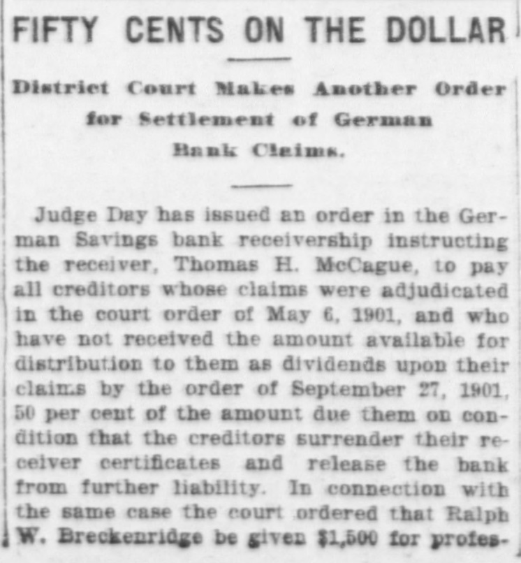 # FIFTY CENTS ON THE DOLLAR District Court Makes Another Order for Settlement of German Bank Claims. Judge Day has issued an order in the Ger- man Savings bank receivership instructing the receiver, Thomas H. McCague, to pay all creditors whose claims were adjudicated in the court order of May 6, 1901, and who have not received the amount available for distribution to them as dividends upon their claims by the order of September 27, 1901, 50 per cent of the amount due them on con- dition that the creditors surrender their re- ceiver certificates and release the bank from further liability. In connection with the same case the court ordered that Ralph W. Breckenridge be given $1,500 for profes-
