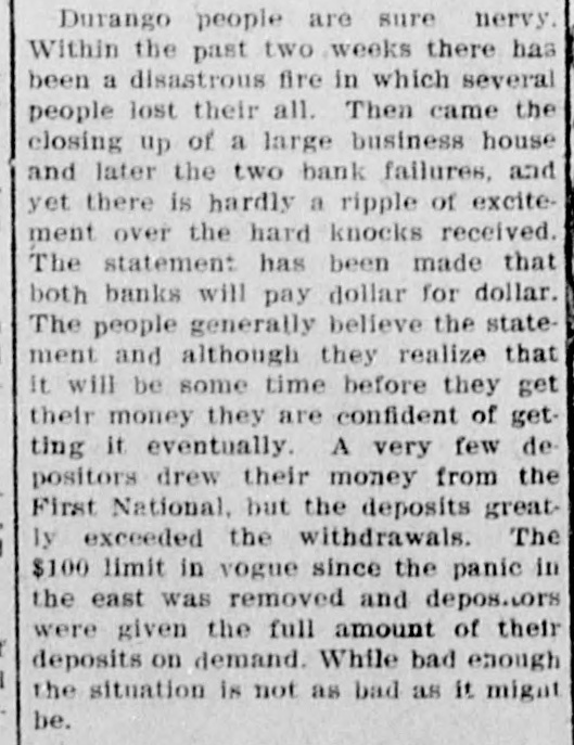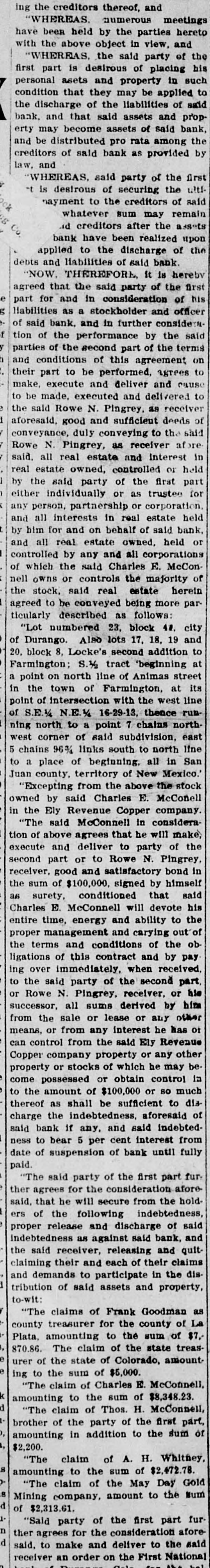 ing the creditors thereof, and "WHEREAS. numerous meetings hereto been held by the parties and have with the above object in view, of "WHEREAS, the said party the his part is desirous of placing in such / personal first asets and property to condition that they may be applied of said discharge of the liabilities propthe and that said assets and bank, bank. become assets of said the erty be may distributed pro rata among by and creditors of said bank as provided law. and WHEREAS. said party of the util first -t desirous of securing the said 4 is payment to the creditors remain of & whatever sum may C creditors after the assets d have been realized upon the applied to the bank discharge bank. of and liabilities of said debts "NOW, THEREFORM it is the hereby first e that the said party of of and in g as a stockholder liabilities agreed part for consideration and considers- officer his f said bank. and in further the y of tion of the performance of by the terms said h parties of the second part agreement on conditions of this to and part to be performed, and agrees cause to their execute and deliver delivered make, made. executed and receiver to be said Rowe N. Pingrey. as deeds of aforesaid, the good and sufficient the said conveyance, duly conveying to af pre N. Pingrey, as receiver interest in Rowe all real estate and held said. estate owned, controlled first or part real the said party of the trustee for by individually or as corporation. either partnership or estate held any person, interests in real bank. and all for and on behalf of said held or by him estate owned, and all real any and all corporations controlled the by said Charles E. McCon- of of nell which owns or controls the estate majority herein the stock, said real being more paragreed to be conveyed follows: city ticularly described as 41. numbered 23. block 19 and "Lot Also lots 17. 18. to of Durango. block 8, Locke's second 'beginning addition 20. S.1/2 tract street Farmington; north line of Animas at its a point on town of Farmington, west line in the of intersection with the thence runpoint N.E.1/4 16-29-13, north. of S.E.1 to a point 7 chains east ning north corner of said subdivision, north line west 96% links south to in San 5 chains of beginning. all to a place territory of New Mexico. stock Juan "Excepting county. from the above McConell the by said Charles E. company owned in Ely Revenue Copper considerathe said McConnell in make, "The of above agrees that he party will of the execute Rowe N. tion and deliver to Pingrey, second part or to bond in good and satisfactory himself receiver, of $100,000. signed that by said his the sum conditioned devote as surety, McConnell will to the Charles E. energy and ability out of entire time, management and carying the ob proper and conditions and of by pay the terms of this contract received. ligations immediately. when second part, ing the over said party of the receiver, or his to Rowe N. Pingrey, derived by him successor. lease or or all sums any other from the sale or interest he has of means, or from any the said Ely Revenue other can control from property or any or control Copper company stocks of which he may be in property possessed or obtain or so much come amount of $100,000 to dia of to the as shall be sufficient aforesaid thereof the indebtedness, indebtedcharge any, and said from said bank if cent interest fully date ness of to suspension bear 5 per of bank until furpaid. said party of consideration afor the first part "The agrees for the from the hold ther that he will secure indebtedness, said. of the following discharge of said proper ers release and against said bank, and indebtedness receiver, as releasing their and claims quitthe said their and each of in the dis. claiming demands to participate property, tribution and of said assets and to-wit: claims of Frank county Goodman of "The treasurer for the the sum of $7. county Plata, amounting to of the state trease of the $5,000. 870.86. The state claim of Colorado. amount K urer ing to the claim sum of of Charles of E. McConnell. $8,348.23. d 1amounting "The to the Thos. sum H. McConnell, "The claim of of the first part, , in amounting 3, brother of the addition party to the sum of Whitney, 8 $2,200. "The claim of sum A. of H. $2,472.78. b 8 amounting to the May Day Gold d of $2,313.61. 1 Mining "The company, claim of the amount to the sum fur n party of the first part afore d "Said agrees for the consideration deliver to the said receiver said. an order on the - the ther to make and First National