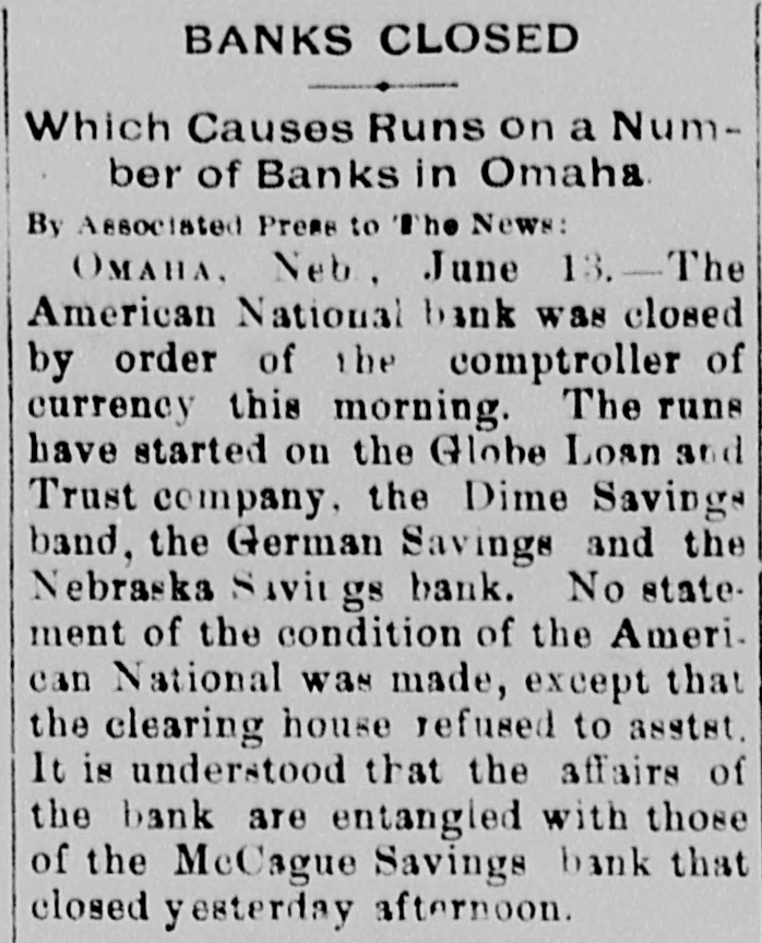 BANKS CLOSED Which Causes Runs on a Number of Banks in Omaha By Associated Prese to The News: OMAHA. Neb. June 13. The American National bank was closed by order of the comptroller of currency this morning. The runs have started on the Globe Loan and Trust company, the Dime Savings band, the German Savings and the Nebraska Savings bank. No state. ment of the condition of the Ameri. can National was made, except that the clearing house refused to asstst. It is understood that the affairs of the bank are entangled with those of the McCague Savings bank that closed yesterday afternoon.
