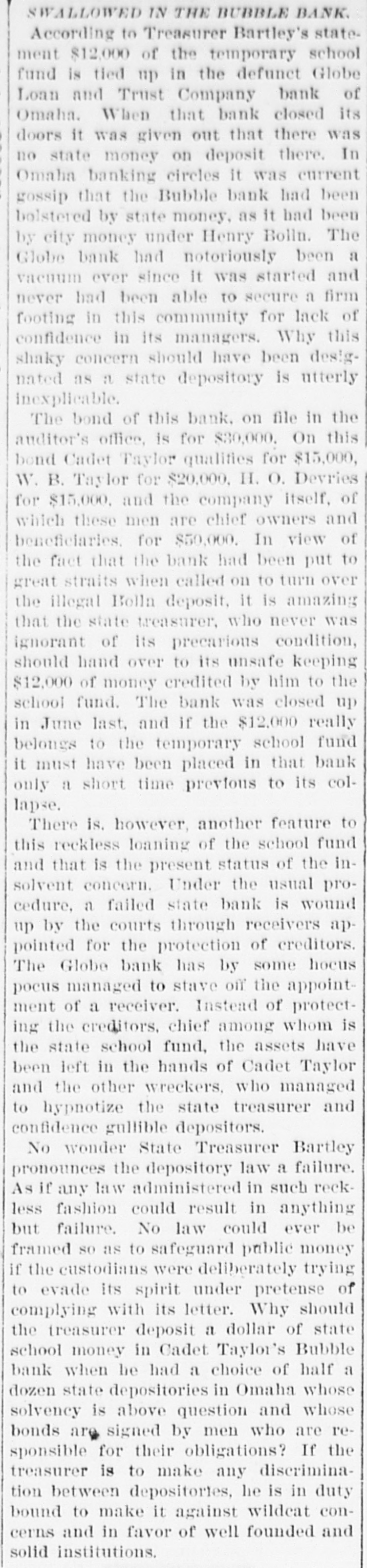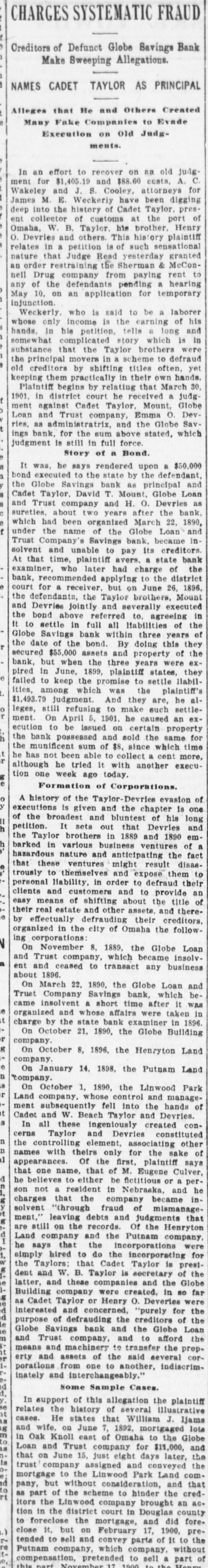 CHARGES SYSTEMATIC FRAUD Creditors of Defunct Globe Savings Bank Make Sweeping Allegations. NAMES CADET TAYLOR AS PRINCIPAL Alleges that He and Others Created Many Fake Companies to Evade Execution on Old Judgments. In an effort to recover on an old judgment for $1,405.19 and $88.60 costs, A. C. Wakeley and J. S. Cooley, attorneys for James M. E. Weckerly have been digging deep into the history of Cadet Taylor, present collector of customs at the port of Omaha, W. B, Taylor. his brother, Henry O. Devries and others. This history plaintiff relates in a petition is of such sensational nature that Judge Read yesterday granted an order restraining the Sherman & McConnell Drug company from paying rent to any of the defendants pending a hearing May 10, on an application for temporary injunction. Weckerly, who is said to be a laborer whose only income is the earning of his hands, in his petition, tells a long and somewhat complicated story which is in substance that the Taylor brothers were the principal movers in a scheme to defraud old creditors by shifting titles often, yet keeping them practically in their own hands. Plaintiff begins by relating that March 30, 1901, in district court he received a judgment against Cadet Taylor, Mount, Globe Loan and Trust company, Emma O. Devries, as administratrix, and the Globe Savings bank, for the sum above stated, which judgment is still in full force. Story of a Bond. It was, he says rendered upon a $50,000 bond executed to the state by the defendant, the Globe Savings bank as principal and Cadet Taylor, David T. Mount, Globe Loan and Trust company and H. O. Devries as sureties, about two years after the bank, which had been organized March 22, 1890, under the name of the Globe Loan and Trust Company's Savings bank, became insolvent and unable to pay its creditors. At that time, plaintiff avers, a state bank examiner, who later had charge of the bank, recommended applying to the district court for a receiver, but on June 26, 1896, the defendants, the Taylor brothers, Mount and Devries jointly and severally executed the bond above referred to, agreeing in It to settle in full all Habilities of the Globe Savings bank within three years of the date of the bond. By doing this they secured $55,000 assets and property of the bank, but when the three years were expired in June, 1899, plaintiff states, they failed to keep the promise to settle liabilities, among which was the plaintiff's $1,493.79 judgment. And they are, he alleges, still refusing to make such settlement. On April 5, 1901. he caused an execution to be issued on certain property the bank possessed and sold the same for the munificent sum of $8, since which time he has not been able to collect a cent more, although he tried it with another execution one week ago today. Formation of Corporations. A history of the Taylor-Devries evasion of executions is given and the chapter is one of the broadest and bluntest of his long petition. It sets out that Devries and the Taylor brothers in 1889 and 1890 embarked in various business ventures of a hazardous nature and anticipating the fact that these ventures might result disastrously to themselves and expose them to personal liability, in order to defraud their clients and customers and to provide an easy means of shifting about the title of their real estate and other assets, and thereby effectually defrauding their creditors, organized in the city of Omaha the following corporations: On November 8, 1889, the Globe Loan and Trust company, which became insolvent and ceased to transact any business about 1896. On March 22, 1890, the Globe Loan and Trust Company Savings bank, which became insolvent a short time after it was organized and whose affairs were taken in charge by the state bank examiner in 1896. On October 21, 1890, the Globe Building company On October 8, 1896, the Henryton Land company. On January 14, 1898, the Putnam Land tompany. On October 1, 1890, the Linwood Park Land company, whose control and management subsequently fell into the hands of Cadet and W. Beach Taylor and Devries. In all these ingeniously created concerns Taylor and Devries constituted the controlling element, associating other names with theirs only for the sake of appearances. Of the first, plaintiff says that one name, that of M. Eugene Culver, he believes to either be fictitious or a person not a resident in Nebraska, and he charges that the company became insolvent "through fraud of mismanagement," leaving debts and judgments that are still on the records. Of the Henryton Land company and the Putnam company, he says that the incorporations were simply hired to do the incorporating for the Taylors: that Cadet Taylor is prestdent and W. B. Taylor is secretary of the latter, and these companies and the Globe Building company were created, in 80 far as Cadet Taylor or Henry O. Deveries were interested and concerned, "purely for the purpose of defrauding the creditors of the Globe Savings bank and the Globe Loan and Trust company, and to afford the means and machinery to transfer the property and assets of the said several corporations from one to another, indiscriminately and interchangeably.' Some Sample Cases. In support of this allegation the plaintiff relates the history of several illustrative cases. He states that William J. Ijams and wife, on June 7, 1892, mortgaged lots in Oak Knoll east of Omaha to the Globe Loan and Trust company for $11,000, and that on June 15, just eight days later, the trust company assigned and conveyed the mortgage to the Linwood Park Land company, but without consideration, and that as part of the scheme to hinder the creditors the Linwood company brought an ac. tion in the district court in Douglas