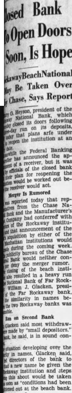 Closed Bank Doors Soon, Is Hope May Be Taken Over by Chase, Says Report Harry Heyson, president of the National Bank, which closed its doors following three-day its deposits, today that plans under reopen the institution at an date. Meanwhile the Federal Banking Controller has announced the appointment receiver, but by officials of the closed bank plan for reopening the would worked out bethe receiver would act. Merger Is Rumored was reported today that esentatives from Chase Bank and the Manufacturer's Company had conferred with lirectors of the Rockaway instituand that of the acquisition by either the Manhattan institutions would during the week. The bureau of the Chase would neither conthe rumor. The closing the beach instialso resulted heavy run the National Bank Far RockWilliam Glacken, presiof the Far Rockaway bank, the in names bethe two Rockaway banks was esponsible. Run on Second Bank Mr. Glacken said most withdrawwere made by "small depositors." bank, he said, in sound conThe situation developing over the imilarity names, Glacken said, led directors of the bank that new name be given the Rockaway institution steps bring this about would be taken conditions had been traightened out at the beach bank.