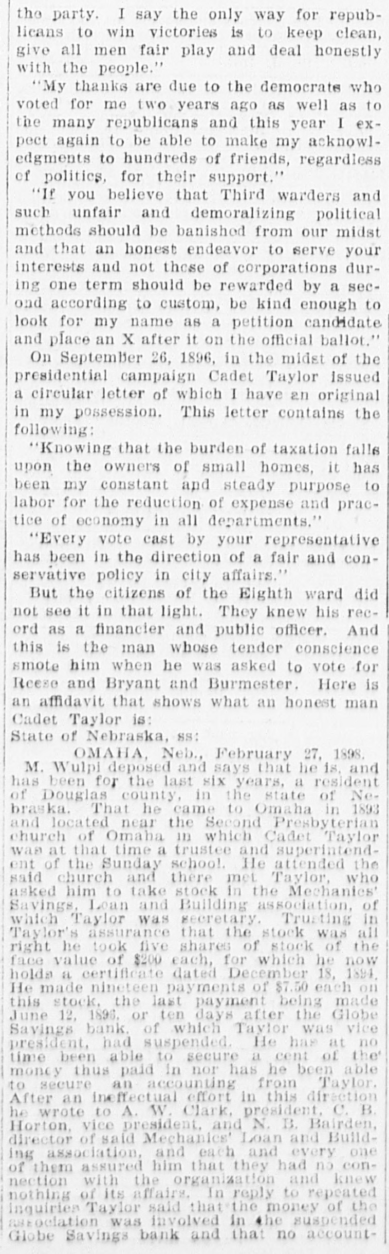 the party. I say the only way for republicans to win victories is to keep clean, give all men fair play and deal honestly with the people." "My thanks are due to the democrate who voted for me two years ago as well as to the many republicans and this year I expect again to be able to make my acknowledgments to hundreds of friends, regardless of politics, for their support." "If you believe that Third warders and such unfair and demoralizing political methods should be banished from our midst and that an honest endeavor to serve your interests and not these of corporations during one term should be rewarded by a second according to custom, be kind enough to look for my name as a petition candidate and place an X after it on the official ballot." On SeptemBer 26, 1896, in the midst of the presidential campaign Cadet Taylor issued a circular letter of which I have an original in my possession. This letter contains the following: "Knowing that the burden of taxation falls upon the owners of small homes, it has been my constant and steady purpose to labor for the reduction of expense and practice of economy in all departments." "Every vote cast by your representative has been in the direction of a fair and conservative policy in city affairs." But the citizens of the Eighth ward did not see it in that light. They knew his record as a financier and public officer. And this is the man whose tender conscience smote him when he was asked to vote for Reese and Bryant and Burmester. Here is an affidavit that shows what an honest man Cadet Taylor is: State of Nebraska, SS: OMAHA, Neb., February 27, 1898. M. Wulpi deposed and says that he is, and has been for the last six years, a resident of Douglas county, in the state of Nebraska. That he came to Omaha in 1893 and located near the Second Presbyterian church of Omaha ID which Cadet Taylor was at that time a trustee and superintendent of the Sunday school. He attended the said church and there met Taylor, who asked him to take stock in the Mechanics' Savings, Loan and Building association, of which Taylor was secretary. Trusting in Taylor's assurance that the stock was all right he took five shares of stock of the face value of $200 each, for which he now holds a certificate dated December 18, 1894, He made nineteen payments of $7.50 each on this stock, the last payment being made June 12, 1896. or ten days after the Globe Savings bank. of which Taylor was vice president, had suspended. He has at no time been able to secure a cent of the money thus paid in nor has he been able to secure an accounting from Taylor. After an ineffectual effort in this direction he wrote to A. W. Clark, president, C. B. Horton, vice president, and N. B. Bairden, director of said Mechanics' Loan and Building association, and each and every one of them assured him that they had no connection with the organization and knew nothing of its affairs. In reply to repeated inquiries Taylor said that the money of the association was involved in the suspended Globe Savings bank and that no account-