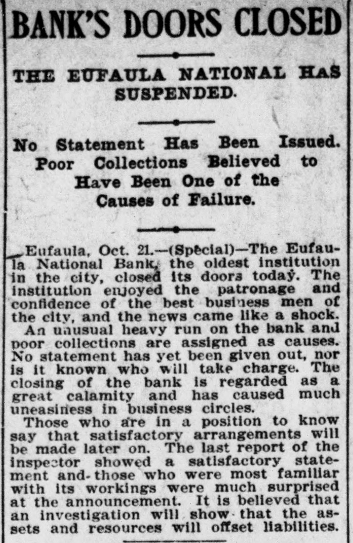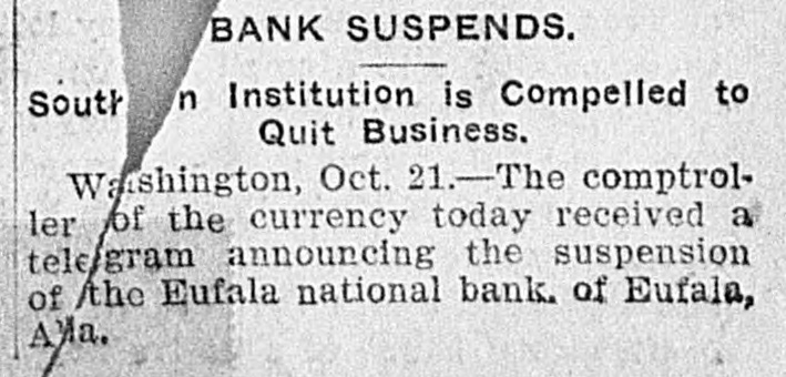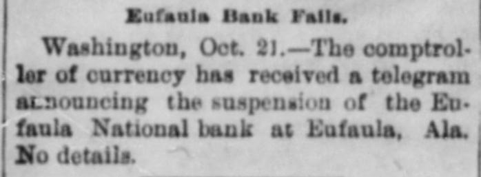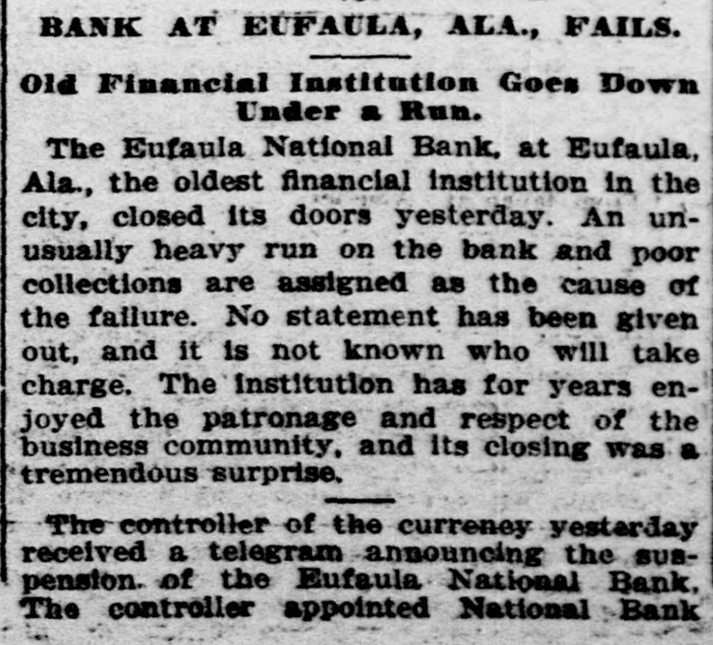 BANK AT EUFAULA, ALA., FAILS. Old Financial Institution Goes Down Under a Run. The Eufaula National Bank, at Eufaula, Ala., the oldest financial institution in the city, closed its doors yesterday. An unusually heavy run on the bank and poor collections are assigned as the cause of the failure. No statement has been given out, and it is not known who will take charge. The institution has for years enjoyed the patronage and respect of the business community, and its closing was a tremendous surprise. The controller of the currency yesterday received a telegram announcing the SUBpension. of the Eufaula National Bank, The controller appointed National Bank
