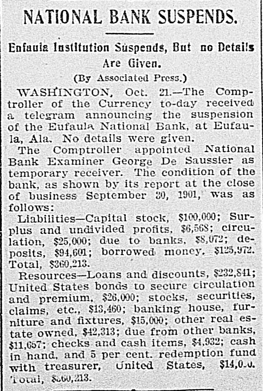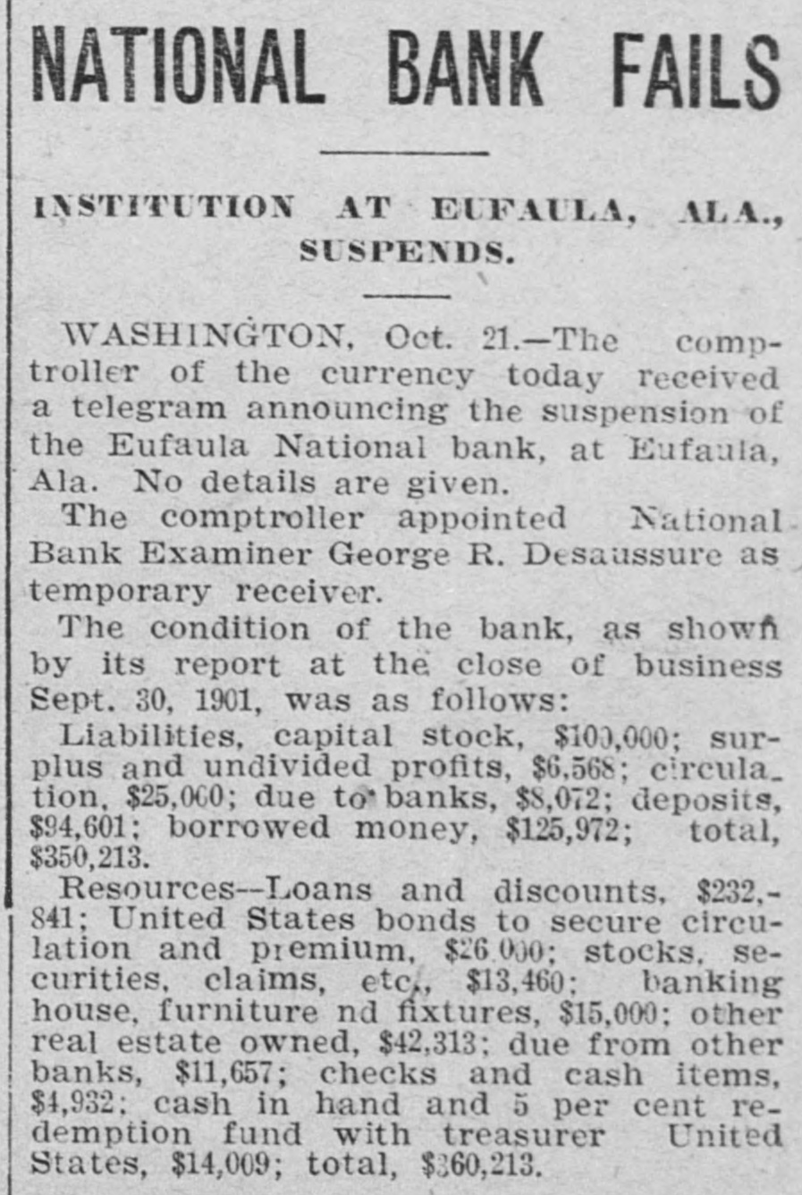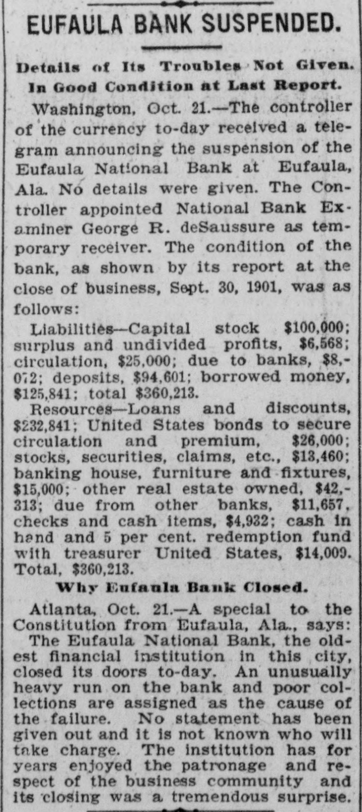 NATIONAL BANK FAILS INSTITUTION AT EUFAULA, ALA., SUSPENDS. WASHINGTON, Oct. 21.-The comptroller of the currency today received a telegram announcing the suspension of the Eufaula National bank, at Eufaula, Ala. No details are given. The comptroller appointed National Bank Examiner George R. Desaussure as temporary receiver. The condition of the bank, as shown by its report at the close of business Sept. 30, 1901, was as follows: Liabilities, capital stock, $100,000; surplus and undivided profits, $6,568; circula_ tion, $25,000; due to banks, $8,072; deposits, $94,601: borrowed money, $125,972; total, $350,213. Resources-Loans and discounts, $232,841; United States bonds to secure circulation and premium, $26,000; stocks, securities, claims, etc, $13,460; banking house, furniture nd fixtures, $15,000; other real estate owned, $42,313; due from other banks, $11,657; checks and cash items, $4,932; cash in hand and 5 per cent redemption fund with treasurer United States, $14,009; total, $360,213.