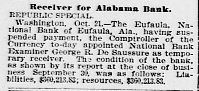 EUFAULA BANK SUSPENDED. Details of Its Troubles Not Given. In Good Condition at Last Report. Washington, Oct. 21.-The controller of the currency to-day received a telegram announcing the suspension of the Eufaula National Bank at Eufaula, Ala. No details were given. The Controller appointed National Bank Examiner George R. deSaussure as temporary receiver. The condition of the bank, as shown by its report at the close of business, Sept. 30, 1901, was as follows: Liabilities-Capital stock $100,000; surplus and undivided profits, $6,568; circulation, $25,000; due to banks, $8,072; deposits, $94,601; borrowed money, $125,841; total $360,213. Resources-Loans and discounts, $232,841; United States bonds to secure circulation and premium, $26,000; stocks, securities, claims, etc., $13,460; banking house, furniture and fixtures, $15,000; other real estate owned, $42,313; due from other banks, $11,657. checks and cash items, $4,932; cash in hand and 5 per cent. redemption fund with treasurer United States, $14,009. Total, $360,213. Why Eufaula Bank Closed. Atlanta, Oct. 21.-A special to the Constitution from Eufaula, Ala., says: The Eufaula National Bank, the oldest financial institution in this city, closed its doors to-day. An unusually heavy run on the bank and poor collections are assigned as the cause of the failure. No statement has been given out and it is not known who will take charge. The institution has for years enjoyed the patronage and respect of the business community and its closing was a tremendous surprise.