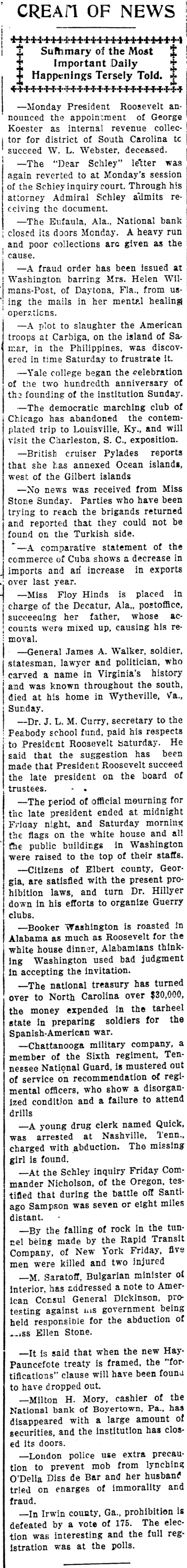 CREAM OF NEWS ++++++++++++ Summary of the Most Important Daily Happenings Tersely Told. ################ -Monday President Roosevelt of George an nounced the appointment collecKoester as internal revenue to for district of South Carolina tor succeed W. L. Webster, deceased. "Dear Schley" letter was -The to at Monday's session his again reverted Schiey inquiry court. Through admits reattorney of the Admiral Schley ceiving the document. -The Eufaula, Ala., National heavy bank run its doors Monday. A as the closed and poor collections arc given cause. fraud order has been issued Wil- at -A barring Mrs. Helen from us mans-Post, Washington of Daytona, Fla., healing ing the mails in her mental operations. plot to slaughter the American of Sa-A at Carbiga, on the island discovtroops in the Philippines, frustrate was mar, ered in time Saturday to -Yale college began the celebration of hundredth anniversary of the founding two of the institution Sunday of the -The democratic marching contem- club has abandoned the and will Chicago trip to Louisville, Ky., plated visit the Charleston, S. C., exposition. reports -British cruiser Pylades she has annexed Ocean islands, west that of the Gilbert islands No news was received from have Miss been Stone Sunday. Parties who returned to reach the brigands not be and trying reported that they could found on the Turkish side. comparative statement decrease of the in -A of Cuba shows a exports imports commerce and an increase in over last year. in Floy Hinds is placed postoffice, -Miss of the Decatur, Ala,, whose accharge her father, his resucceeding counts were mixed up, causing moval. -General James A. Walker, soldier, who lawyer and politician, history statesman, name in Virginia's south, carved a known throughout the Va. died and was at his home in Wytheville, Sunday. J. L. M. Curry, secretary respects to the Dr. school fund, paid his He Peabody President Roosevelt saturday. has been to that the suggestion succeed said President Roosevelt of made the late that president on the board for trustees. period of official mourning midnight -The late president ended at morning on Friday the white the night, and Saturday house and all the flags public buildings in Washington their staffs. the were raised to the top of Geor -Citizens of Elbert county, prosatisfied with the present Hillyer gia, are laws, and turn Dr. Guerry hibition down in his efforts to organize clubs. -Booker washington Roosevelt is roasted for the in Alabama as much as Alabamians thinkhouse dinner, judgment white Washington used bad in ing accepting the invitation. national treasury has $30,000, turned -The to North Carolina over tarheel over money expended in the for the state the in preparing soldiers Spanish-American war. a Chattanooga military company, Ten of the Sixth regiment, out nessee member National Guard, is mustered of regiof service on recommendation who show a disorganized mental condition officers, and a failure to attend drills -A young drug clerk named Quick Tenn. at Nashville, missing charged was arrested with abduction. The girl is found. the Schley inquiry Friday Oregon, Com- tes -At Nicholson, of the off Santi mander that during the battle miles tifled ago Sampson was seven or eight distant. the falling of rock in the Transit tun -By made by the Rapid Friday, five nel being of New York injured Company, killed and two of men were Saratoff, Bulgarian minister to Amer-M. has addressed a note prointerior, Consul General Dickinson, being ican HIS government of held testing responsible against for the abduction LESS Ellen Stone. is said that when the new the Hay "for -It treaty is framed, found tifications" Pauncefote clause will have been have dropped out. the of to H. Mory, cashier Pa., has -Milton bank of Boyertown, amount of National with a large clos disappeared securities, and the institution has ed its doors. police use extra lynching precau -London to prevent mob from her husband tried O'Della tion on Diss enarges de Bar of and immorality and fraud. Irwin county, Ga., 175. prohibition The elec- is -In by a vote of the full reg defeated was interesting and tion istration was at the polls.