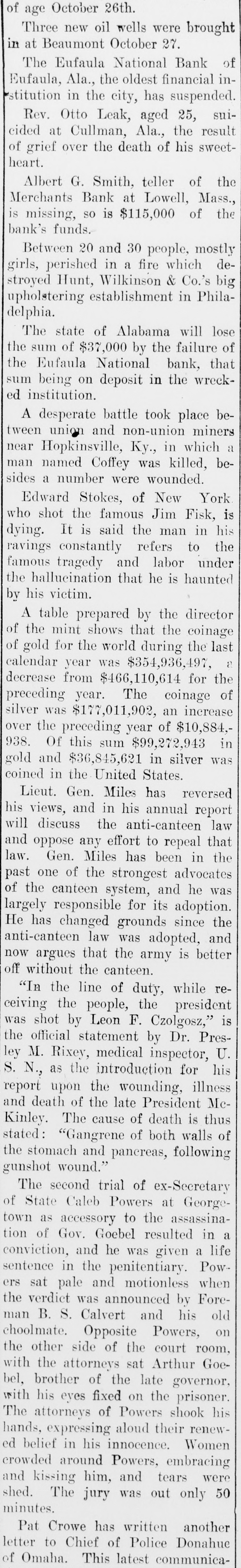 of age October 26th. Three new oil wells were brought in at Beaumont October 27. The Eufaula National Bank of Eufaula, Ala., the oldest financial institution in the city, has suspended. Rev. Otto Leak, aged 25, suicided at Cullman, Ala., the result of grief over the death of his sweetheart. Albert G. Smith, teller of the Merchants Bank at Lowell, Mass., is missing, SO is $115,000 of the bank's funds. Between 20 and 30 people, mostly girls, perished in a fire which destroyed Hunt, Wilkinson & Co.'s big upholstering establishment in Philadelphia. The state of Alabama will lose the sum of $37,000 by the failure of the Eufaula National bank, that sum being on deposit in the wrecked institution. A desperate battle took place beand Ky., a near tween Hopkinsville, union non-union in which miners beman named Coffey was killed, sides a number were wounded. Edward Stokes, of New York who shot the famous Jim Fisk, is dying. It is said the man in his ravings constantly refers to the famous tragedy and labor under the hallucination that he is haunted by his victim. A table prepared by the director of the mint shows that the coinage of gold for the world during the last calendar year was $354,936,497, a decrease from $466,110,614 for the preceding year. The coinage of silver was $177,011,902, an increase over the preceding year of $10,884,938. Of this sum $99,272,943 in gold and $36,845,621 in silver was coined in the United States. Lieut. Gen. Miles has reversed his views, and in his annual report will discuss the anti-canteen law and any effort to repeal that oppose in the law. Gen. Miles has been past one of the strongest advocates of the canteen system, and he was largely responsible for its adoption. He has changed grounds since the anti-canteen law was adopted, and now argues that the army is better off without the canteen. "In the line of duty, while receiving the people, the president was shot by Leon F. Czolgosz," is the official statement by Dr. Presley M. Rixey, medical inspector, U. S. N., as the introduction for his report upon the wounding, illness and death of the late President McKinley. The cause of death is thus stated: "Gangrene of both walls of the stomach and pancreas, following gunshot wound." The second trial of ex-Secretary of State Caleb Powers at Georgetown as accessory to the assassination of Gov. Goebel resulted in a conviction, and he was given a life sentence in the penitentiary. Powers sat pale and motionless when the verdict was announced by Foreman B. S. Calvert and his old choolmate. Opposite Powers, on the other side of the court room, with the attorneys sat Arthur Gocbel, brother of the late governor, with his eyes fixed on the prisoner. The attorneys of Powers shook his hands, expressing aloud their renewed belief in his innocence. Women crowded around Powers, embracing and kissing him, and tears were shed. The jury was out only 50 minutes. Pat Crowe has written another letter to Chief of Police Donahue of Omaha. This latest communica-